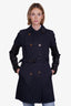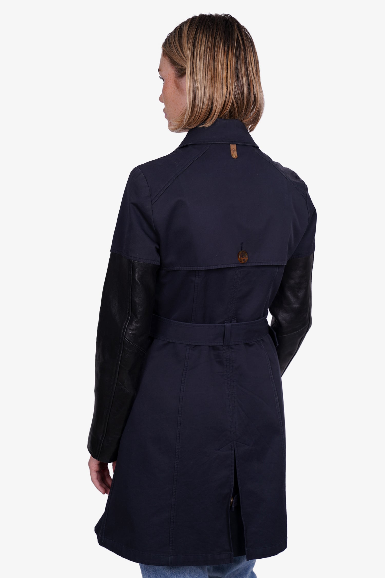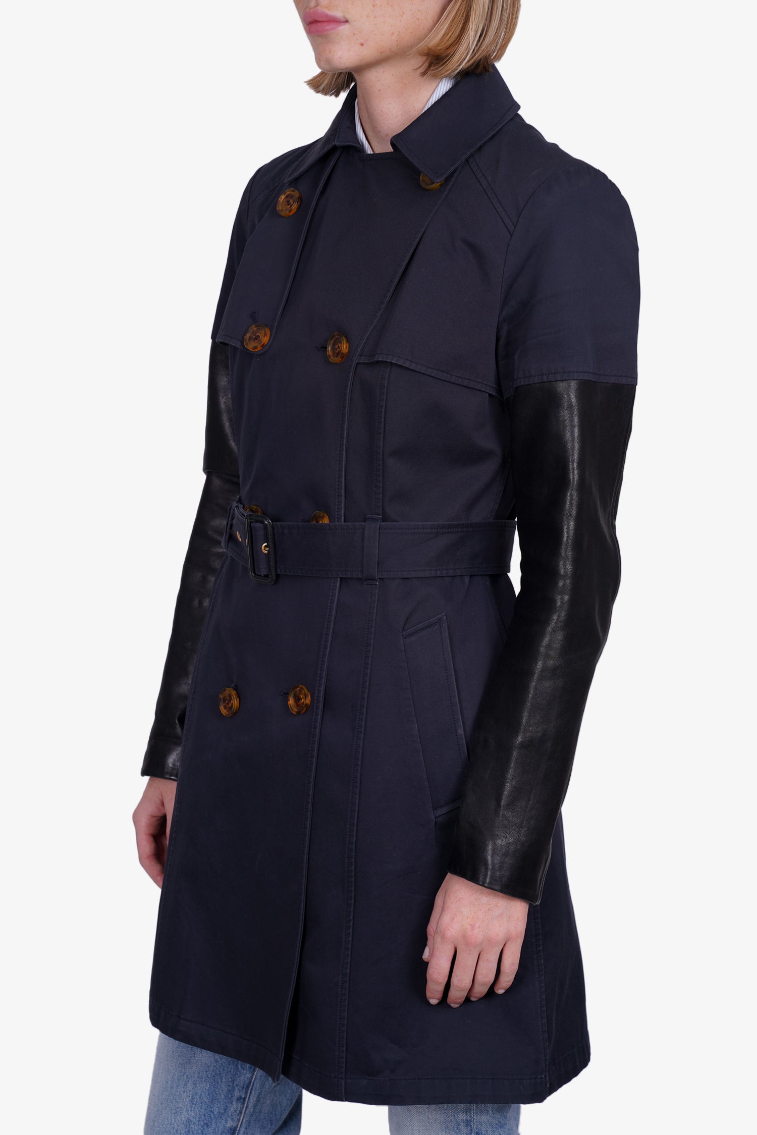 Refresh availabilityMackage Navy Cotton Belted Trench Coat. Front button closure. 2 front open pockets. Unlined. Adjustable waist belt. Contrast leather sleeves. Missing button on the top right. Tonal stitching.