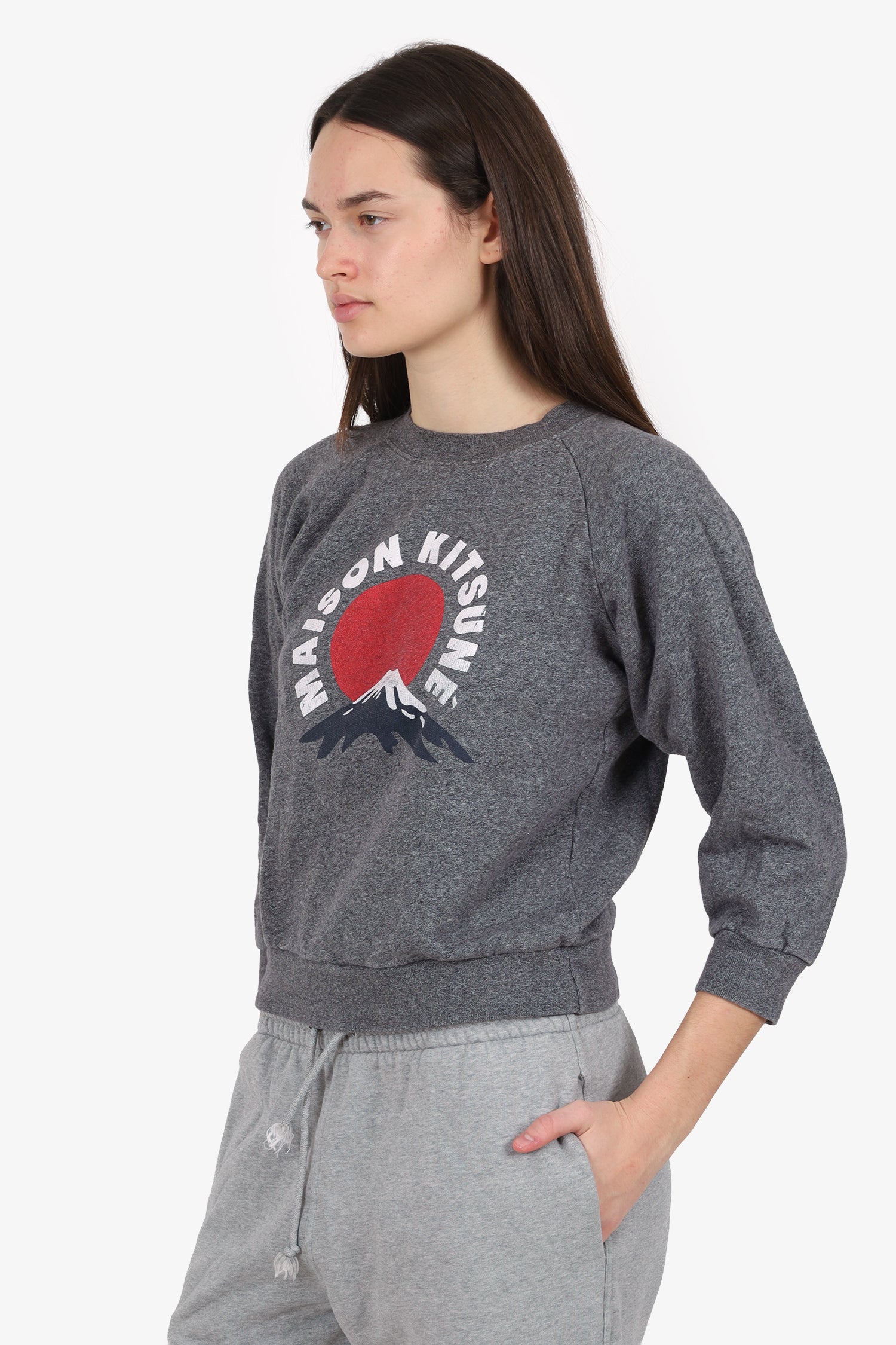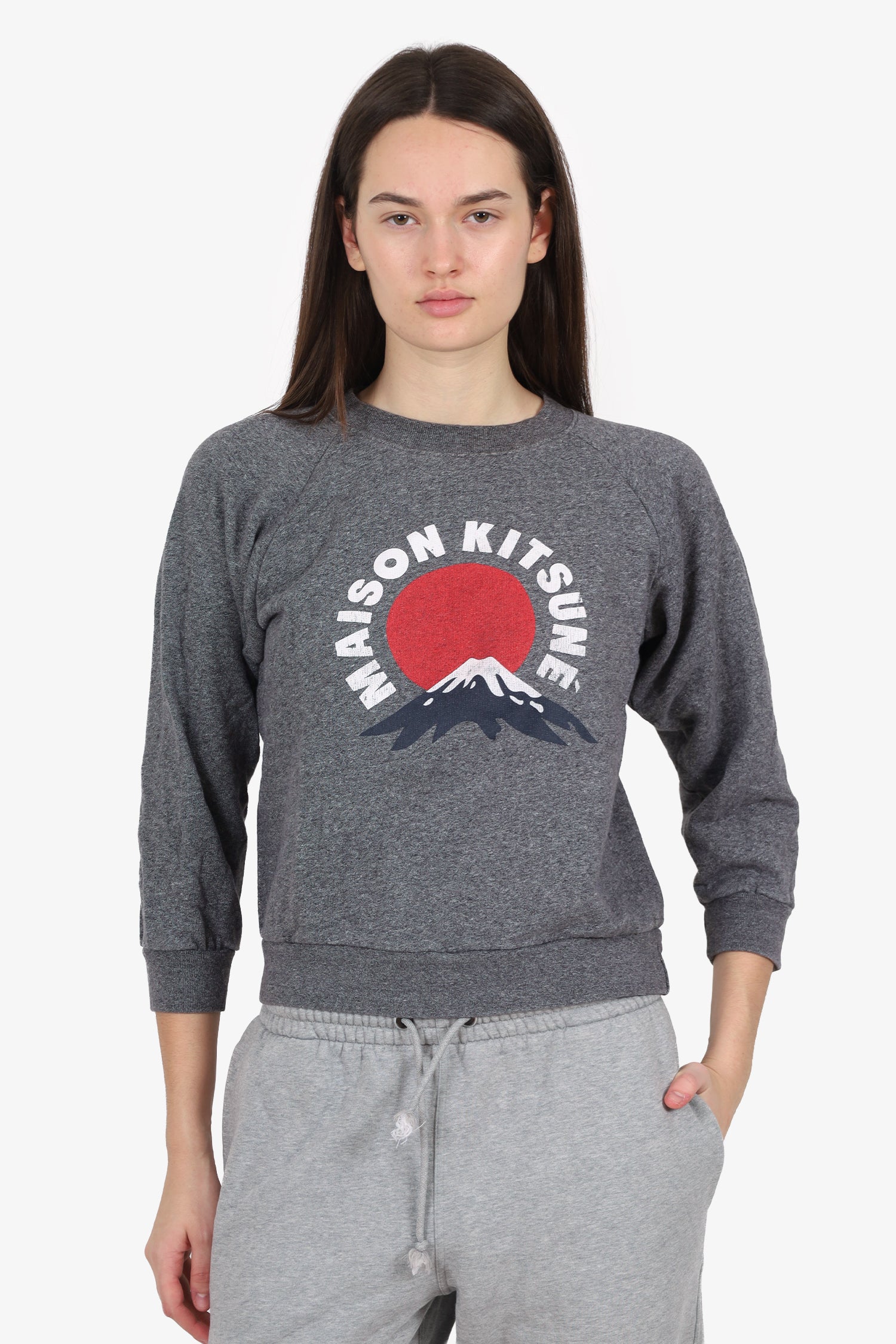 Refresh availabilityMaison Kitsune Grey Mountain Cropped Sweater. Pull-on. Round neckline. Front printed graphic. Tonal stitching.