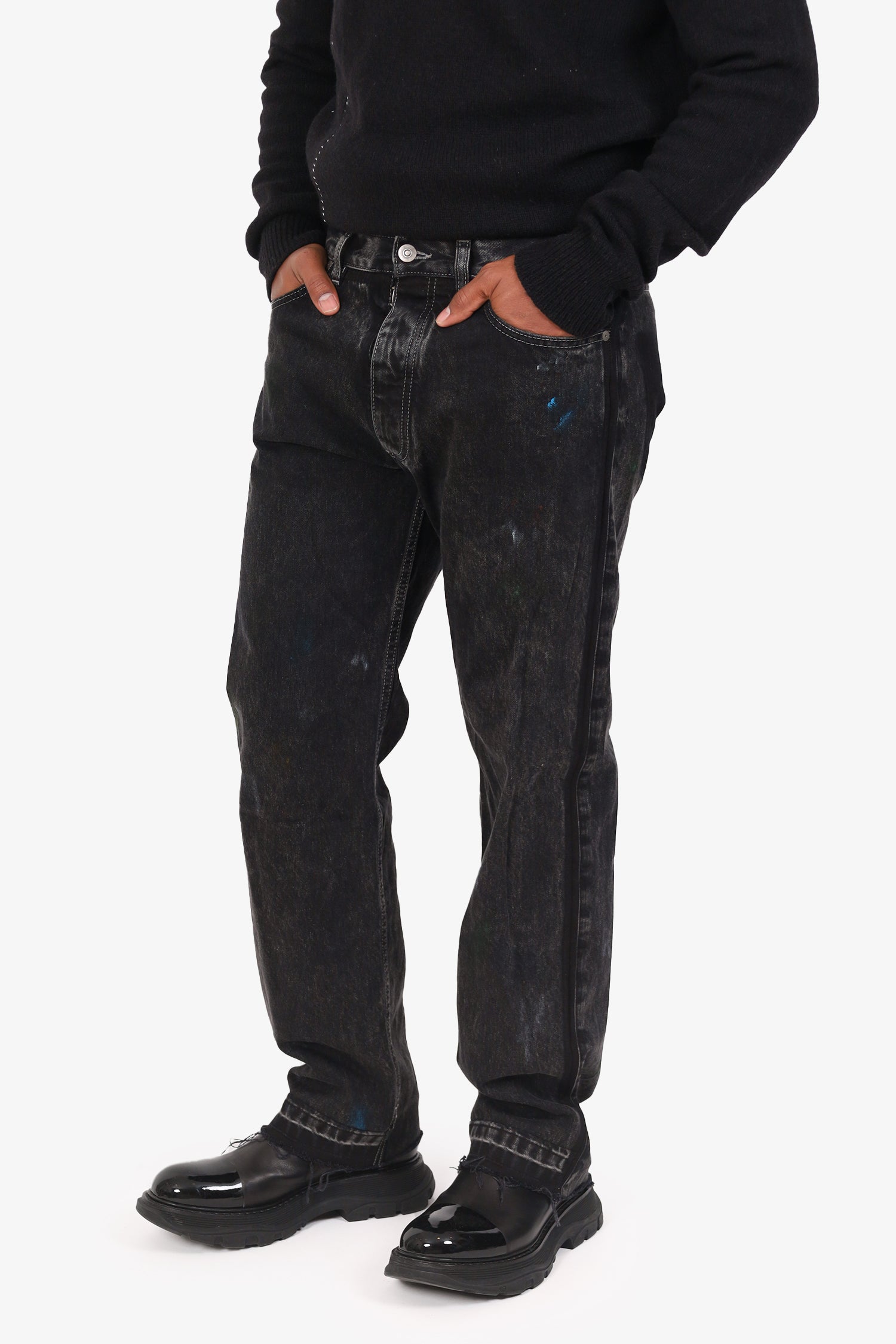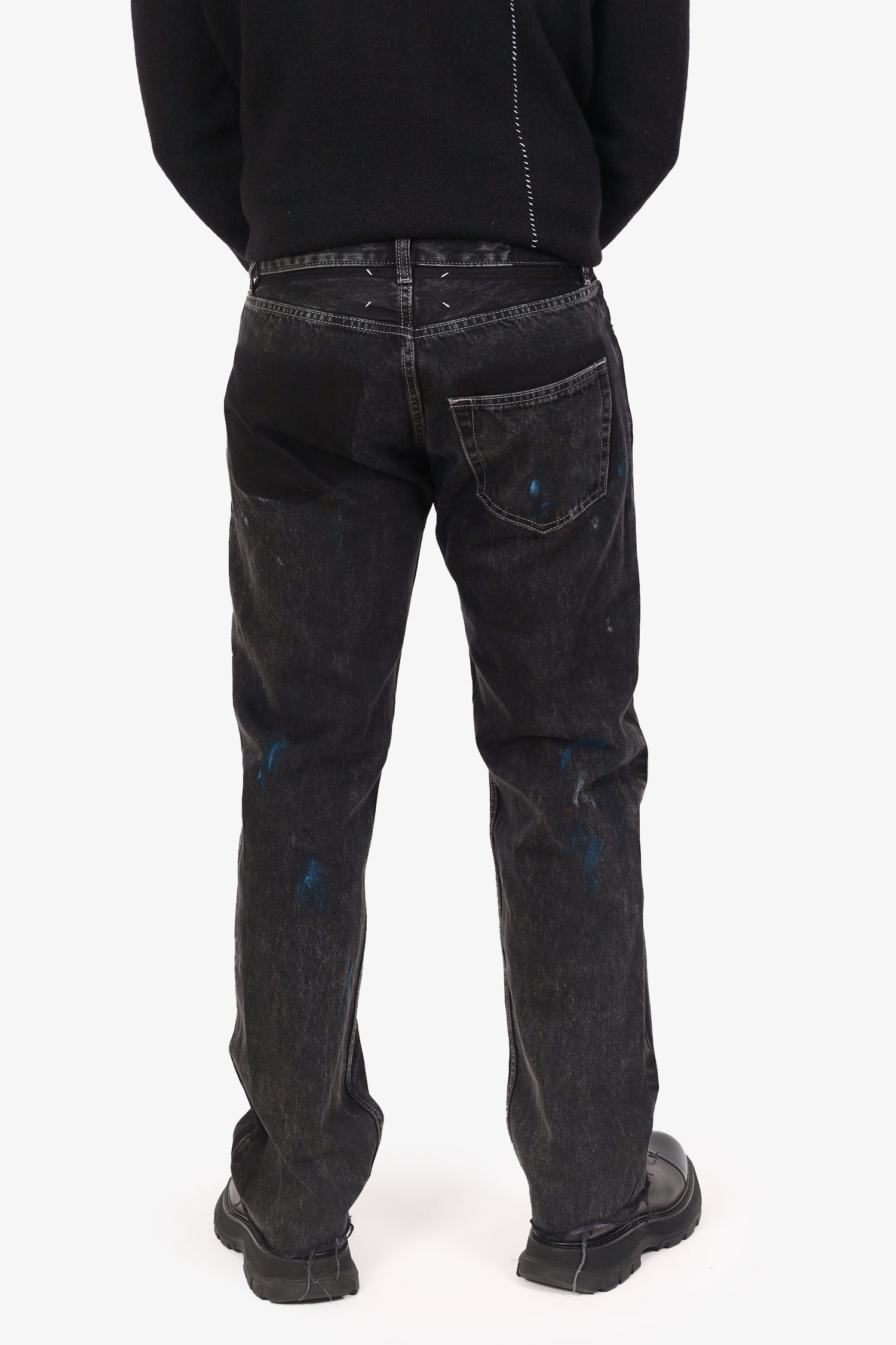 Refresh availabilityMaison Margiela Black Denim Distressed Straight Leg Jeans. Slip on. Front button-up closure. Waistband belt-loops. 5 exterior pockets; 2 front slip, 1 mini compartment, and 2 rear slip. Intentional paint-splatter design throughout. Silver-tone hardware. Contrast stitching.
