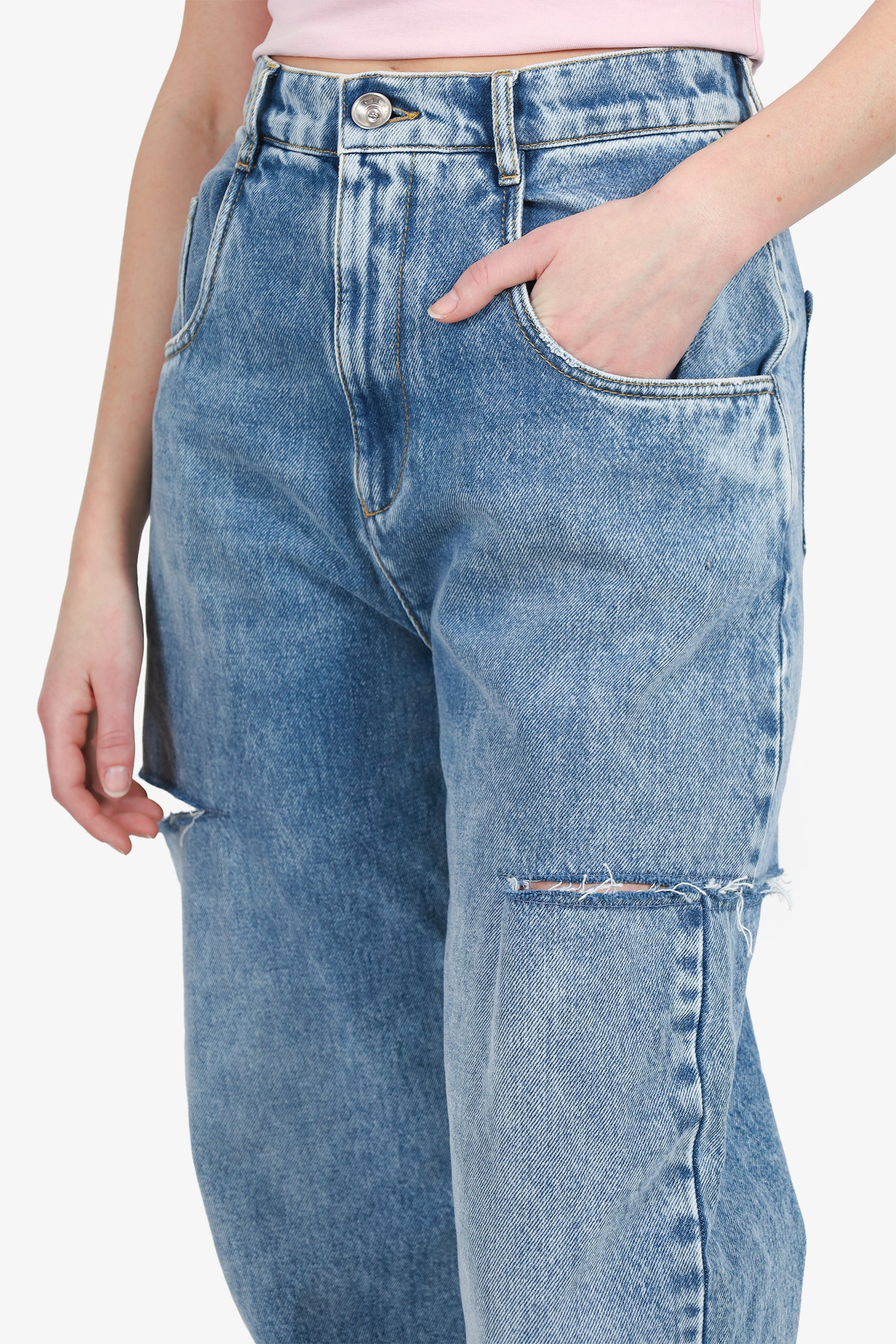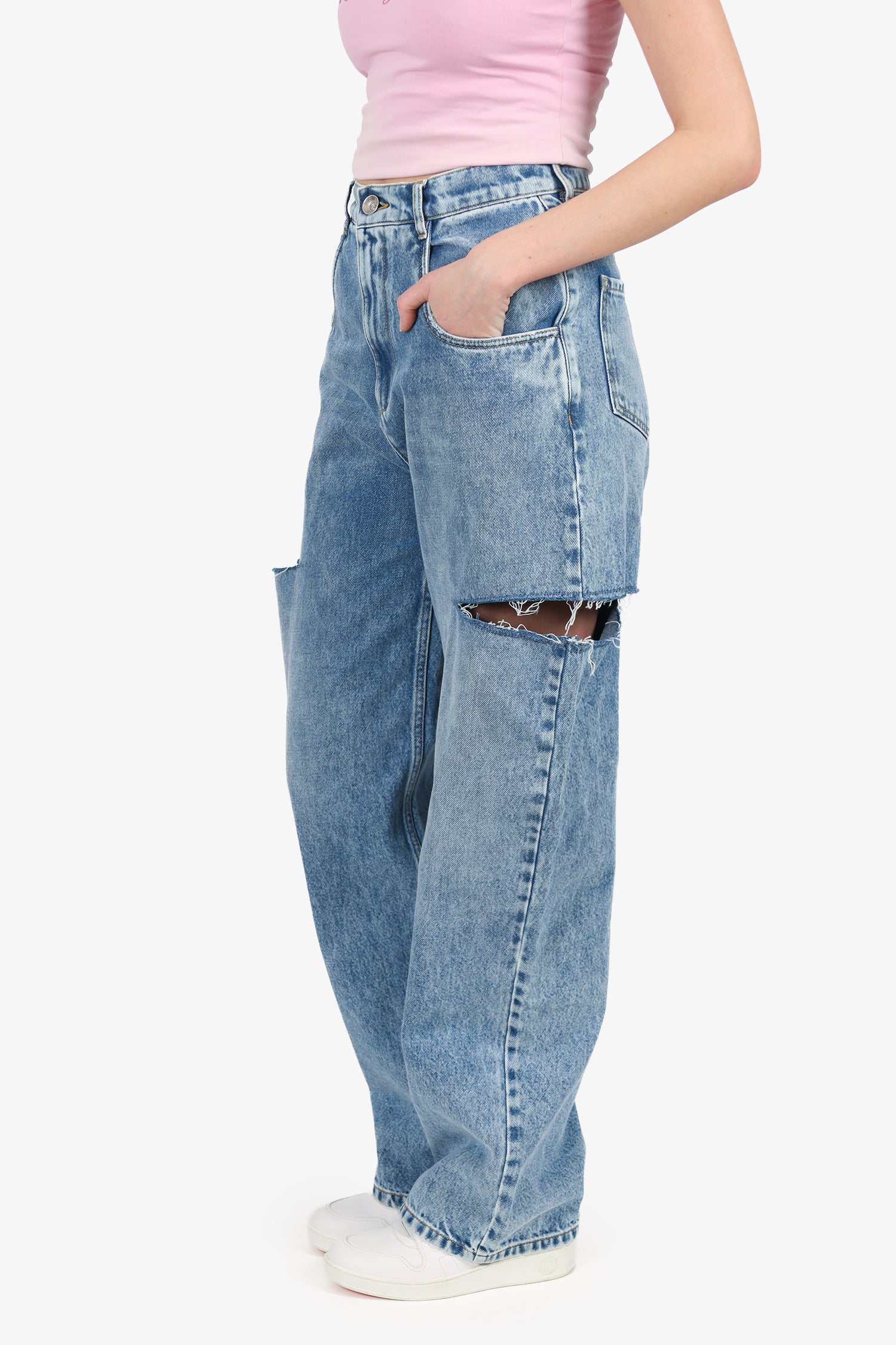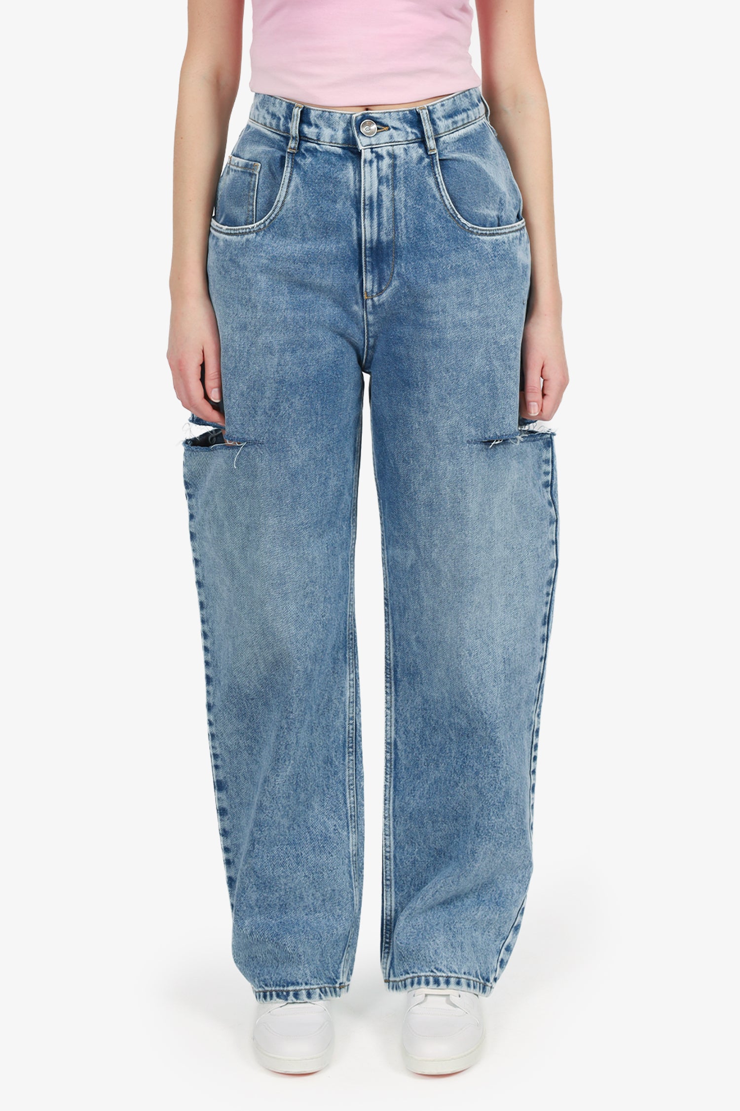 Refresh availabilityMaison Margiela Blue Denim Slashed Cut-Out Wide-Leg Jeans. Front zip with button-up closure. Waistband belt-loops. 5 exterior pockets; 2 front slip, 1 mini compartment, and 2 rear slip. Silver-tone hardware. Contrast stitching.