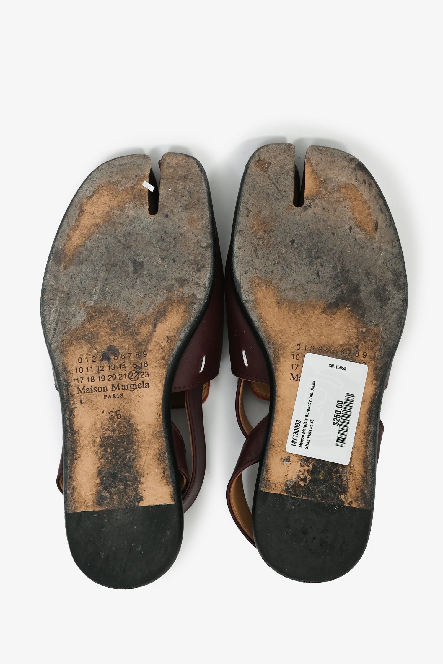 Refresh availabilityMaison Margiela Burgundy Tabi Ankle Strap Flats. Slip-on. Closed toe. Slit detail on toe box. Tonal stitching.