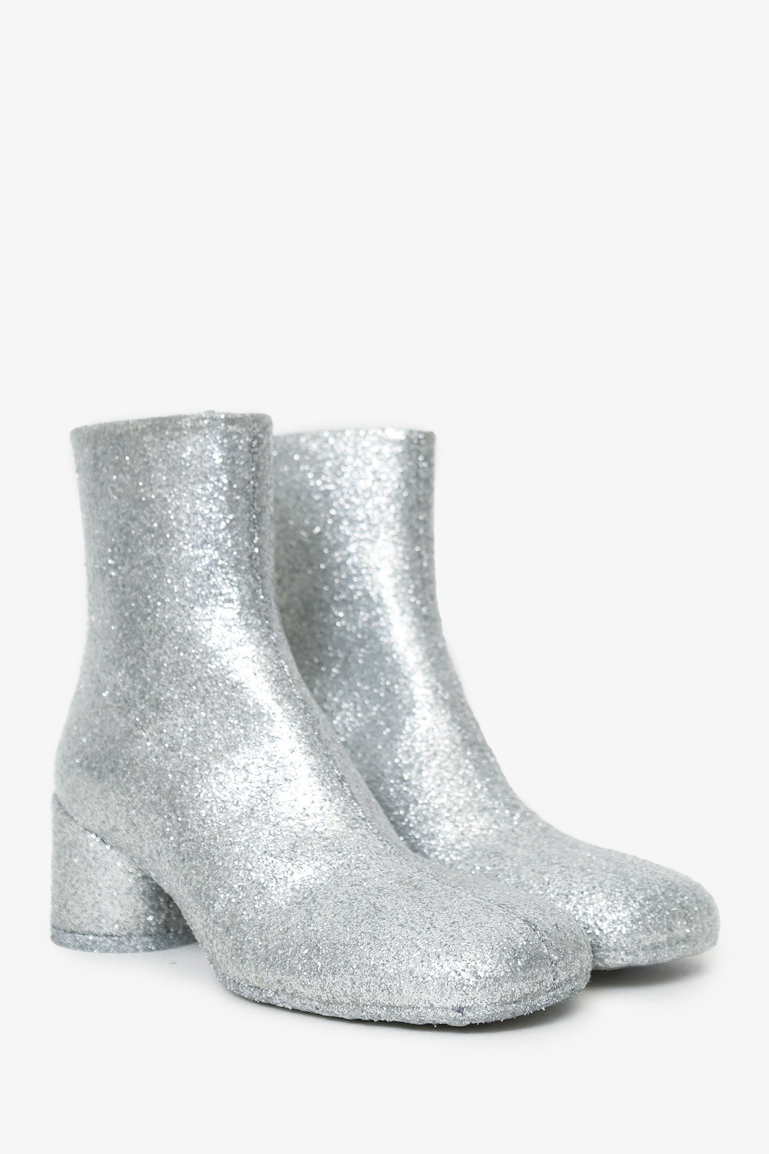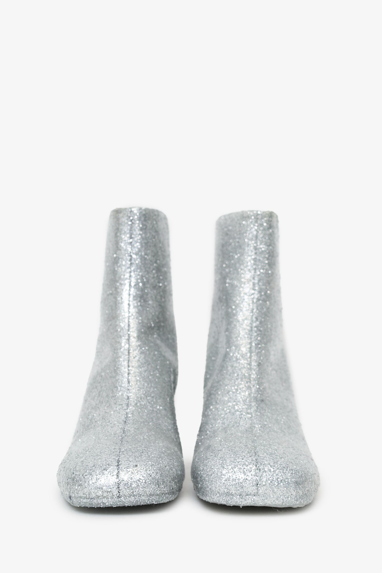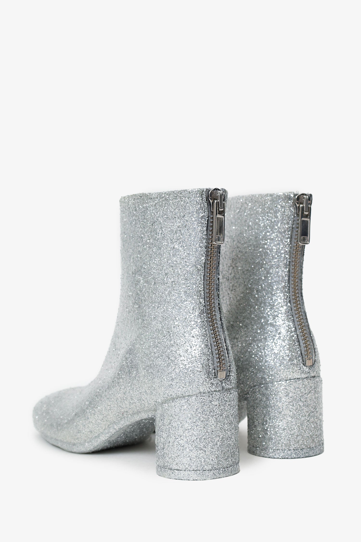 Refresh availabilityMaison Margiela MM6 Silver Glitter Square-Toe Booties. Pull on. Rear zip closure. Silver-tone hardware.