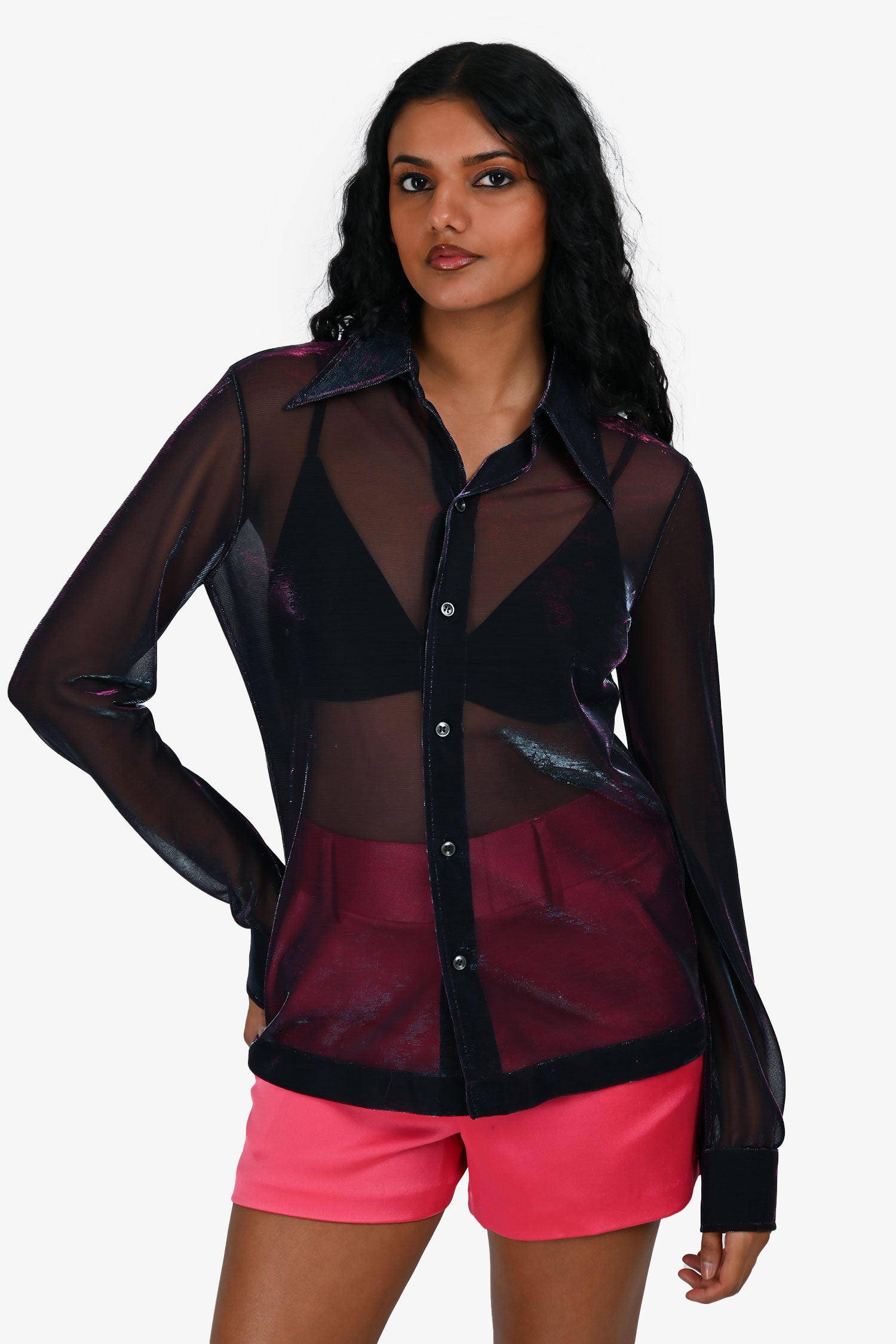 Refresh availabilityMaison Margiela Teal Iridescent Button Down Shirt. Slip-on. Pointed collar. Front button-up closure. Cuffs with button-up detail. Unlined. Tonal stitching.