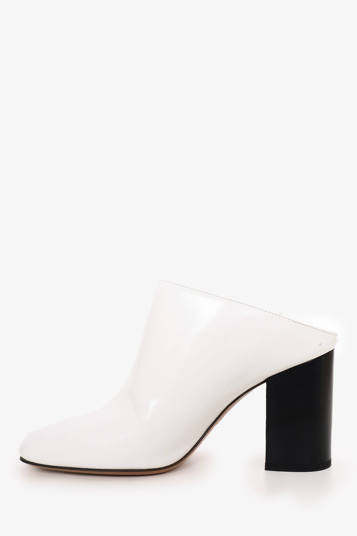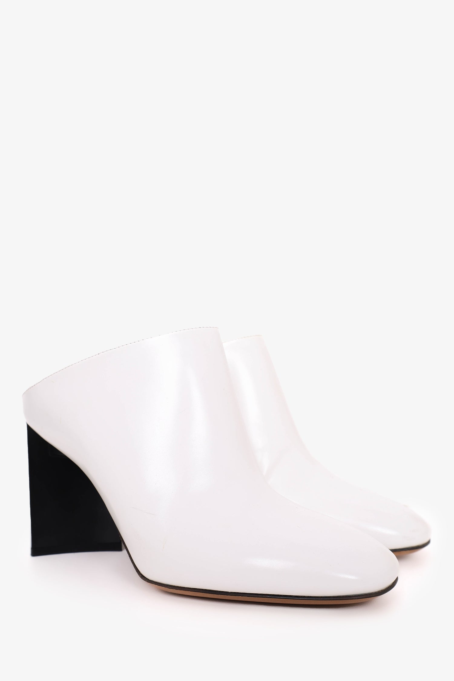 Refresh availabilityMaison Margiela White Leather Asymmetrical Heel Mules. Slip-on. Rounded square toe. Tonal stitching.