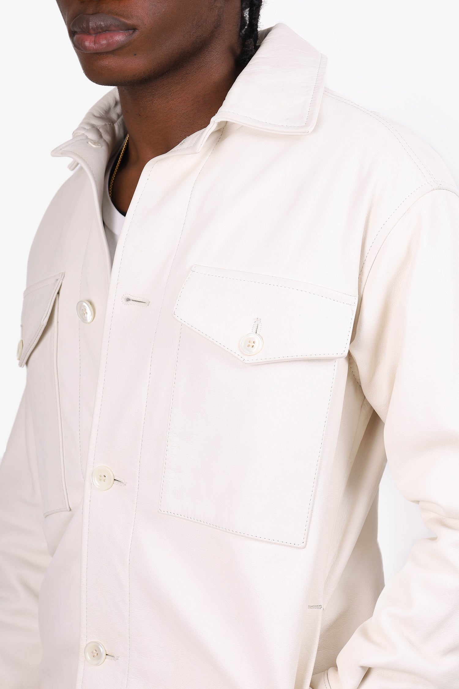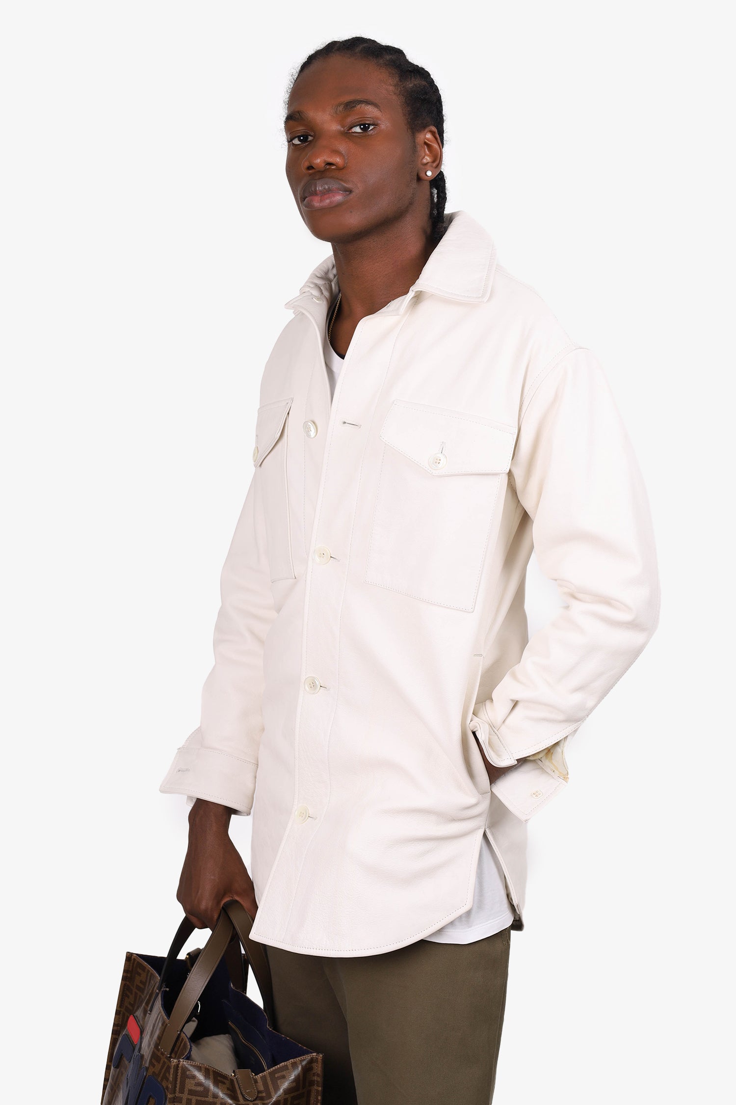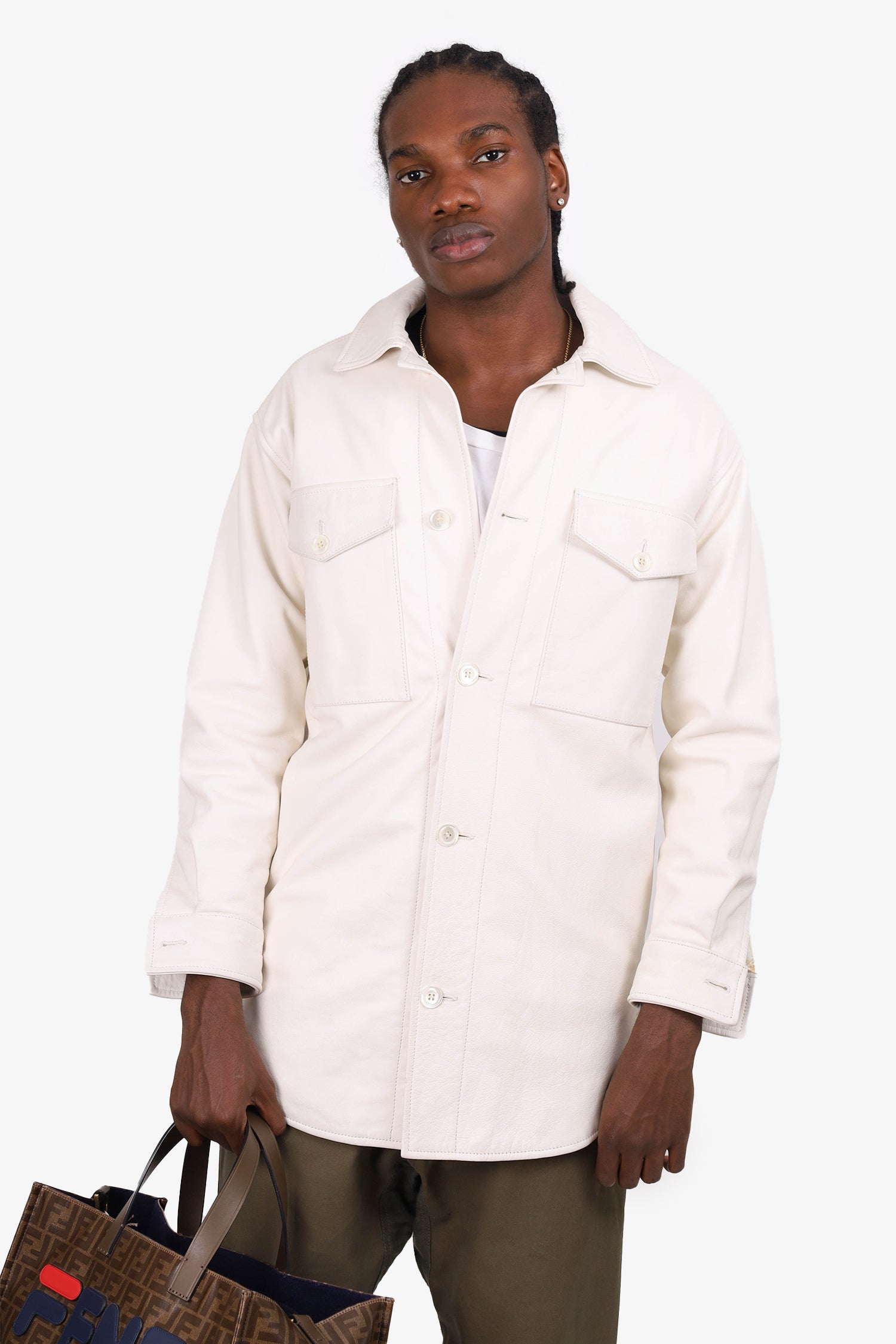 Refresh availabilityMaison Margiela x HM White Leather Jacket. Collared neckline. Front button-up closure. 2 front pockets with button-up closure. Quilted interior lining. Tonal stitching.