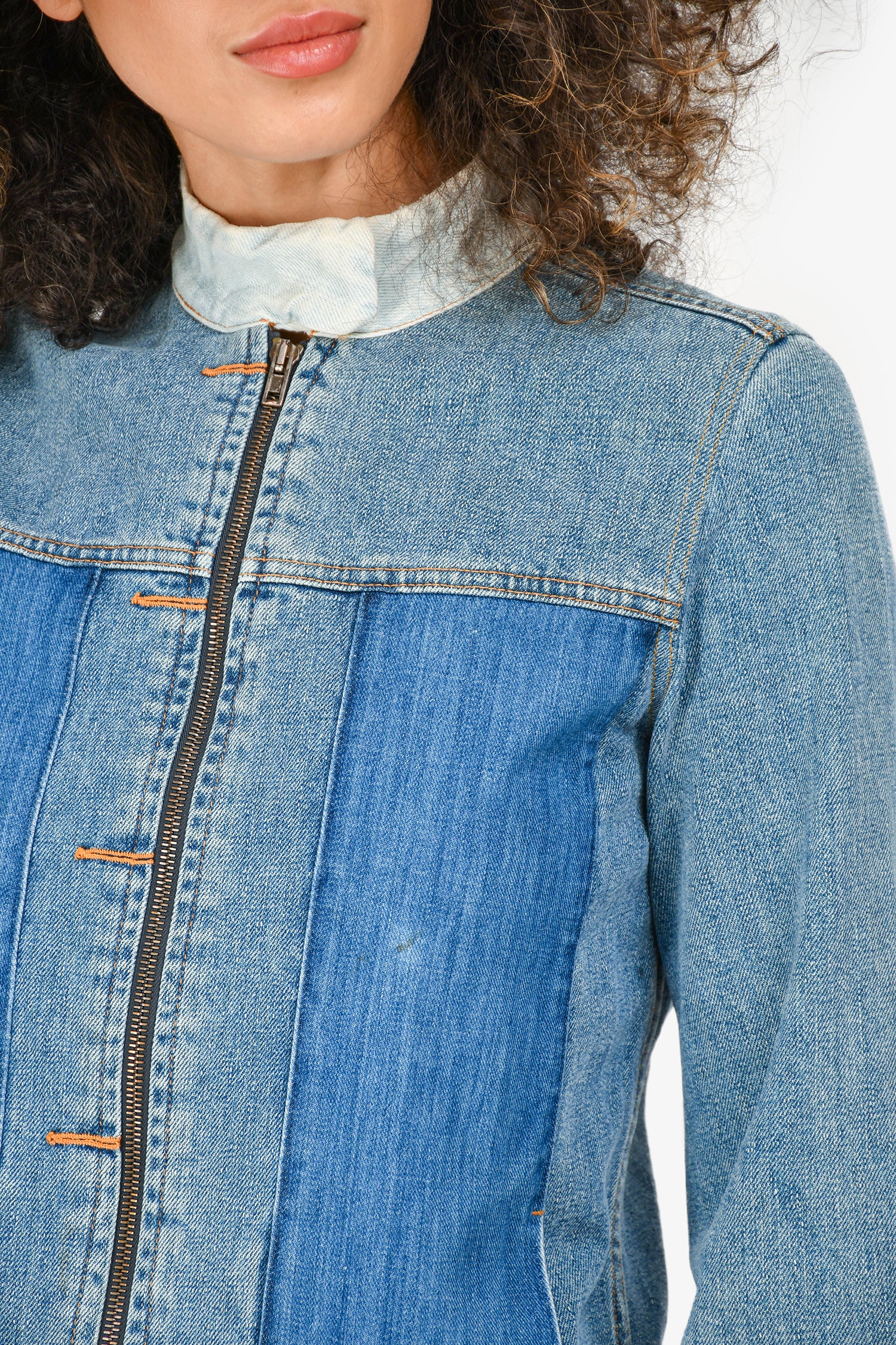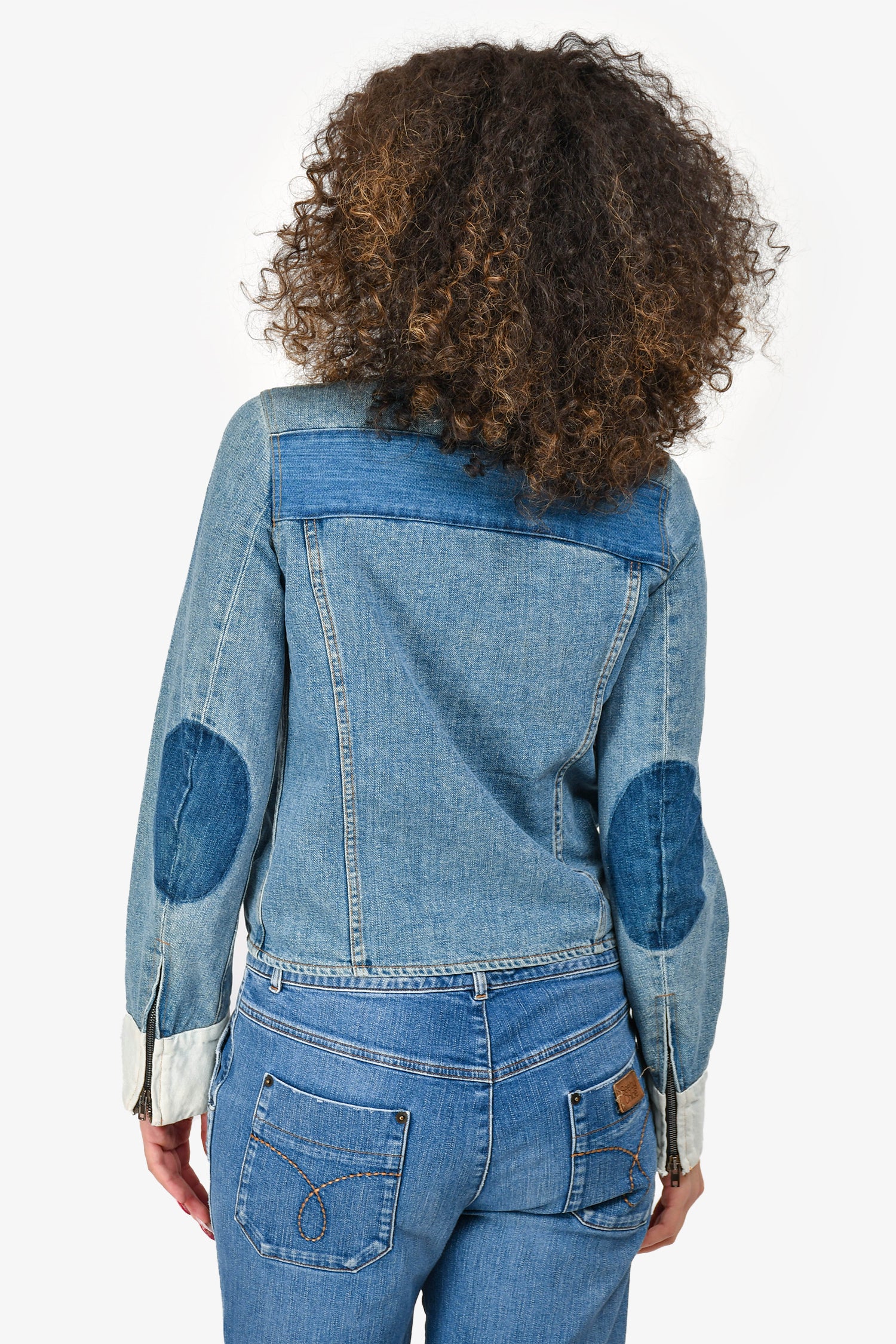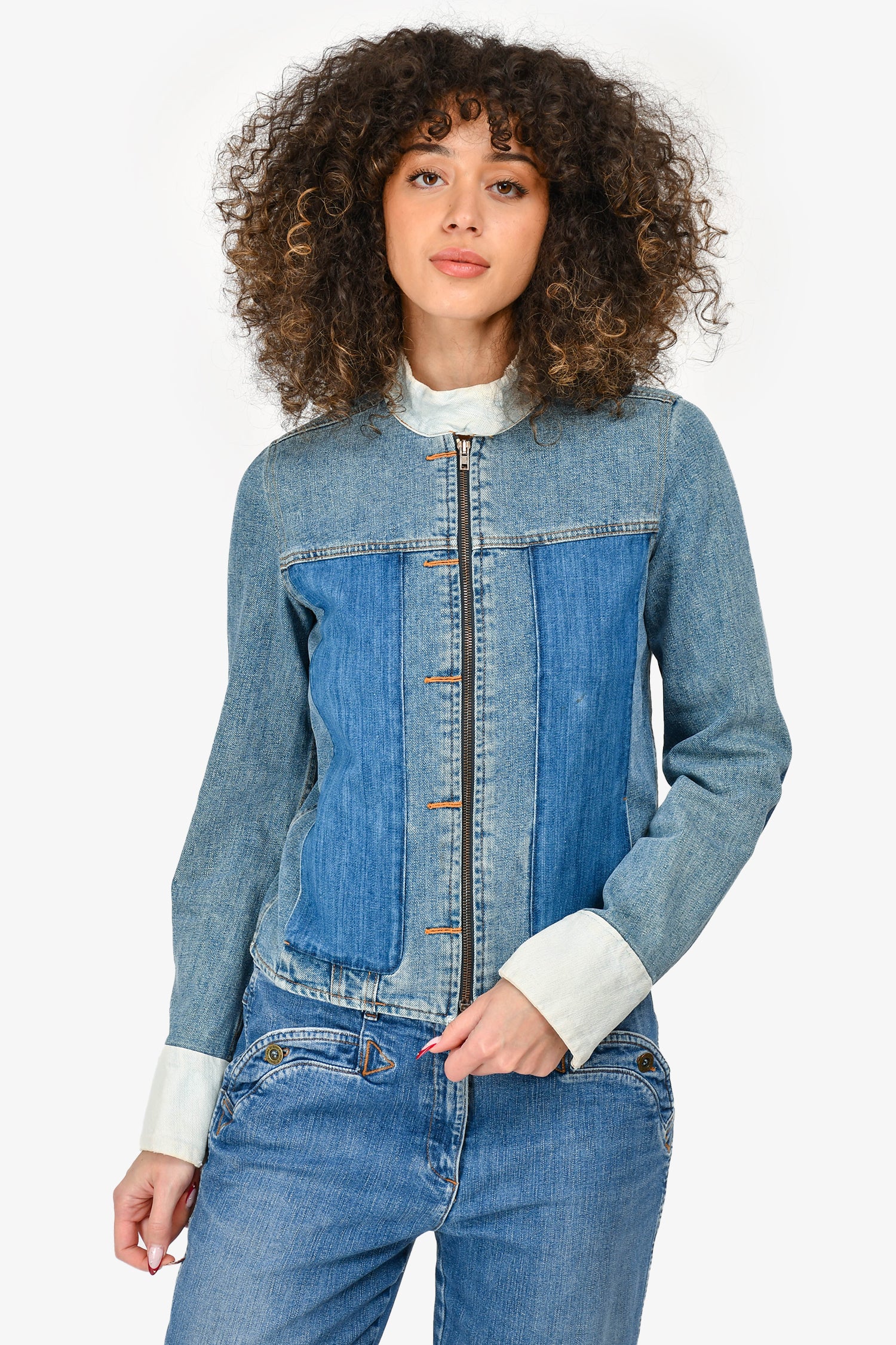Refresh availabilityMaison Marigela Blue Patchwork Denim Zip-Up Jacket. Front zip-up and snap-on button closure. Side slip pockets. Zip-up closure on the cuffs. Contrast stitching.