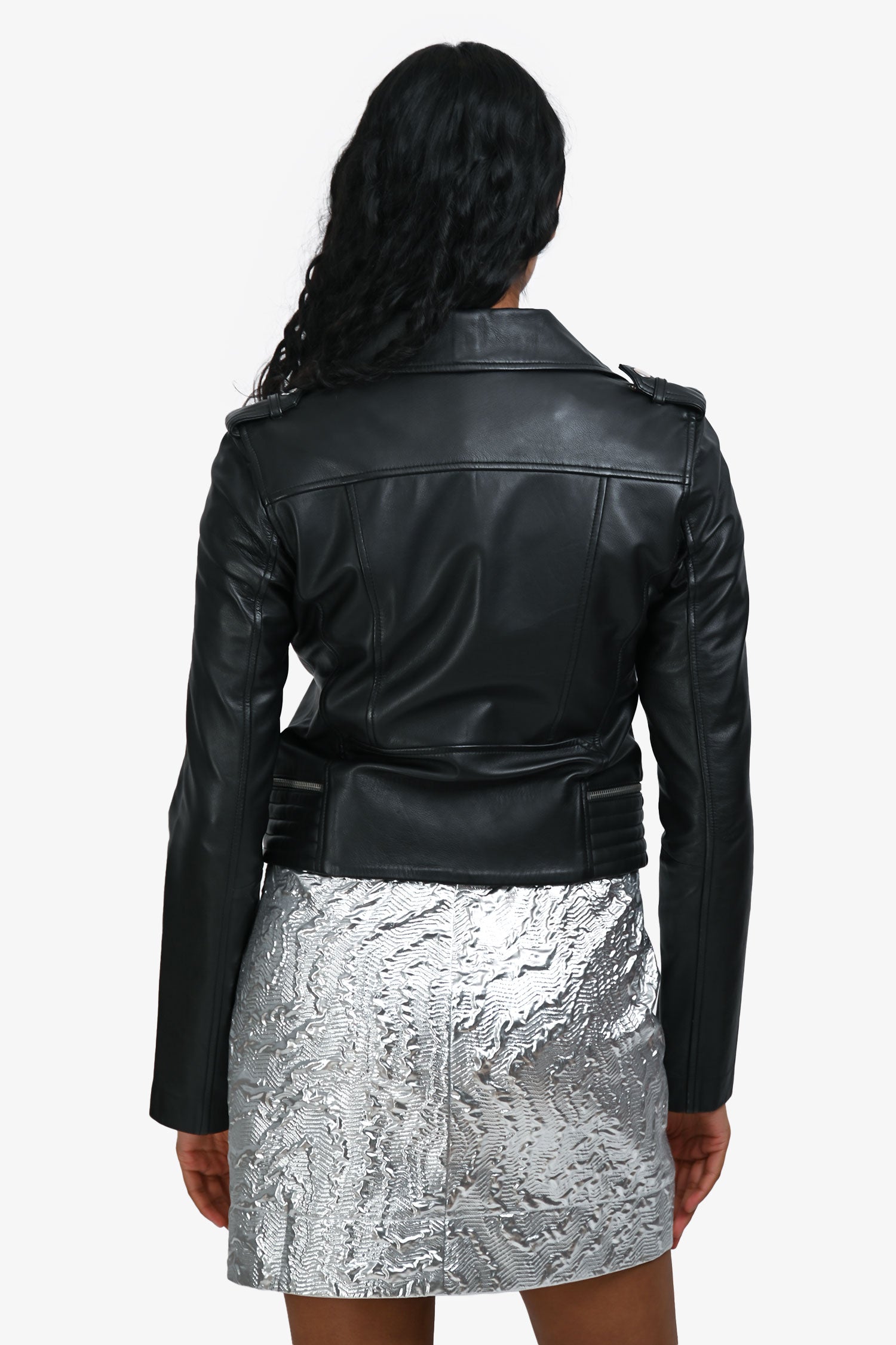 Refresh availabilityMaje Black Leather Biker Jacket. Slip-on. Notched lapel neckline with snap closures. Asymmetric front zip closure. Shoulders with straps and snap closures. 4 exterior zip pockets. Lined interior.. Silver-tone hardware. Tonal stitching.