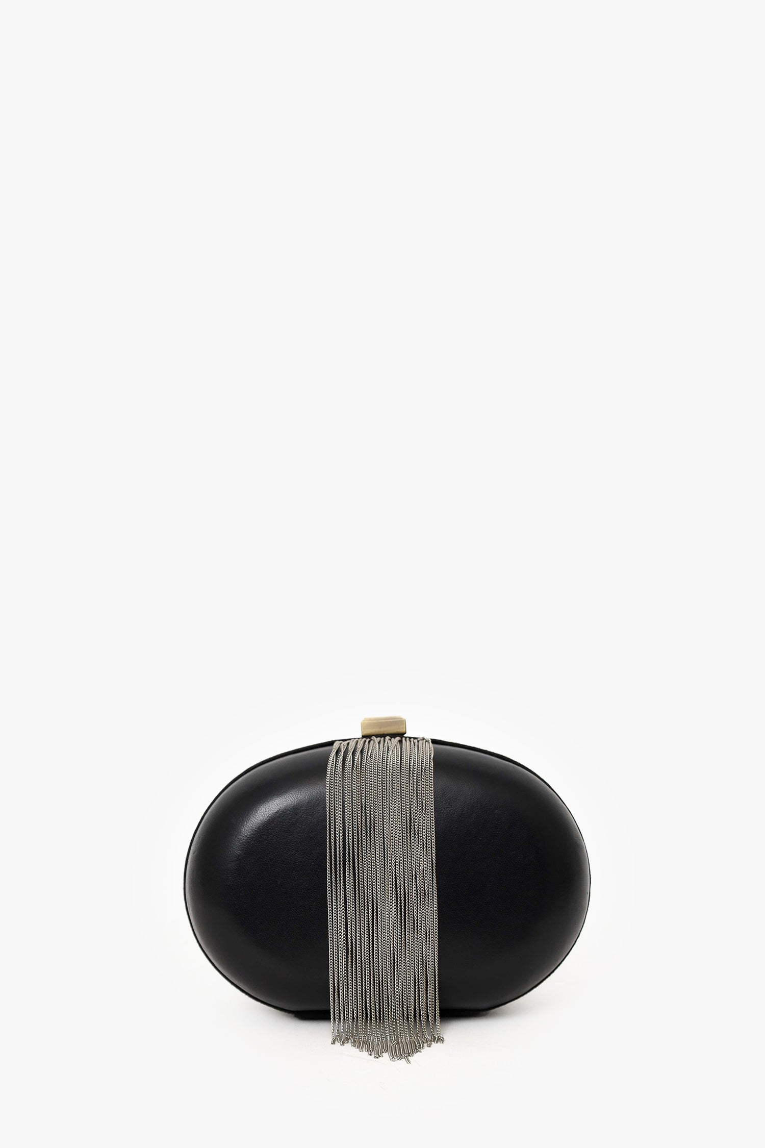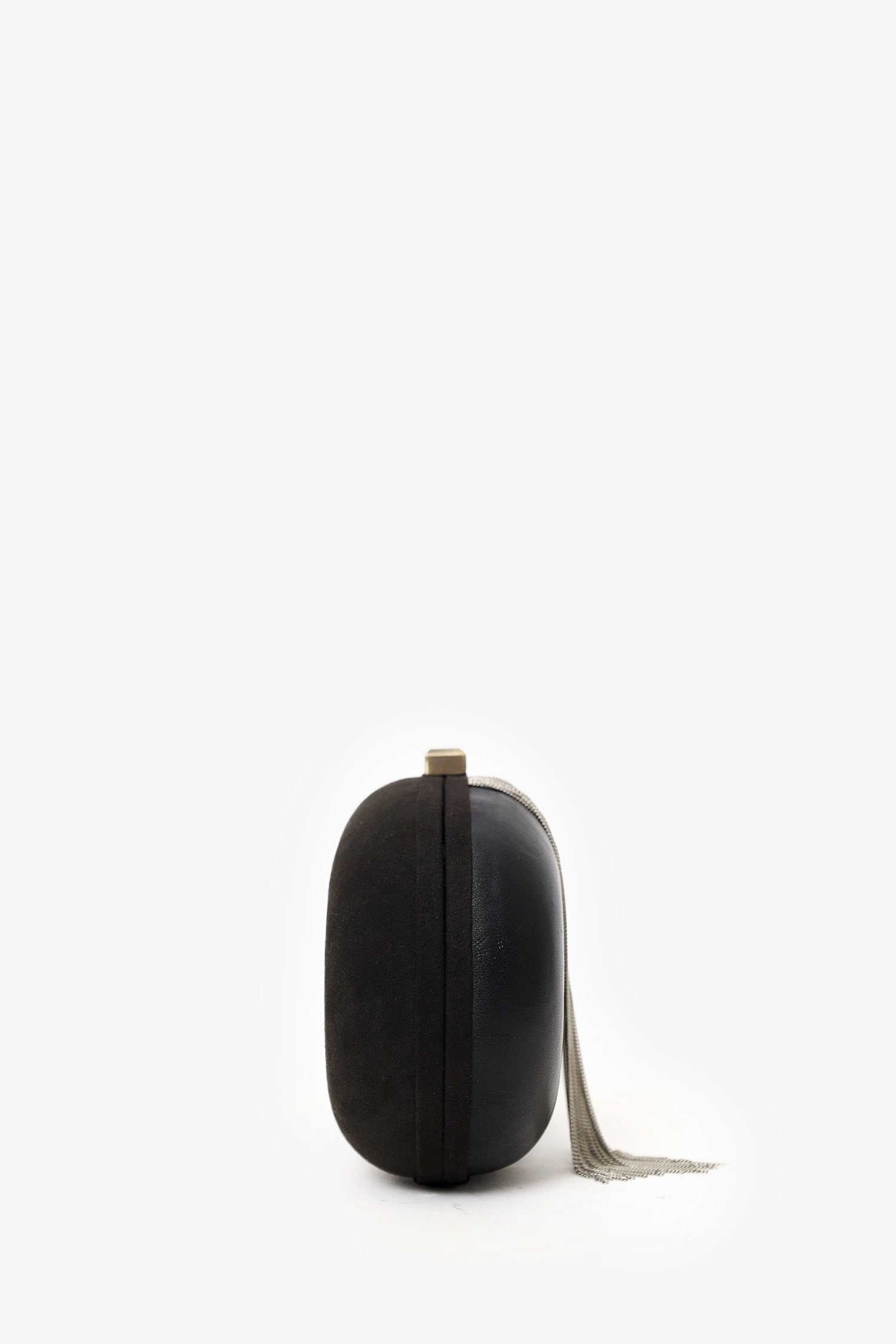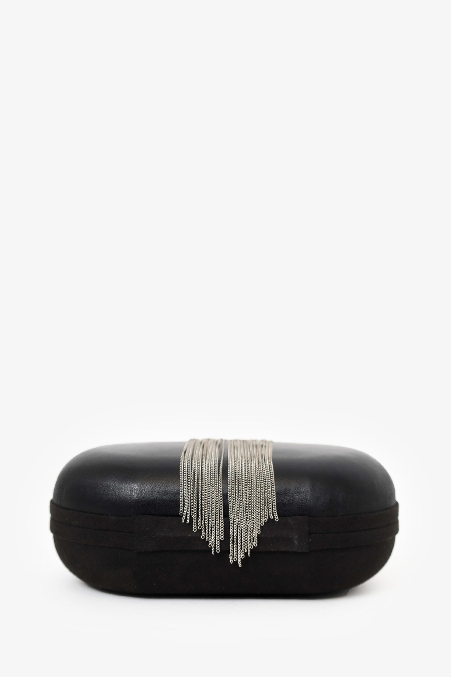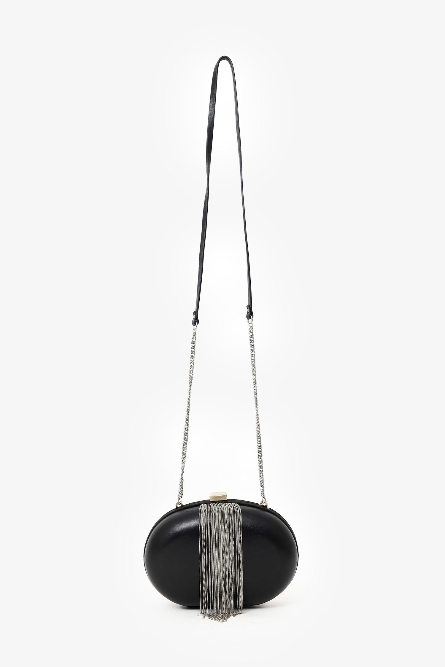 Refresh availabilityMaje Black Leather/Suede Tassel Clutch With Strap. Top flip-lock closure. Leather/chainlink strap. Open lined interior. Silver-tone hardware. Tonal stitching.