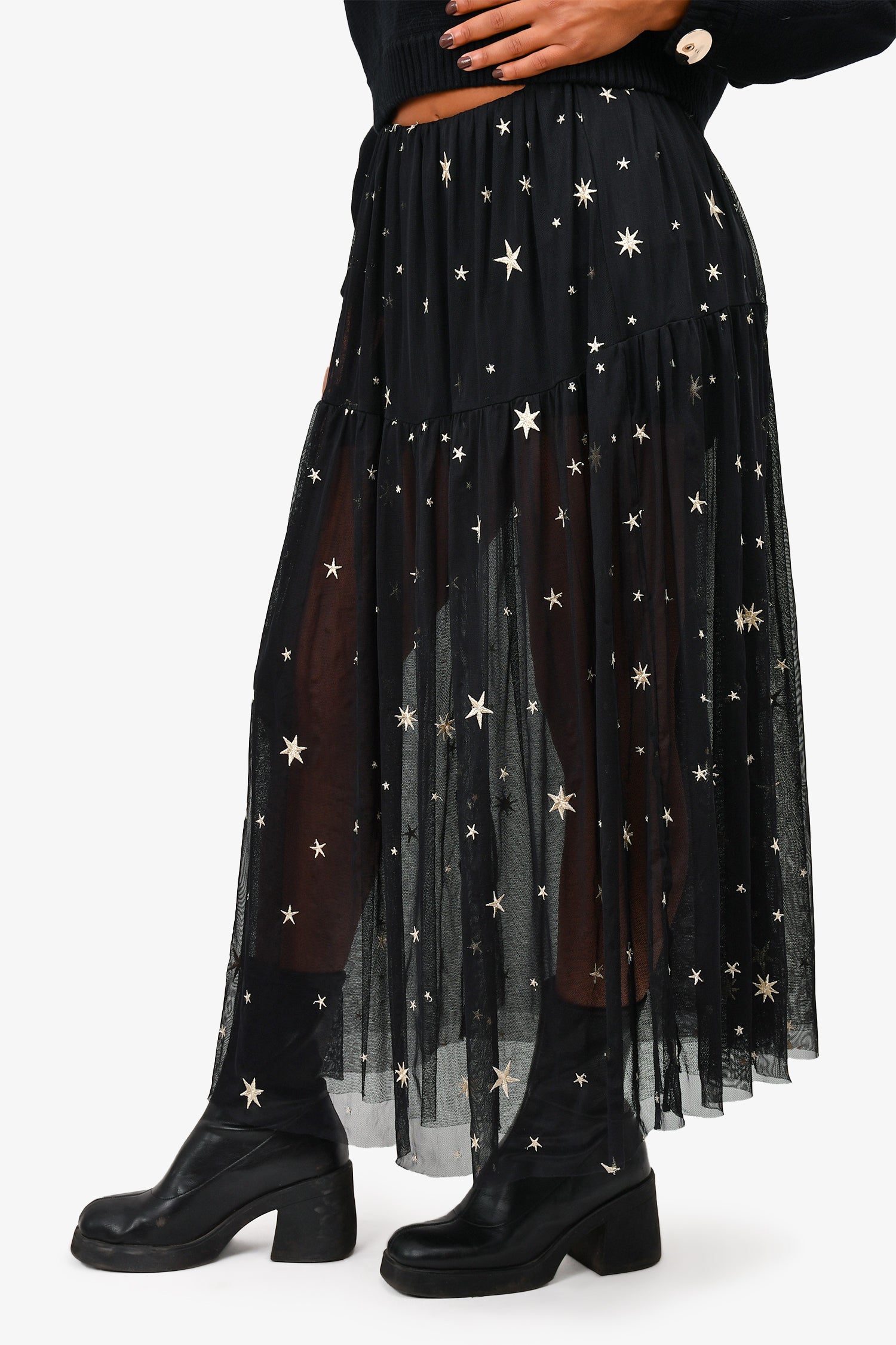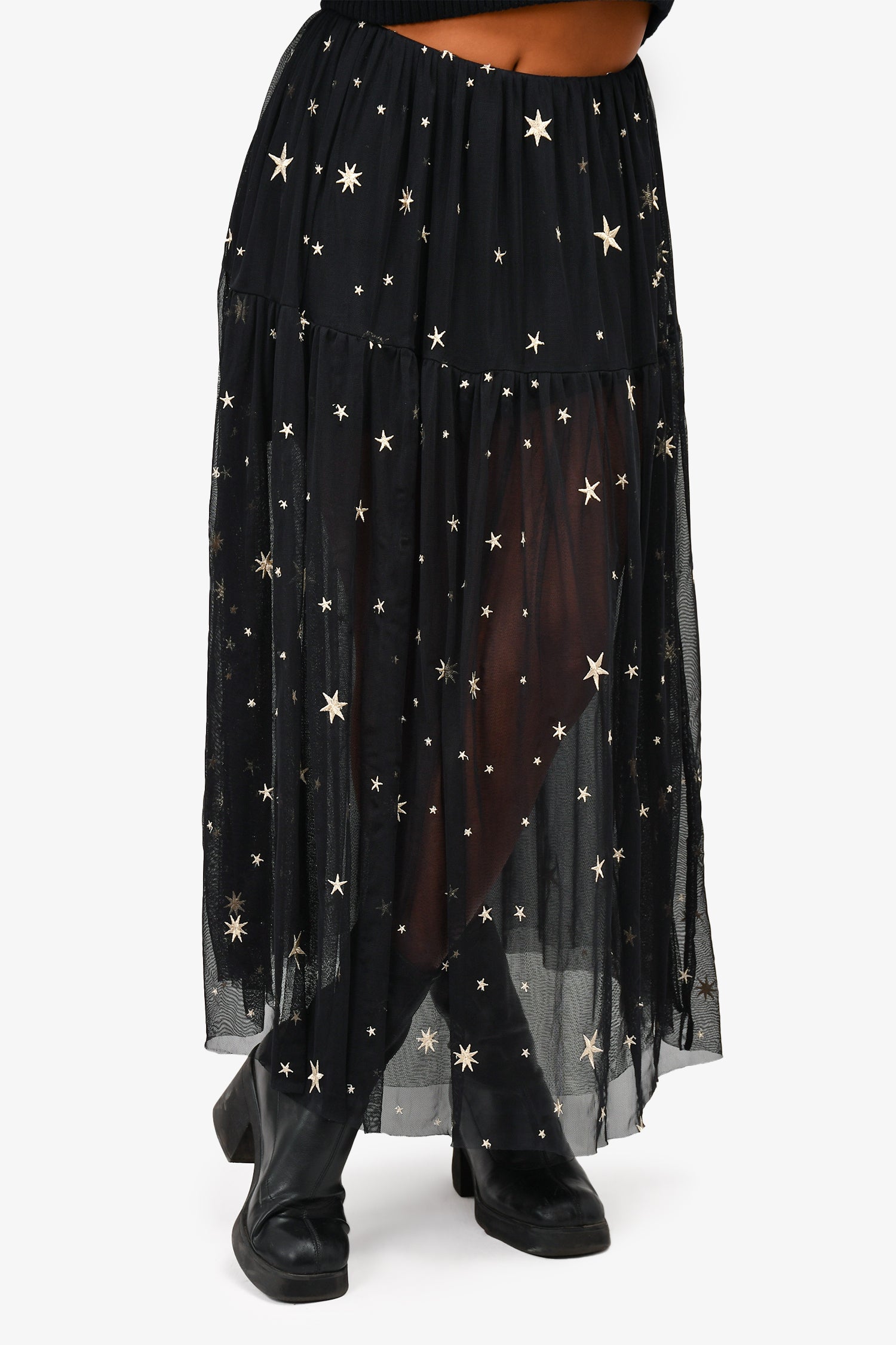 Refresh availabilityMaje Black Mesh Midi Skirt with Gold Embroidered Stars. Gold-foil stitched stars. Mesh lining.
