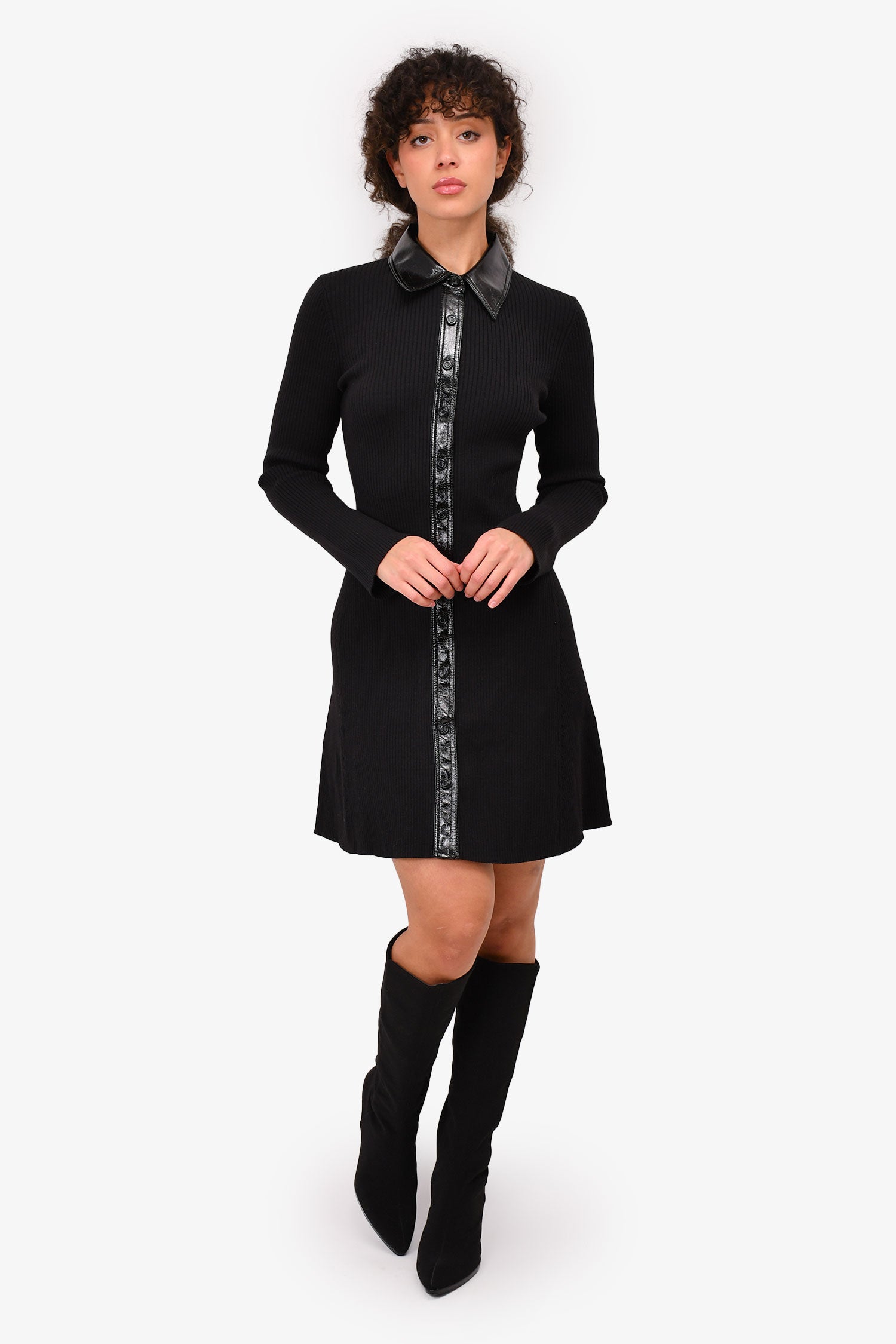 Maje Black Ribbed Faux Leather Trimmed Midi Dress Size 38
