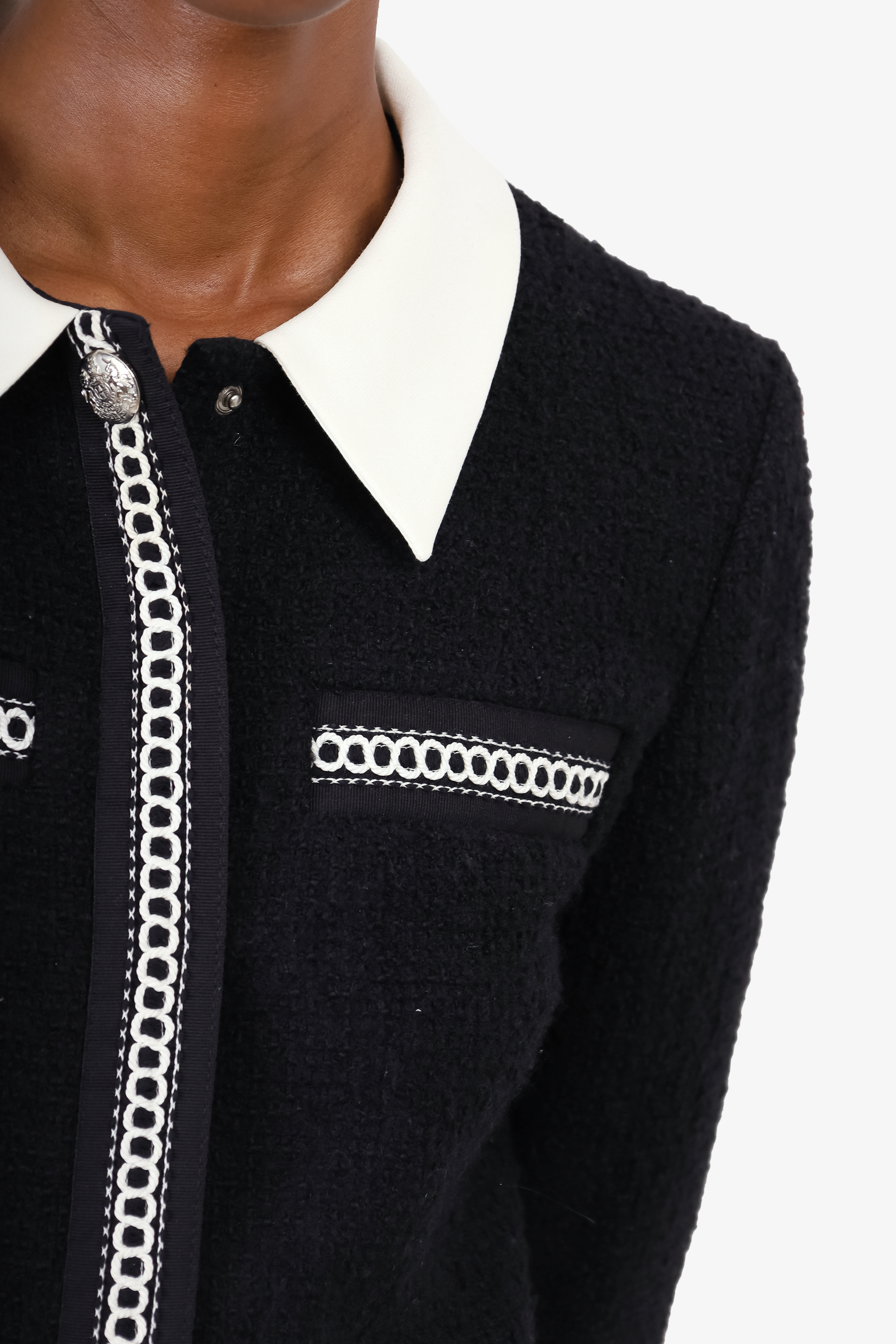 Refresh availabilityMaje Black/White Tweed Mini Dress. Collared neckline. Front snap button-up closure. 4 faux pockets on front. Lined. Tonal stitching.
