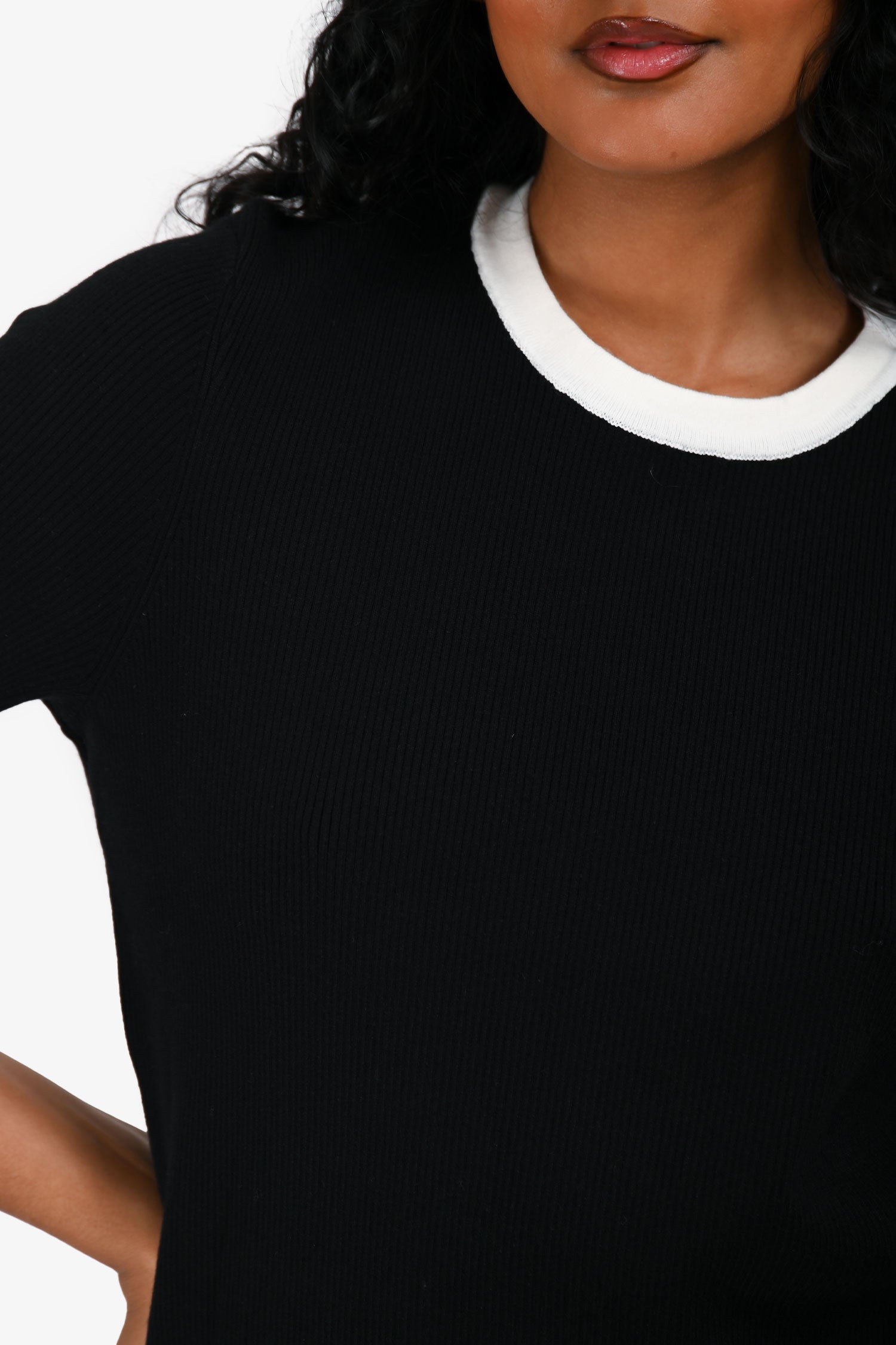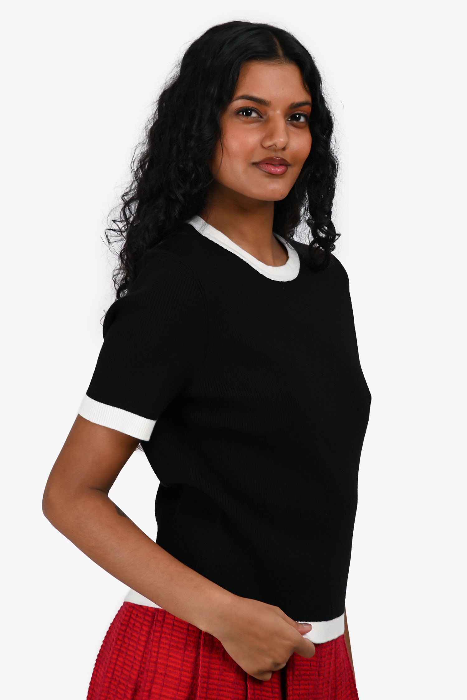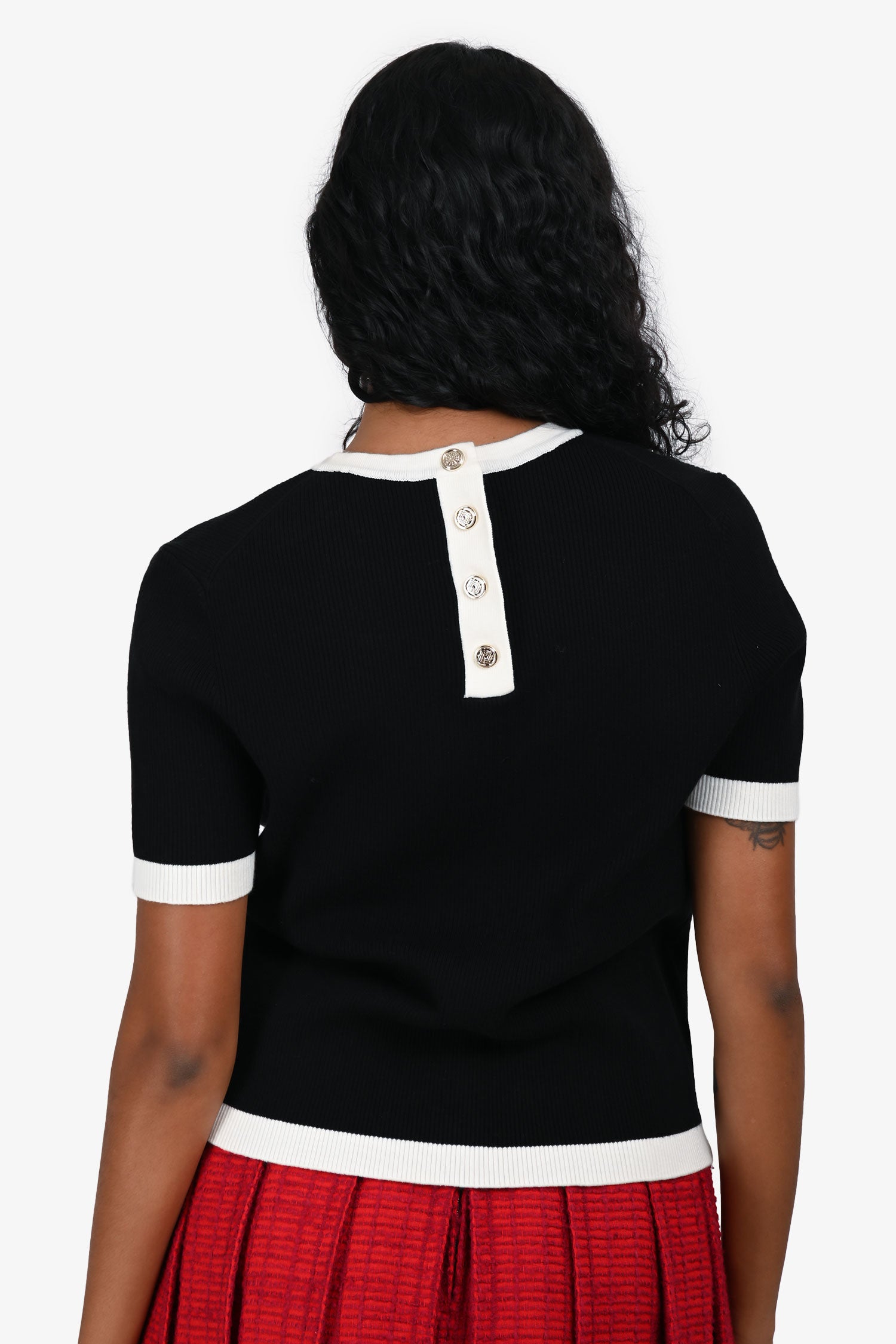 Refresh availabilityMaje Black/White Knit Ribbed Top. Pull-on. Round neckline. Button details at the rear. Gold-tone hardware. Tonal stitching.
