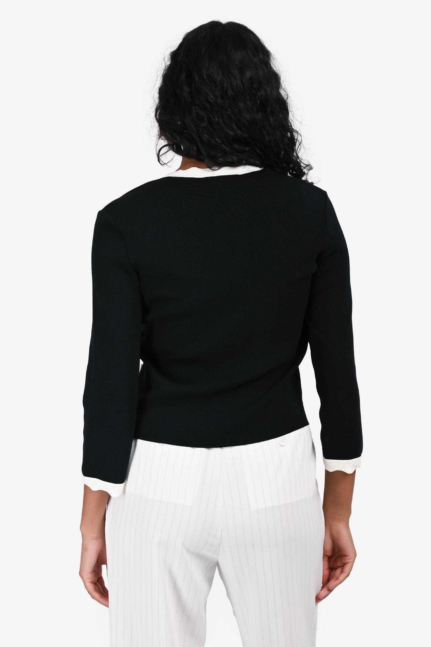 Refresh availabilityMaje Black/White Knit Scalloped Edge Hem Cardigan. Slip-on. V-neckline. Front button-up closure. Tonal stitching.