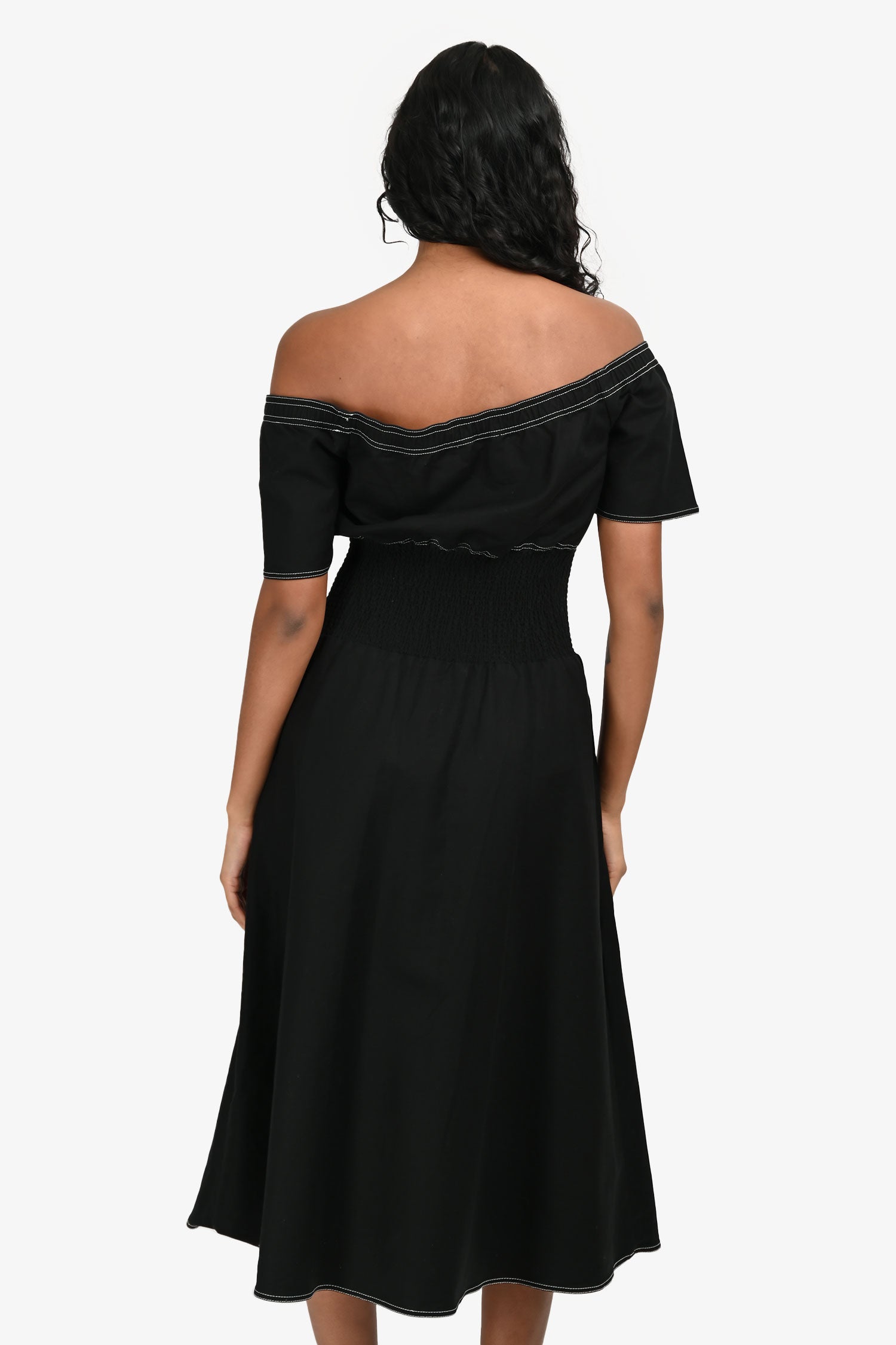 Refresh availabilityMaje Black and White Top-Stitched Midi Dress. Off-the-shoulder neckline. Front zip detail. Unlined interior. Silver-tone hardware. Contrast stitching.