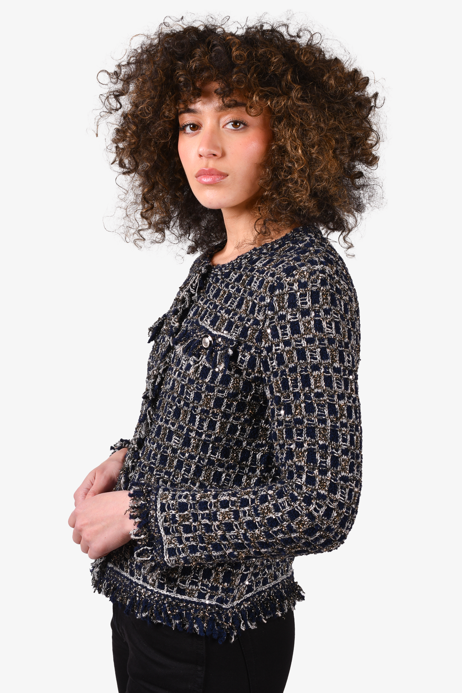 Refresh availabilityMaje Blue/Black Metallic Tweed Jacket. Front button-up closure. Front pockets. Unlined. Tonal stitching.