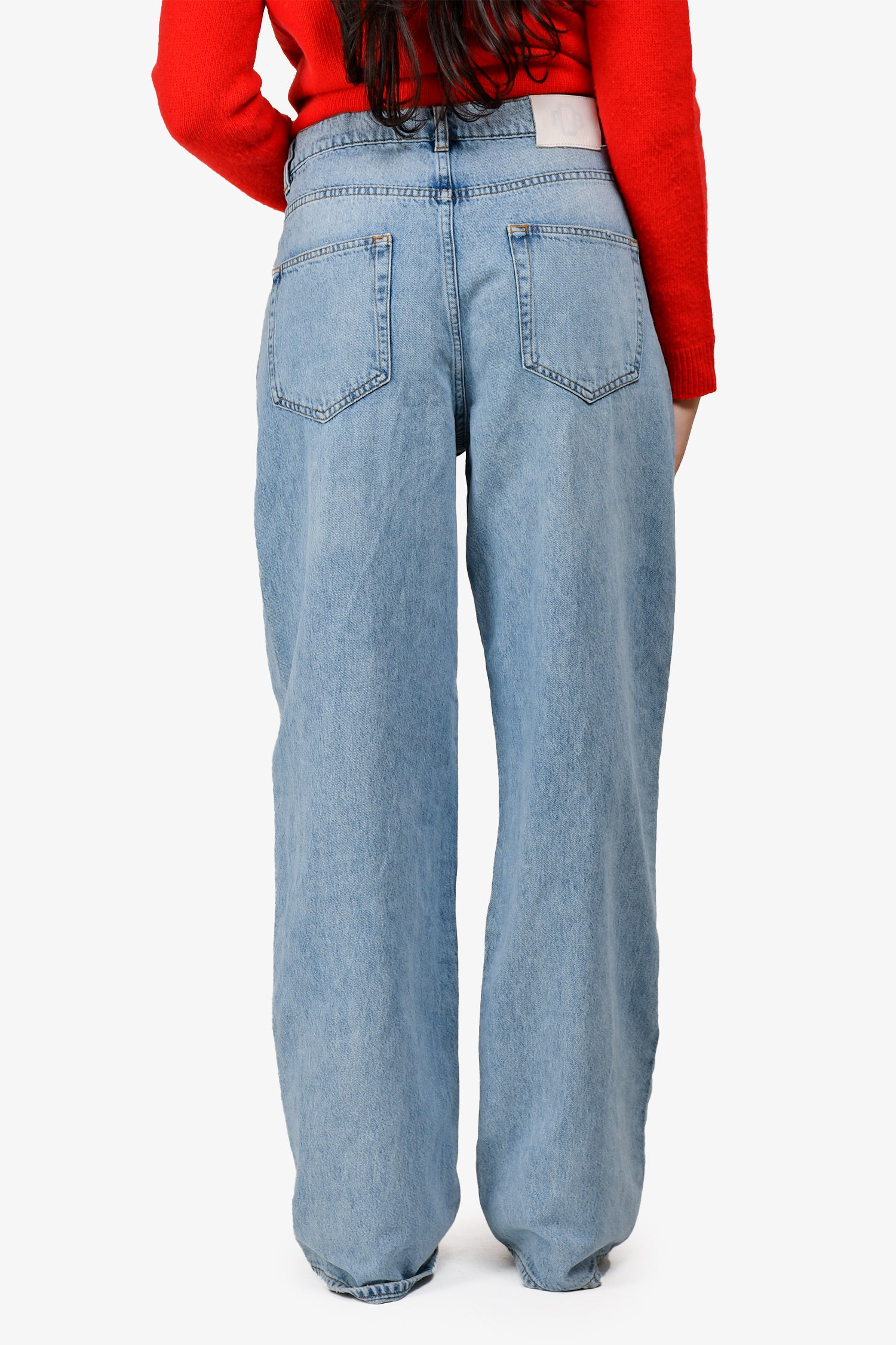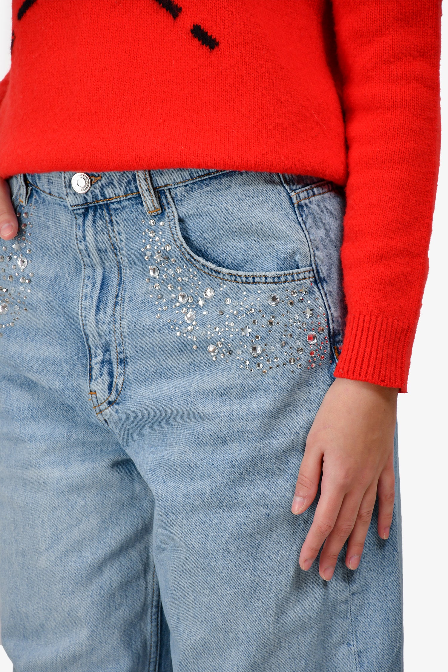 Refresh availabilityMaje Blue Denim Crystal Embellished Wide Leg Jeans. 5 slip pockets. Zipped front. Button closure. Crystal embellishment by the sides. Intentional distressing. Contrast stitching.