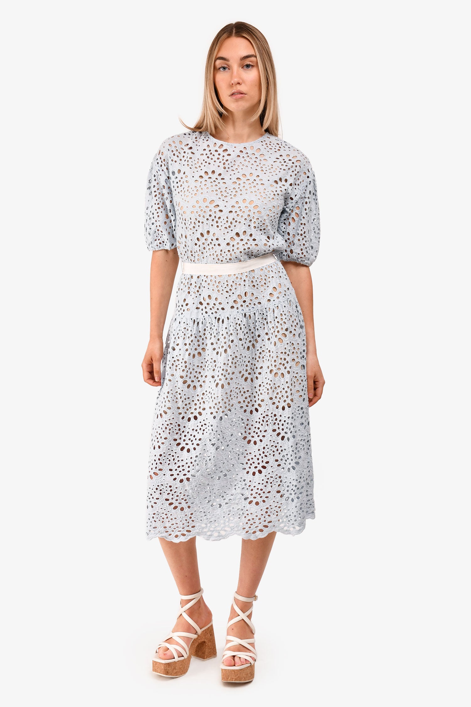 Refresh availabilityMaje Blue Eyelet Belted Midi Dress. Drop waist. Ribbon belt at the waist. Puff sleeve. Crew neckline with adjustable string to tie back.
