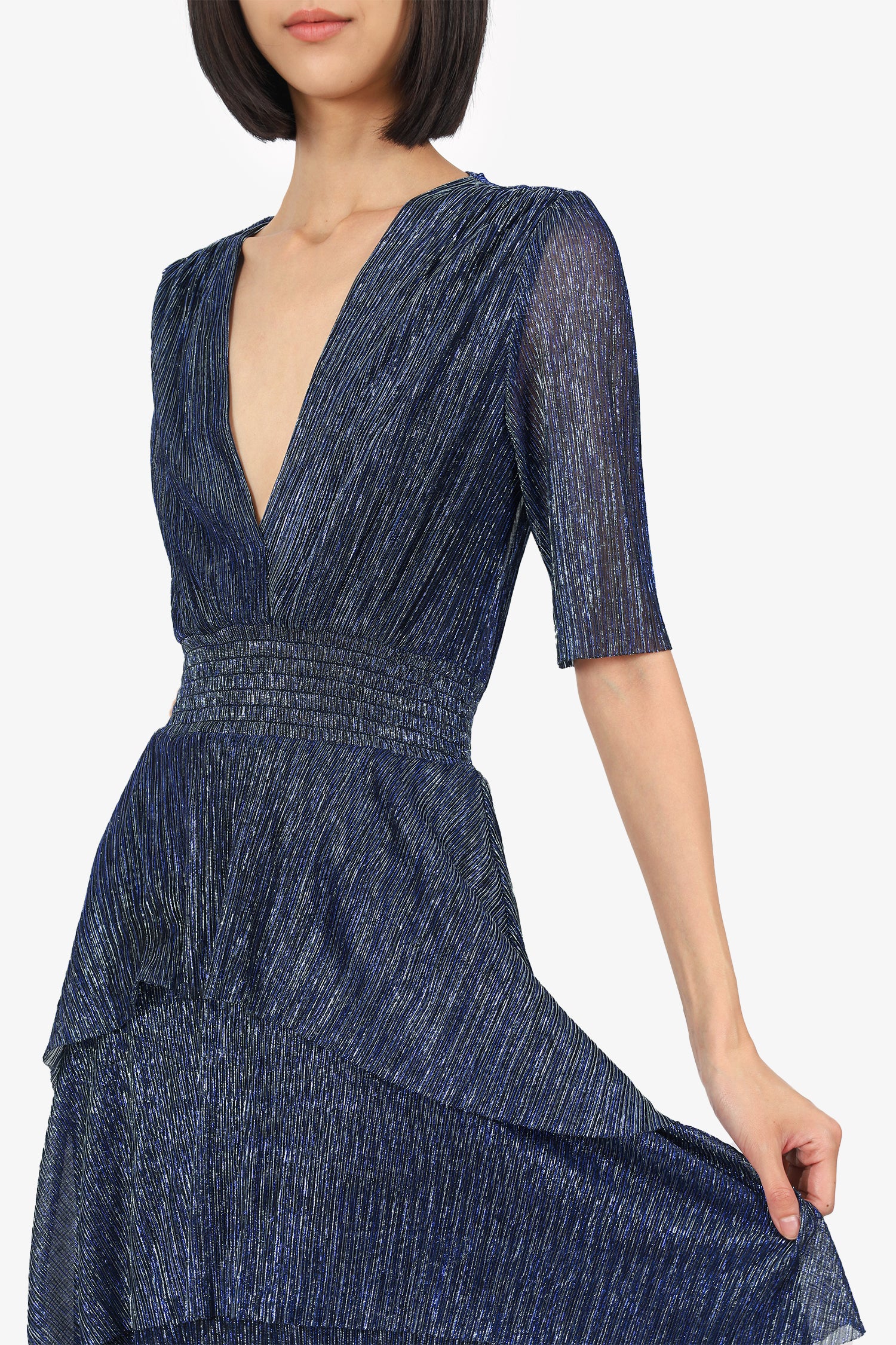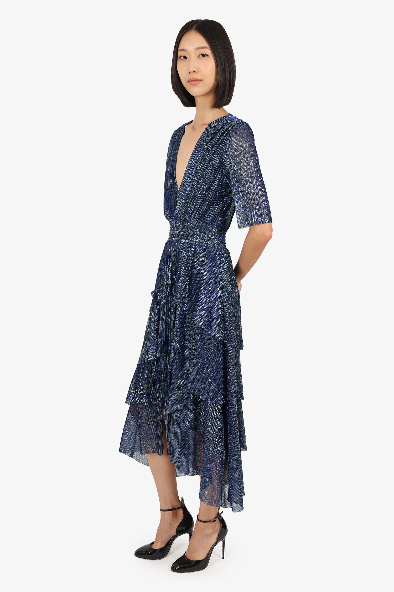 Refresh availabilityMaje Blue Glitter Ruffle Maxi Dress. Slip-on. Plunge V-neckline. Elasticated waistband. Semi-sheer body. Tonal stitching.