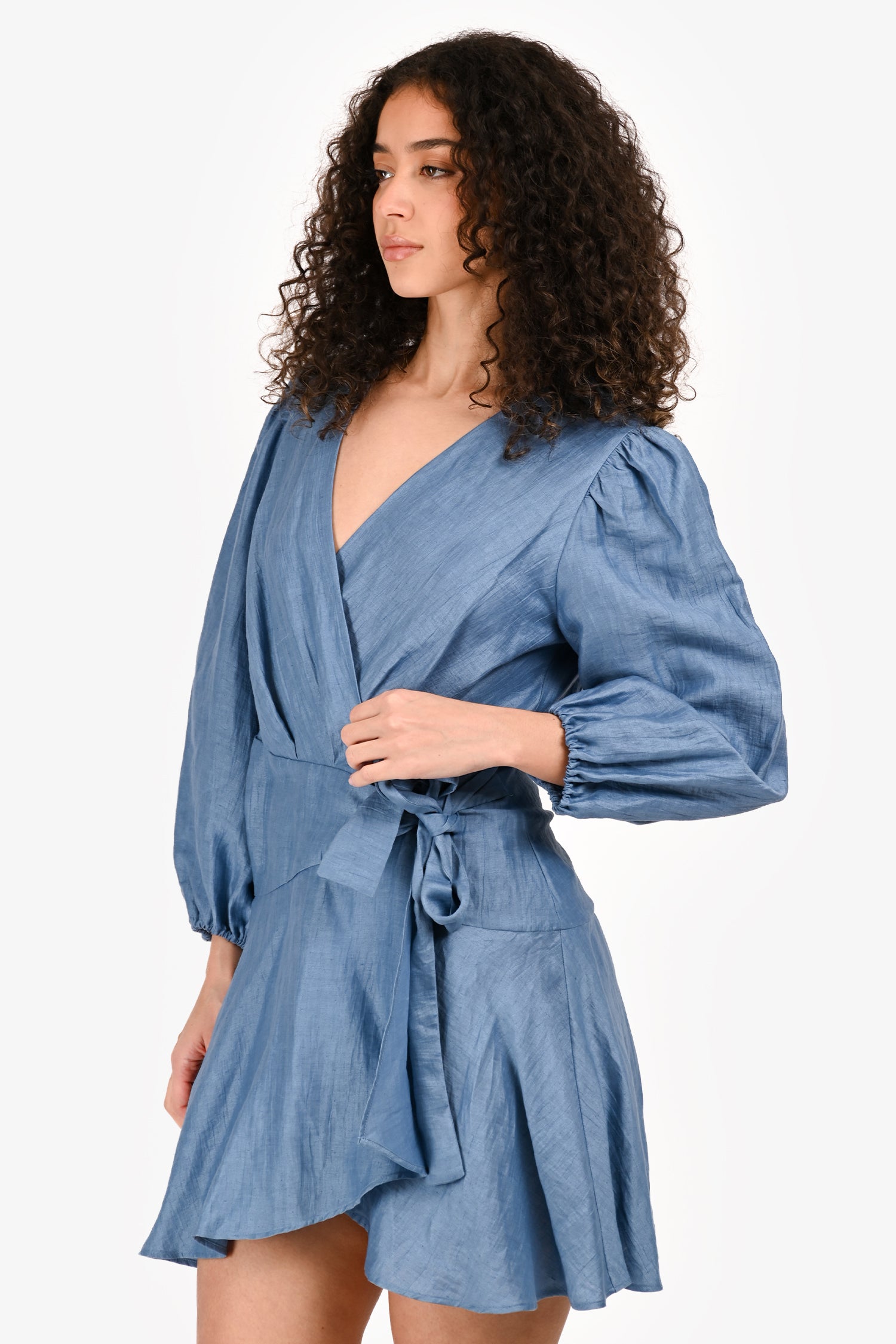Refresh availabilityMaje Blue Linen Long Sleeve Wrap Dress. Slip-on. V-neckline. Tie closure in the front. Tonal stitching.
