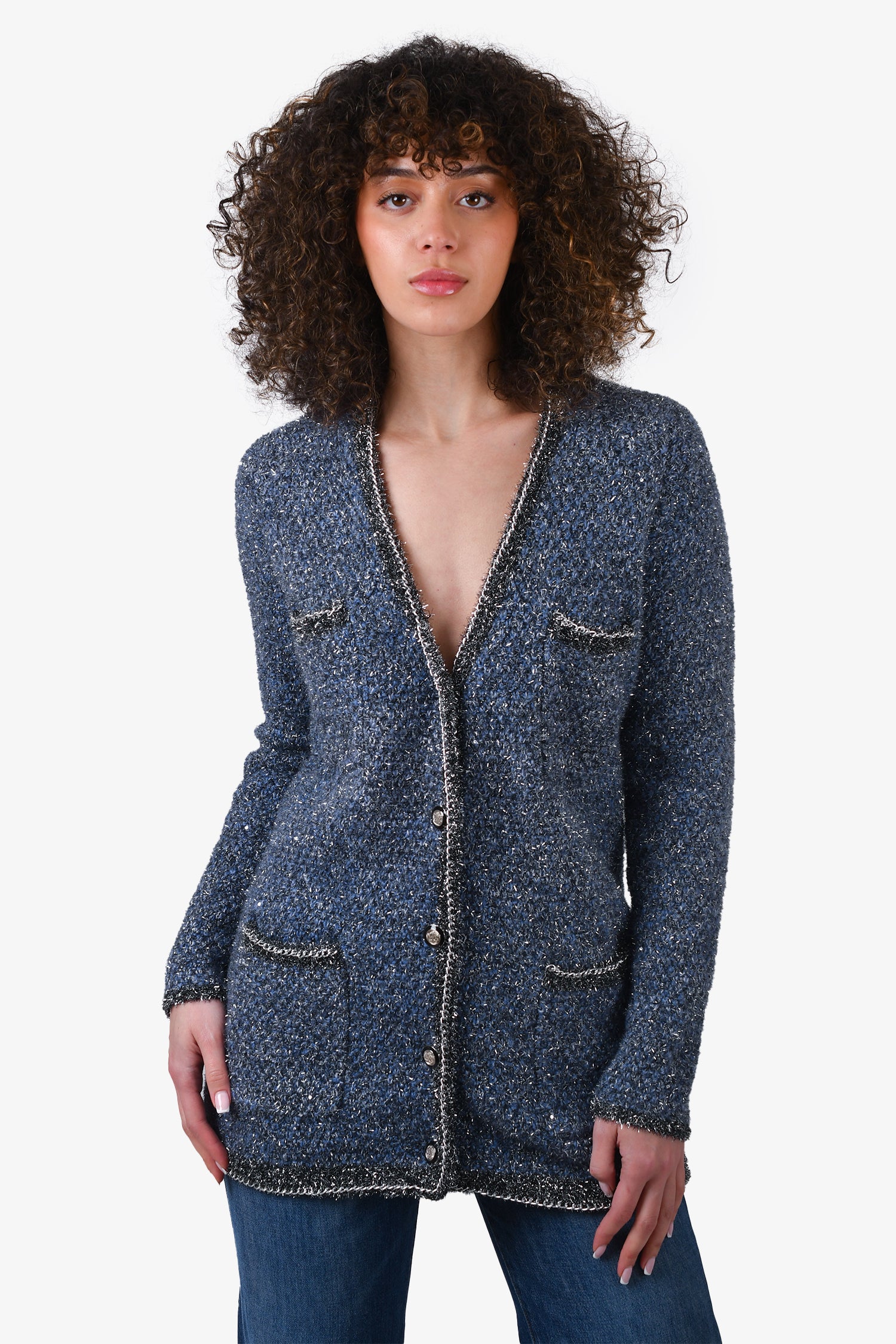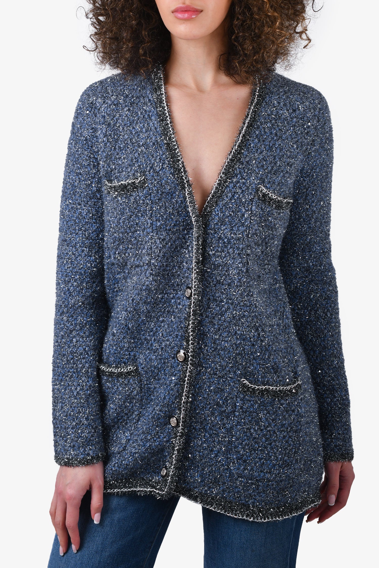 Refresh availabilityMaje Blue Metallic 4 Pockets Button Up Cardigan. 2 front slip pockets. Unlined. Tonal stitching.