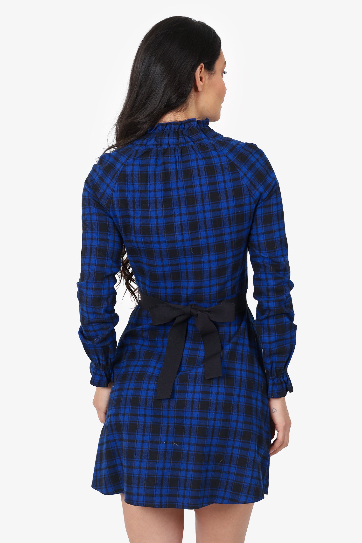 Refresh availabilityMaje Blue/Black Checked Ruffle Mock Neck Long Sleeve Dress. Slip-on. Side zip-up closure. Removable belt with tie-up closure. Elasticated neck and sleeve cuffs. Silver-tone hardware. Tonal stitching.