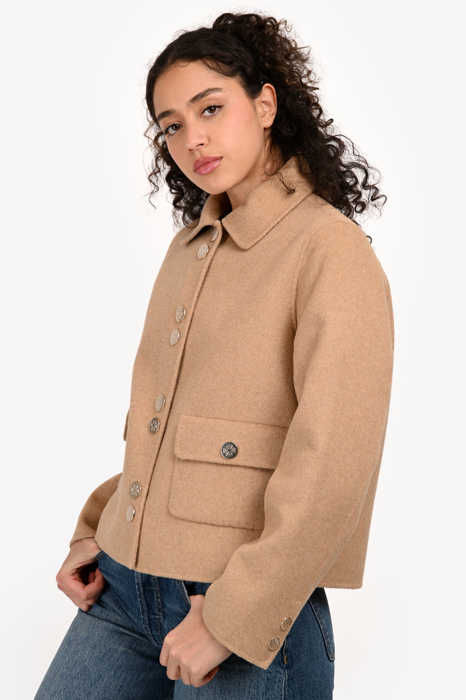 Refresh availabilityMaje Brown/Gold Button Down Cropped Coat. Slip-on. Pointed collar. Snap closure in the front. 2 front pockets with fold-over flap. Gold-tone hardware. Tonal stitching.
