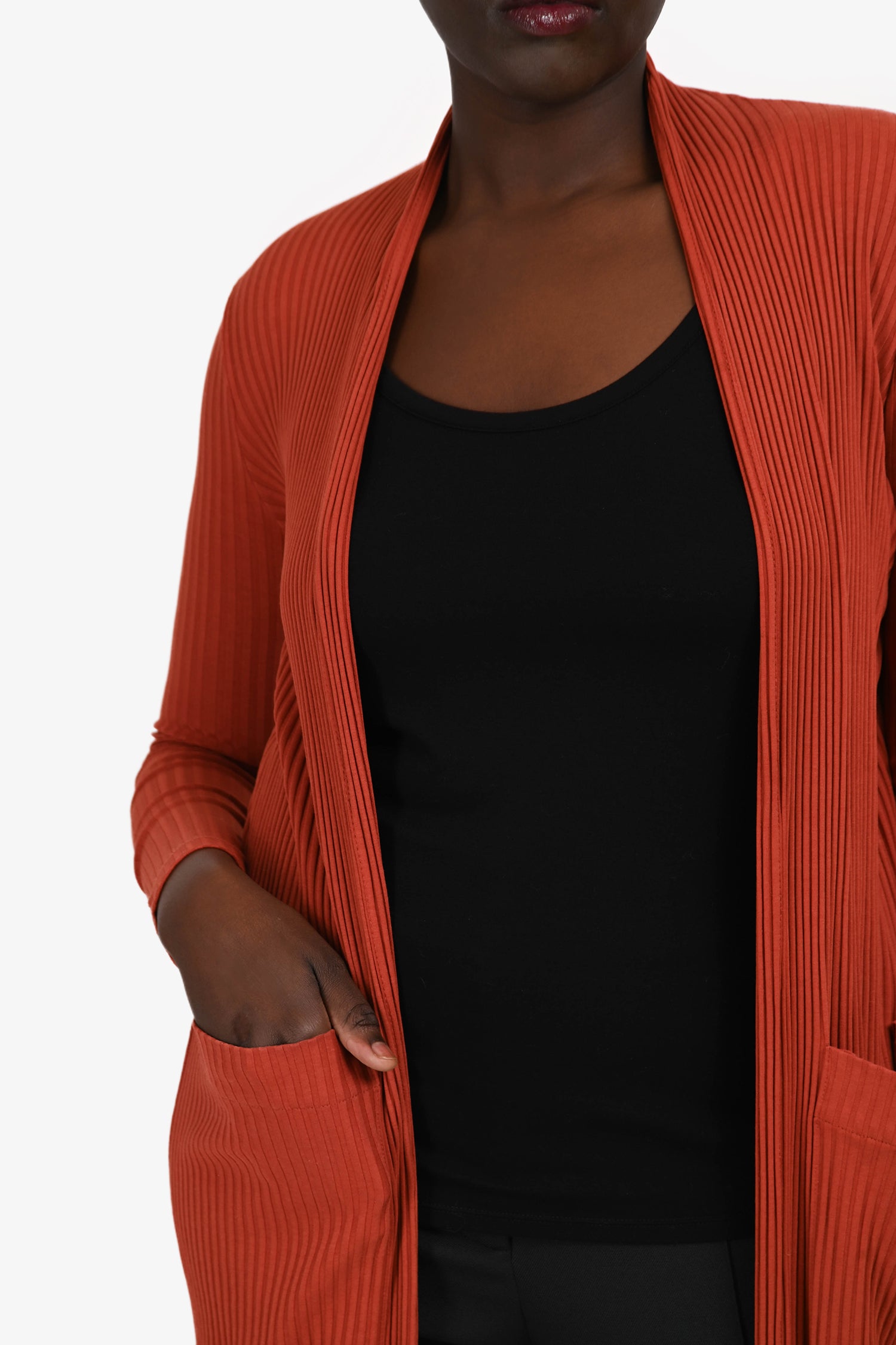 Refresh availabilityMaje Burnt Orange Cotton Ribbed Long Cardigan. Slip-on. Open front. 2 exterior slip pockets. Tonal stitching.