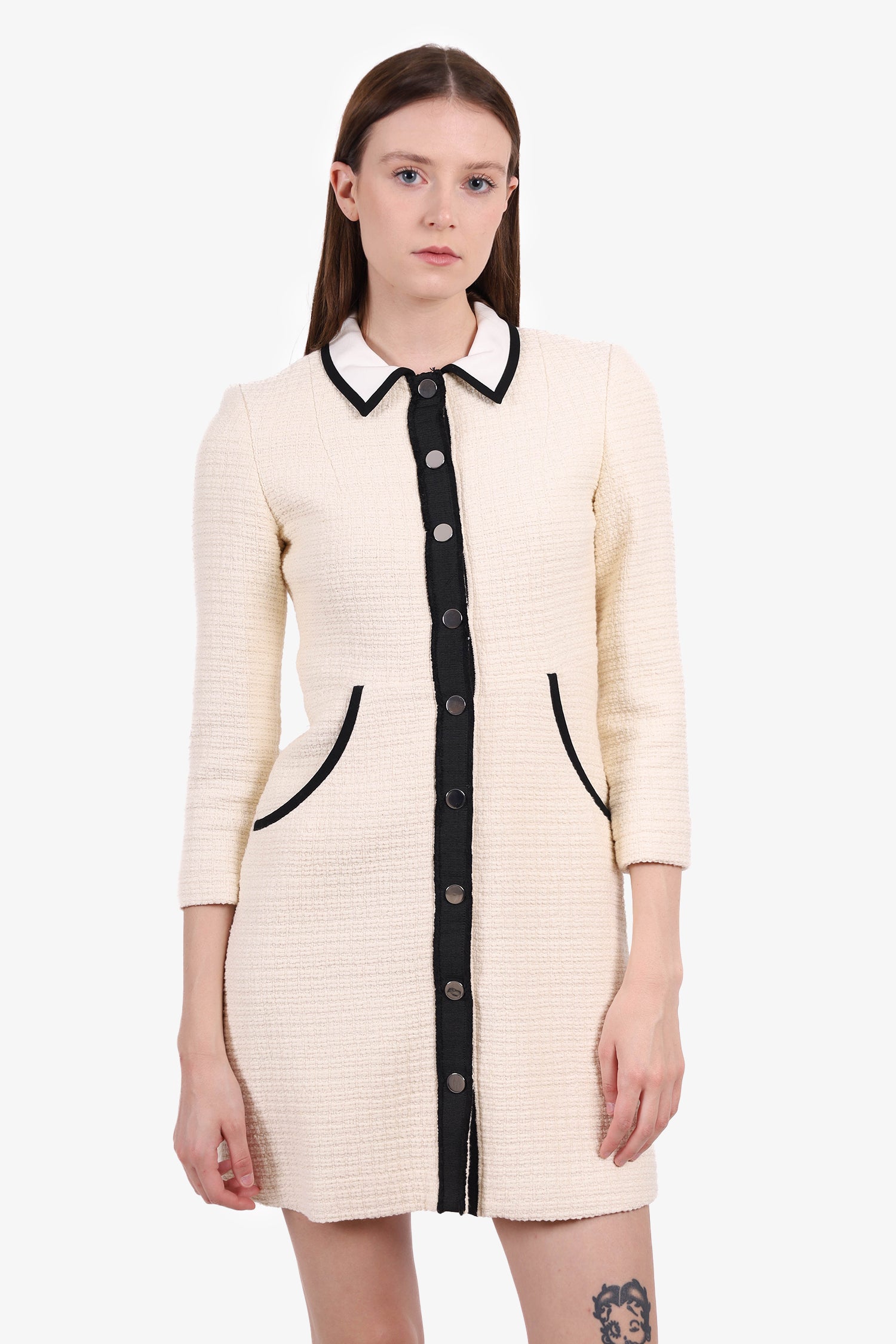 Refresh availabilityMaje Cream/Black Tweed Button Down Dress. Front snap button down closure. Lined. 2 front slip pockets. Silver-tone hardware.
