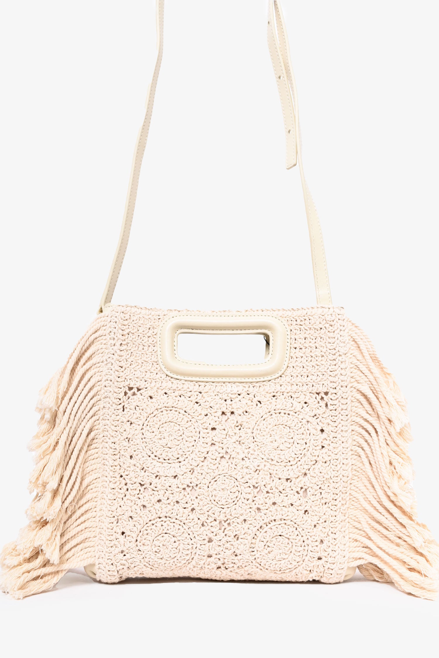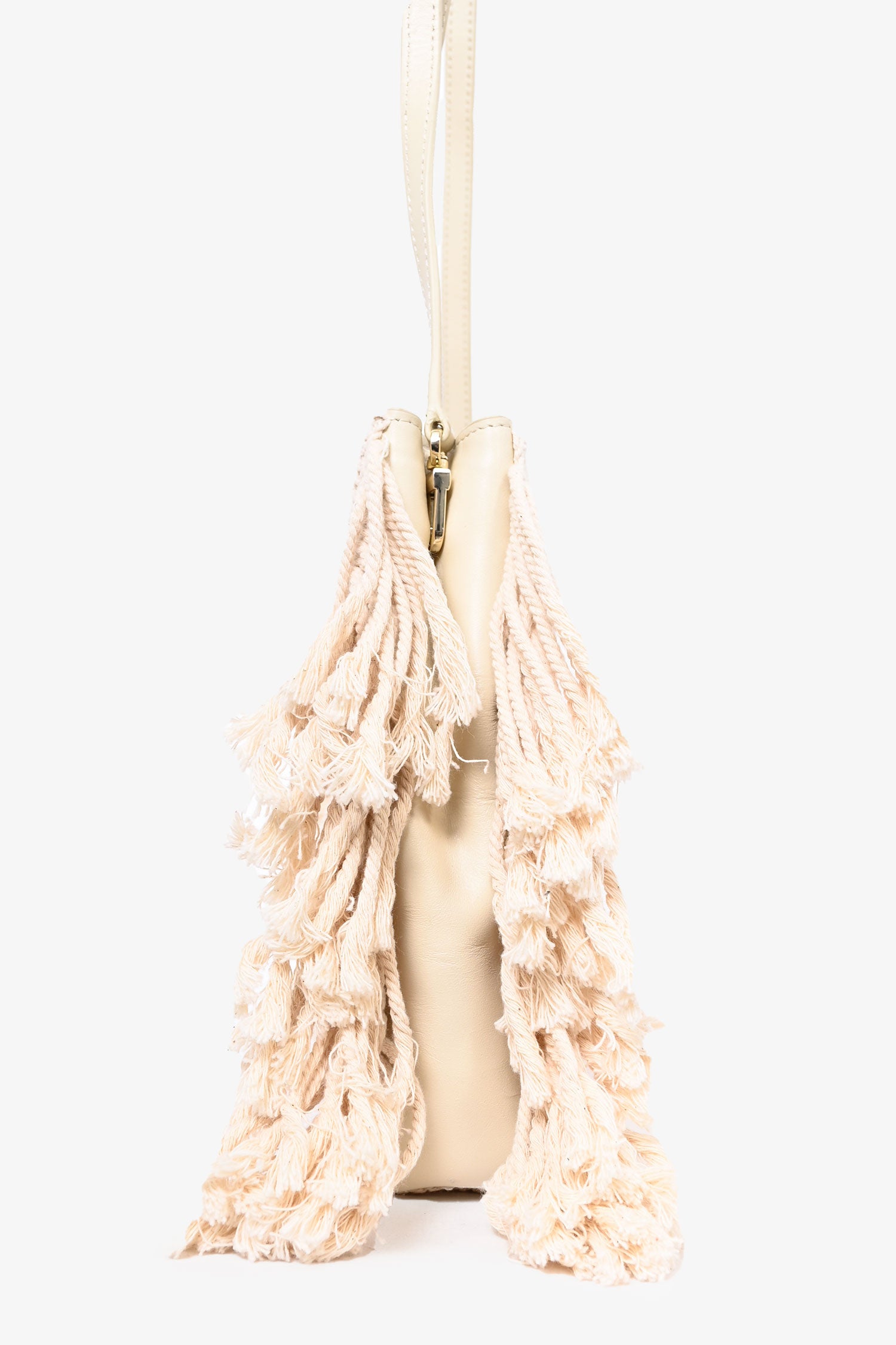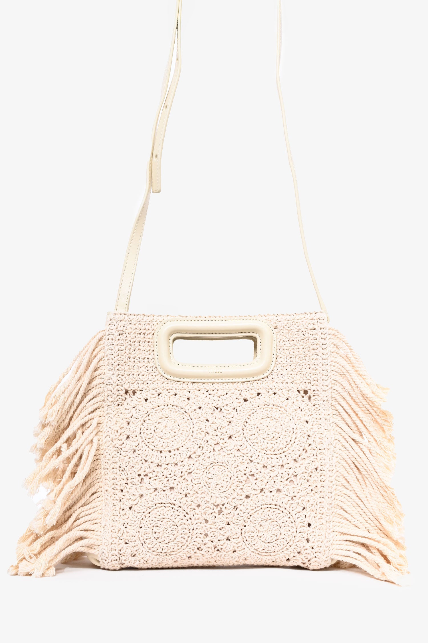 Refresh availabilityMaje Cream Canvas Fringe Bag. Leather trimming. Tonal stitching. Concealed snap closure. Detachable leather strap.