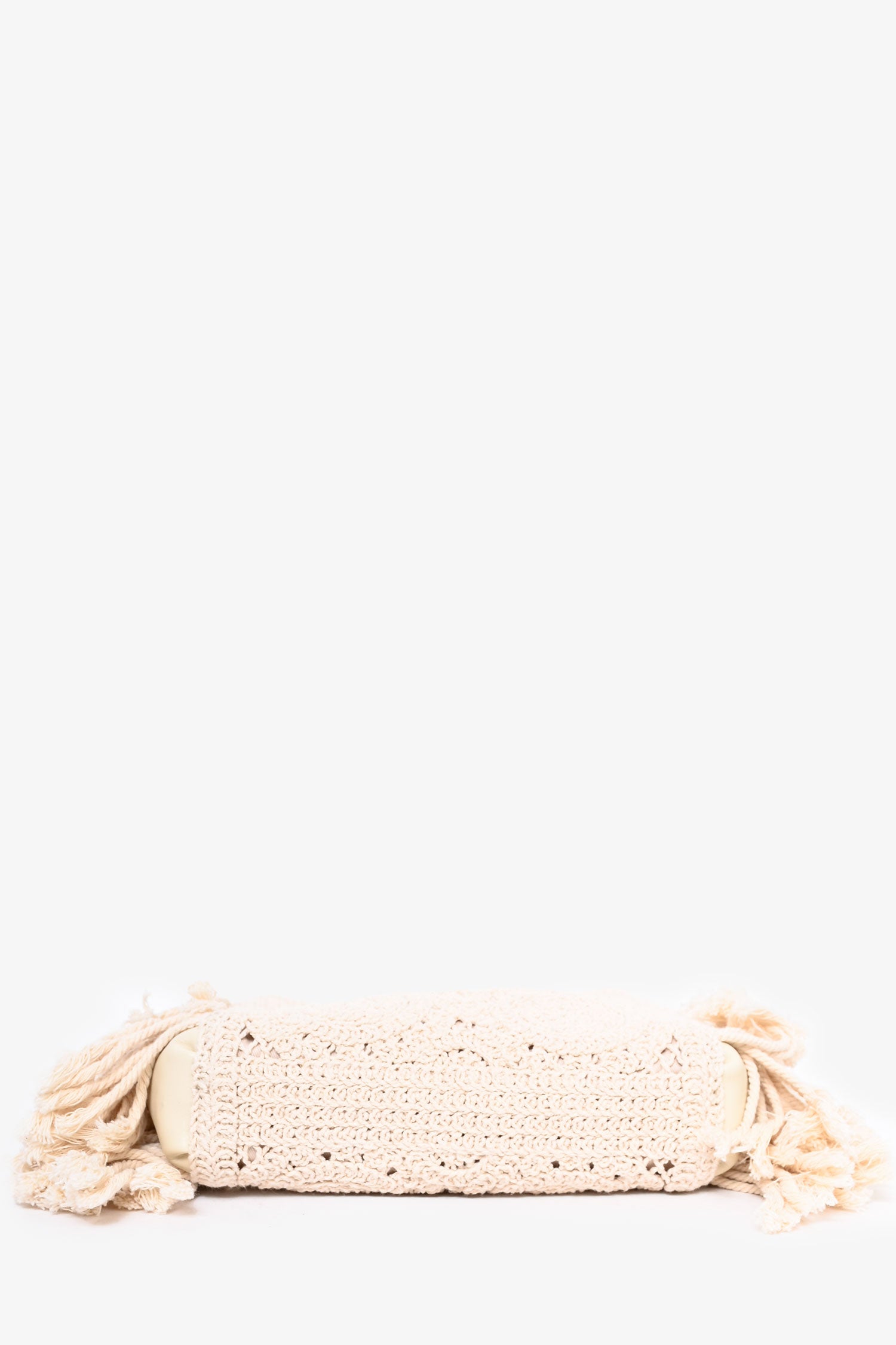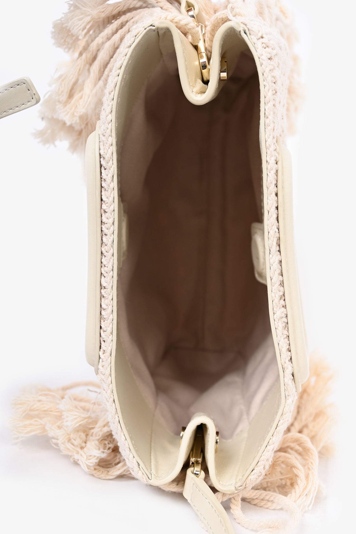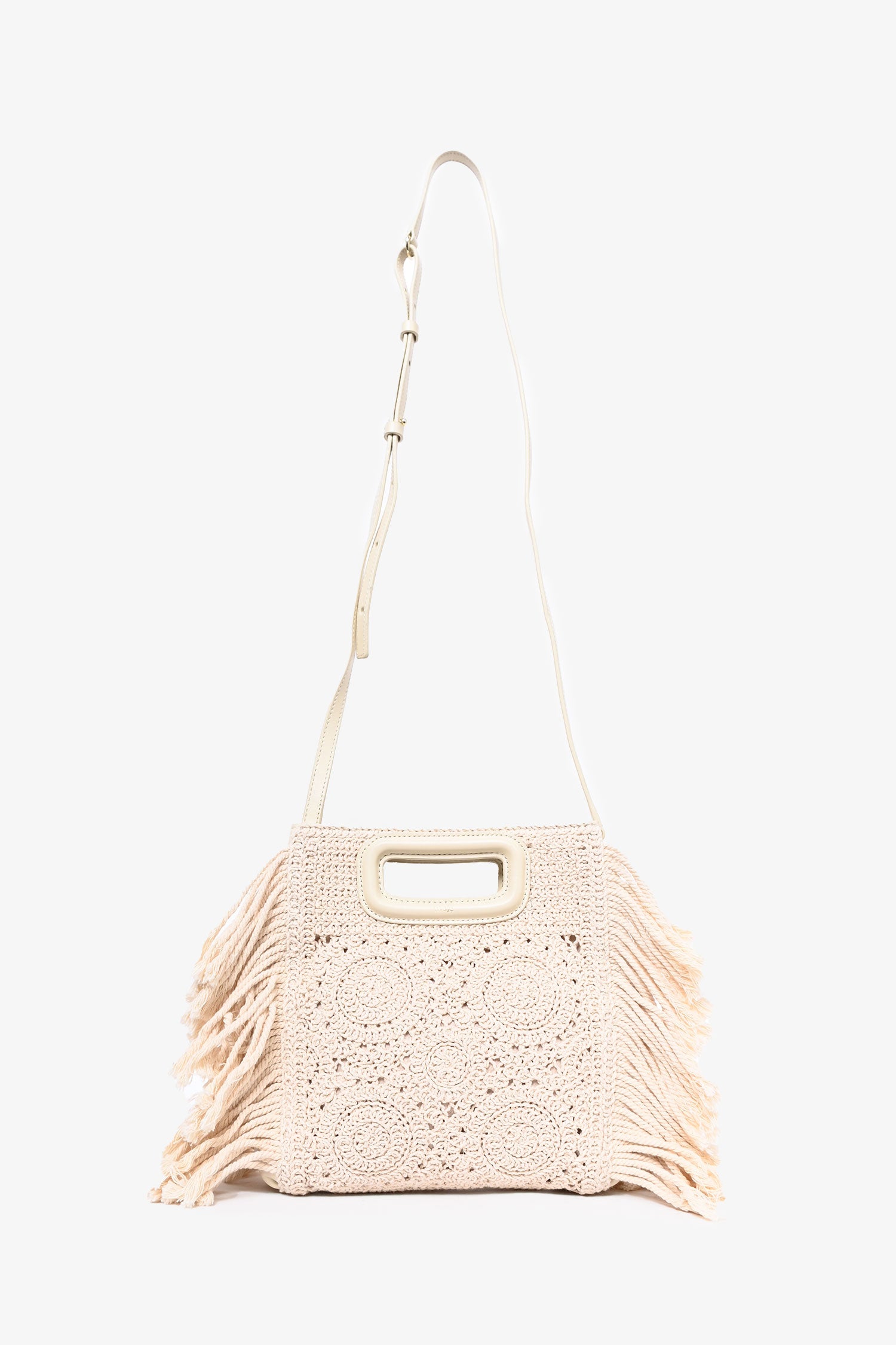 Refresh availabilityMaje Cream Canvas Fringe Bag. Leather trimming. Tonal stitching. Concealed snap closure. Detachable leather strap.