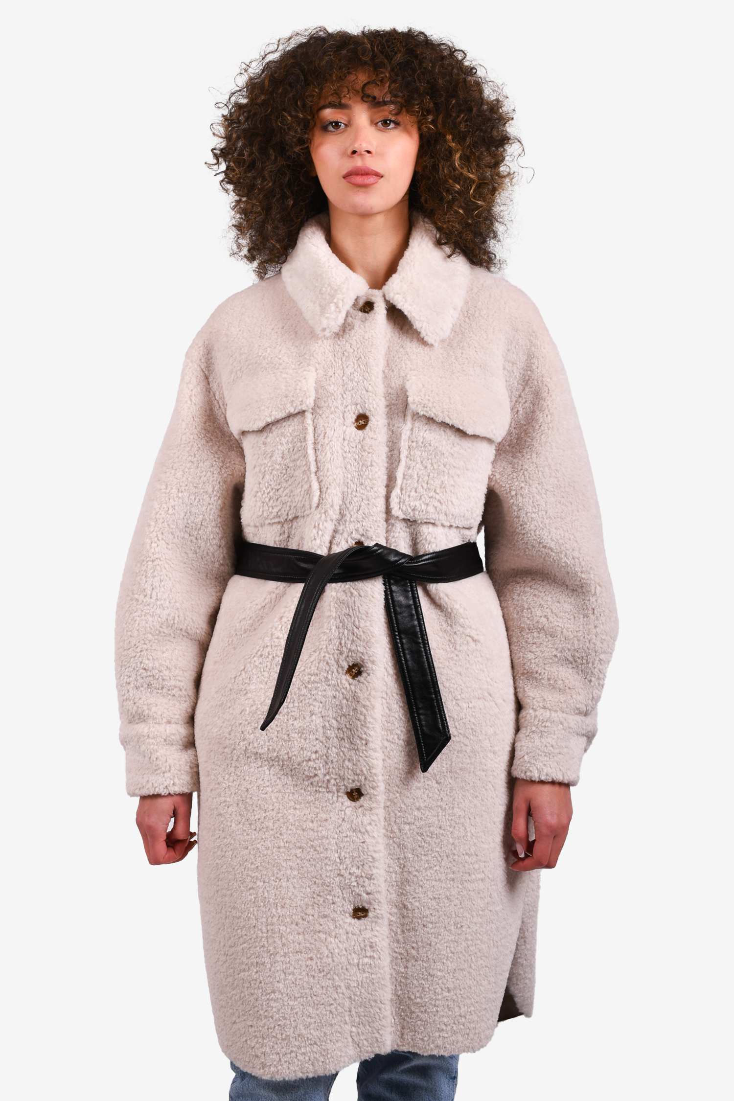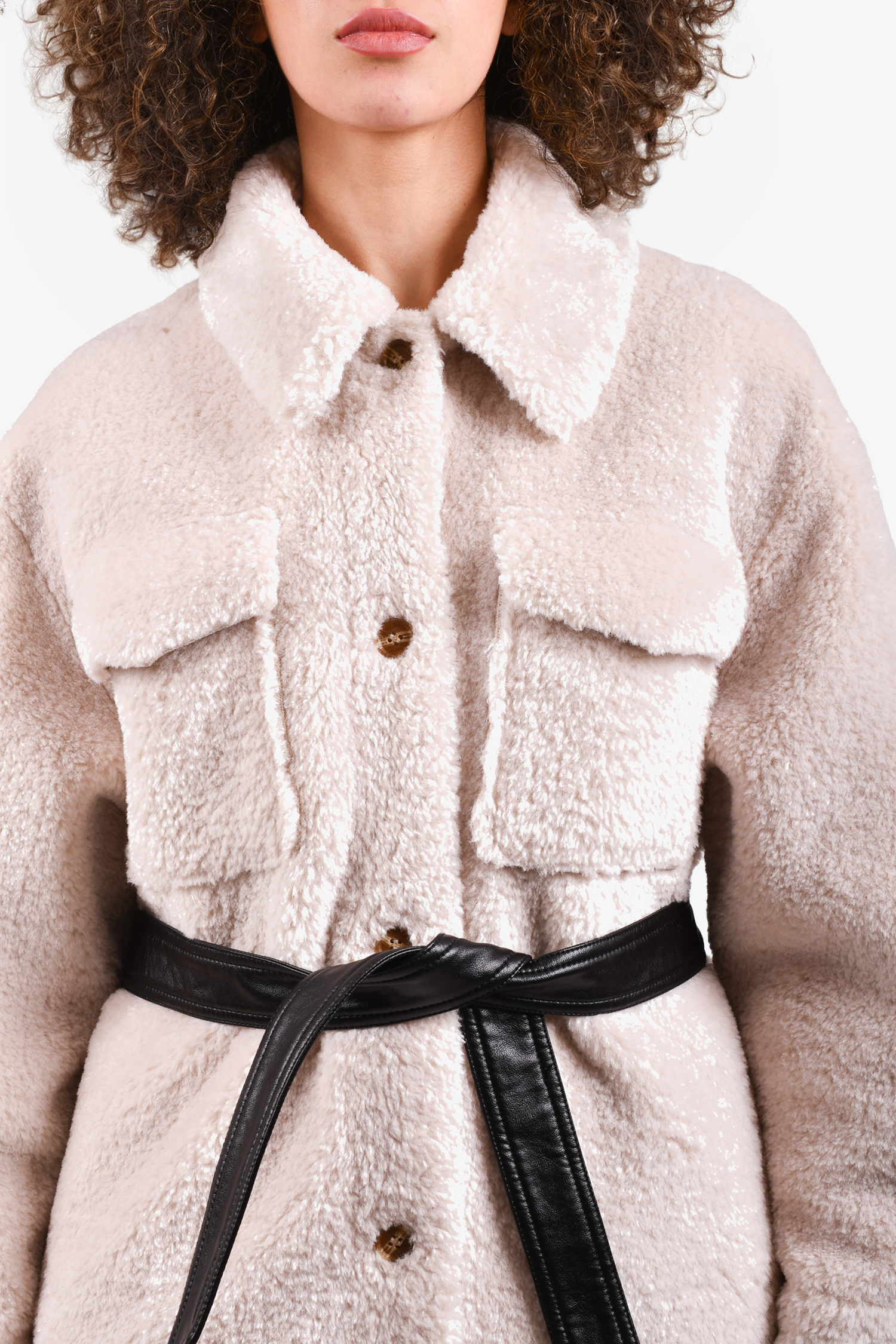 Refresh availabilityMaje Cream Faux Shearling Leather Belted Long Coat. Front button-up closure. Front pockets. Tonal stitching.