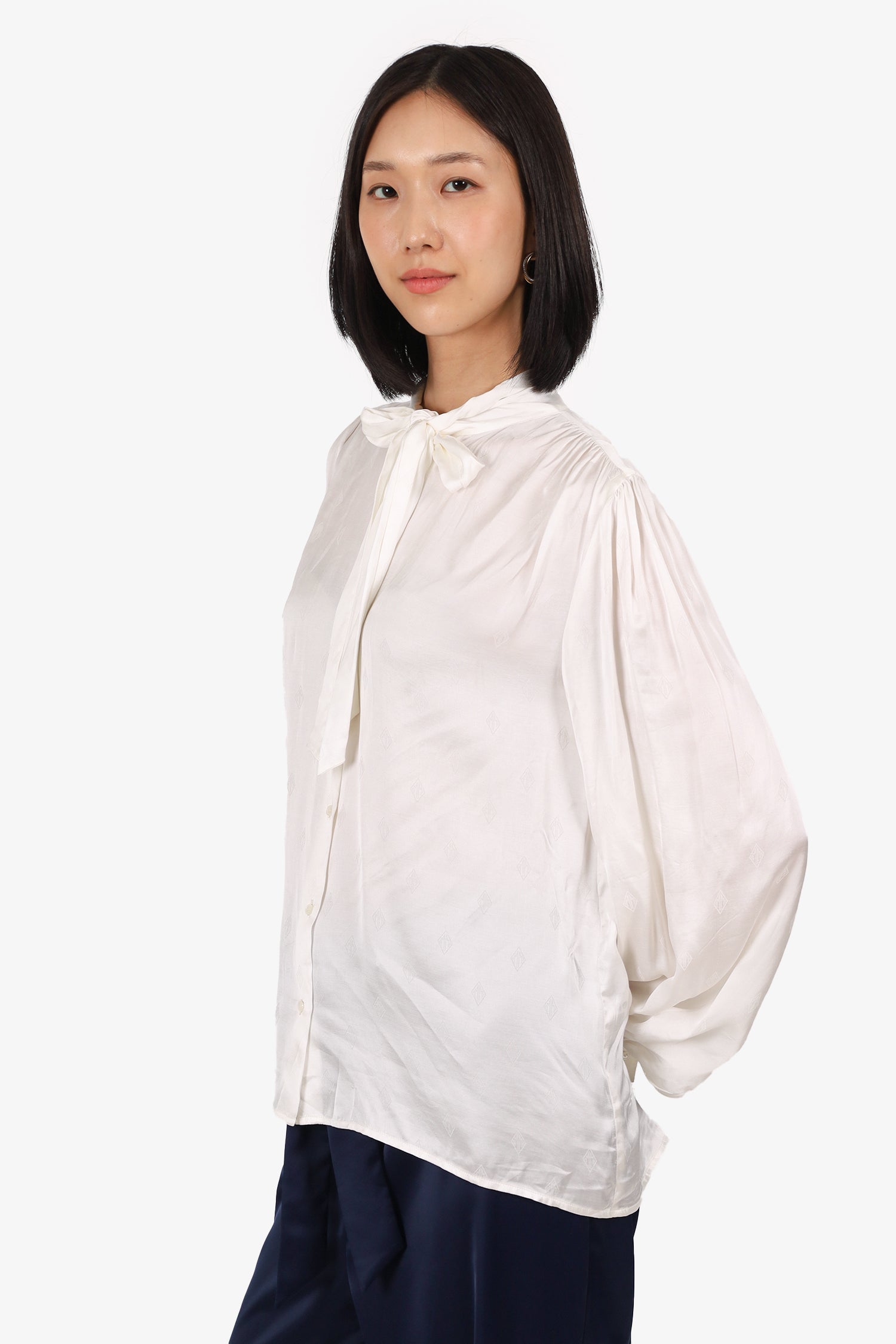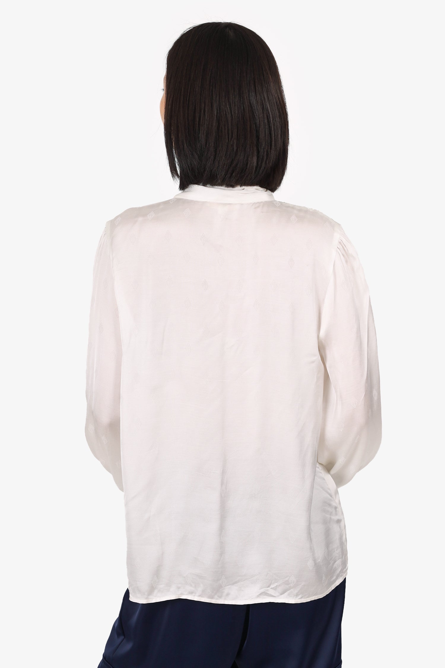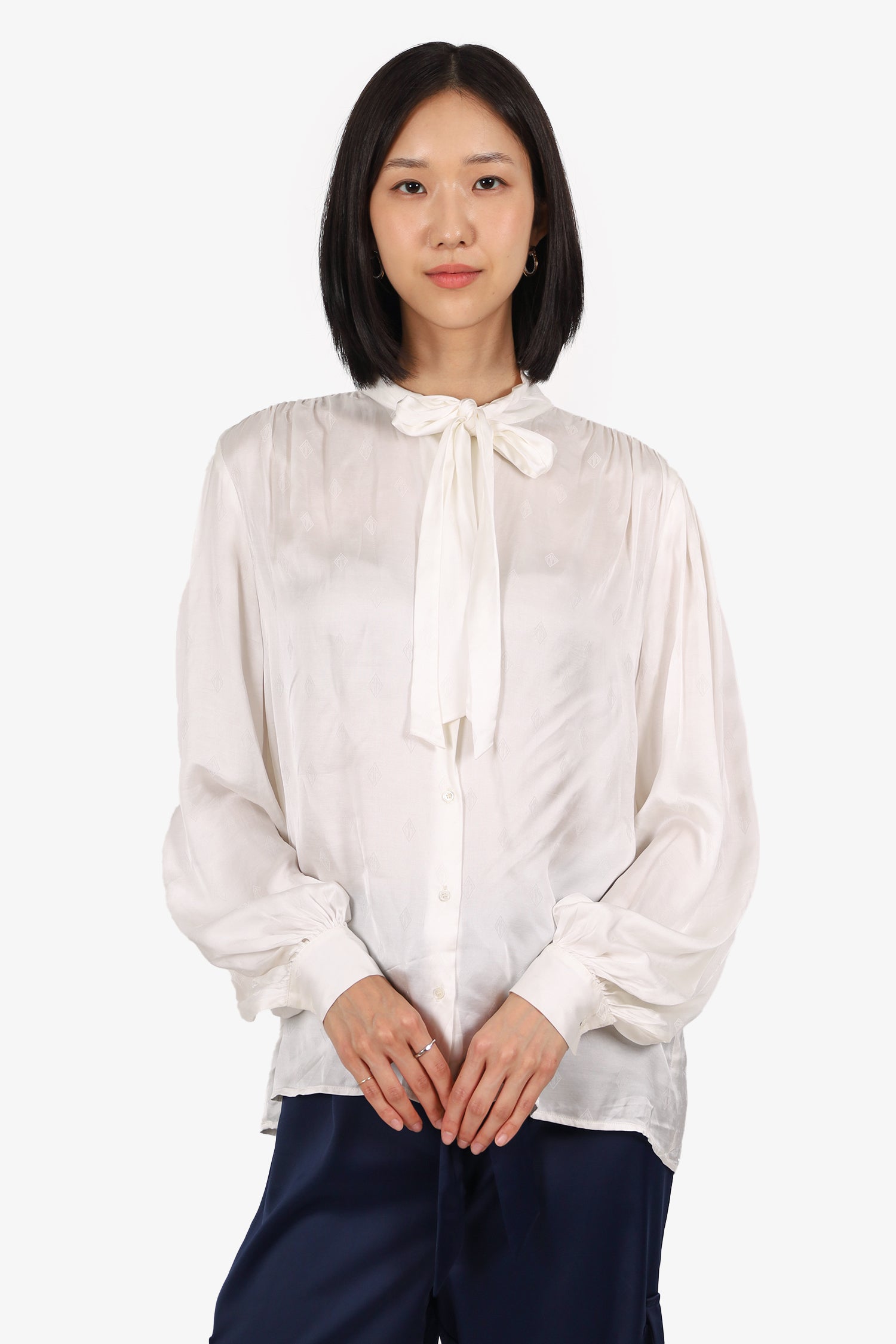 Refresh availabilityMaje Cream Satin Pussy Bow Blouse. Pull-on. Round neckline. Front button-up closure with tie-up closure at neckline. Sleeve cuffs with button-up closure. Tonal stitching.