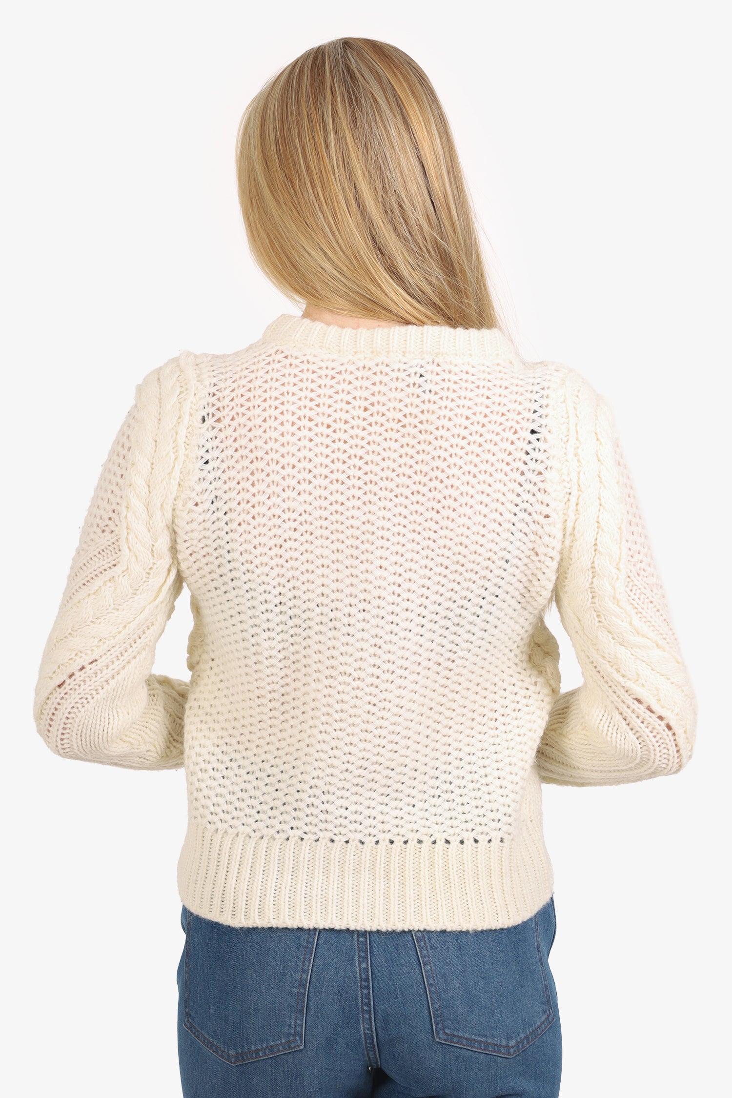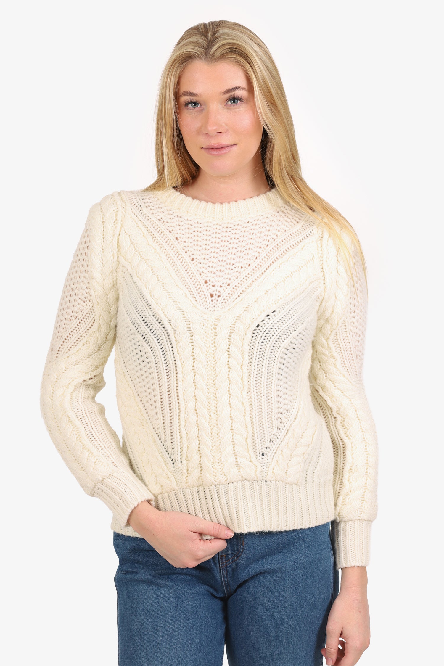 Refresh availabilityMaje Cream Wool Knit Sweater. Pull-on. Round neckline. Perforated body. Tonal stitching.