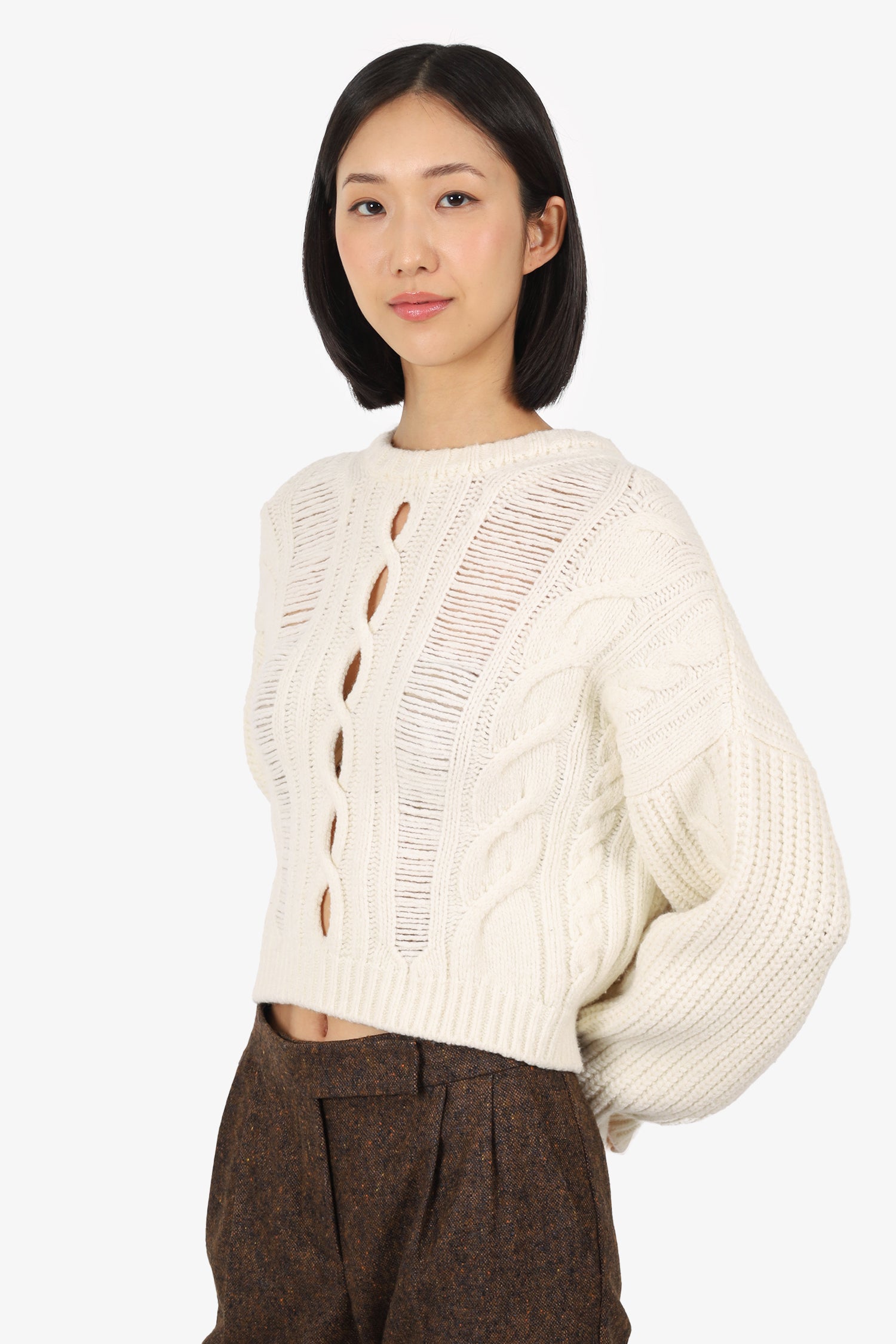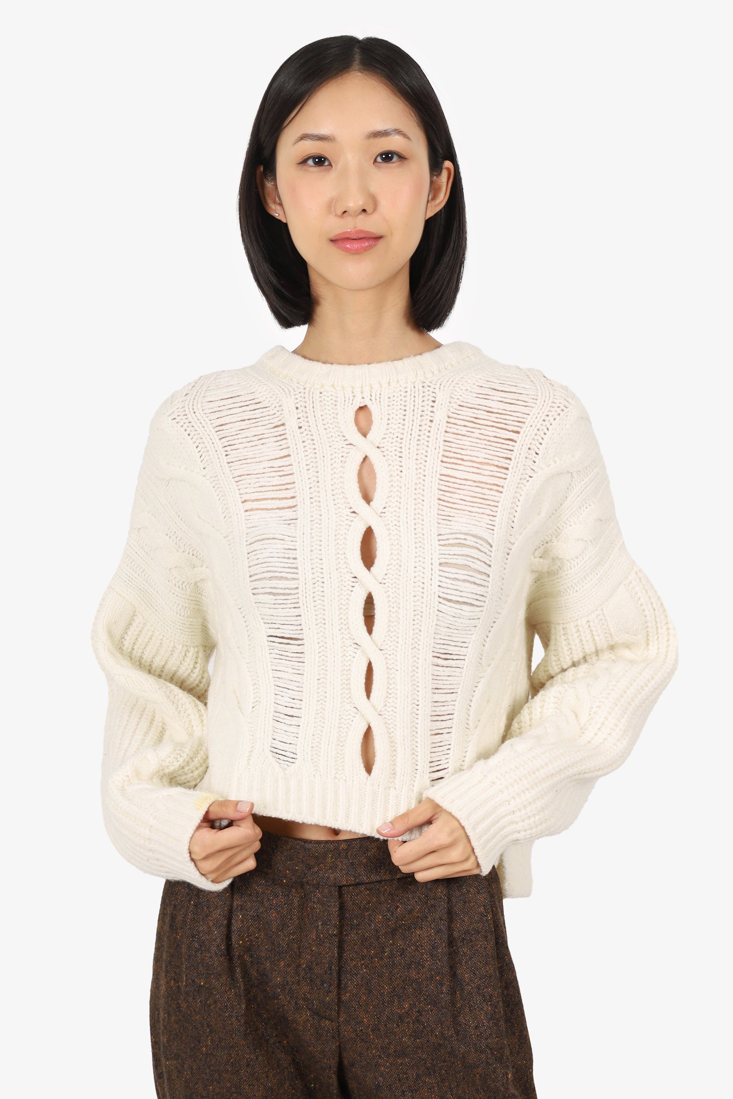 Refresh availabilityMaje Cream Wool martina Cable-knit Sweater. Pull-on. Round-neckline. Front cut-outs. Tonal stitching.
