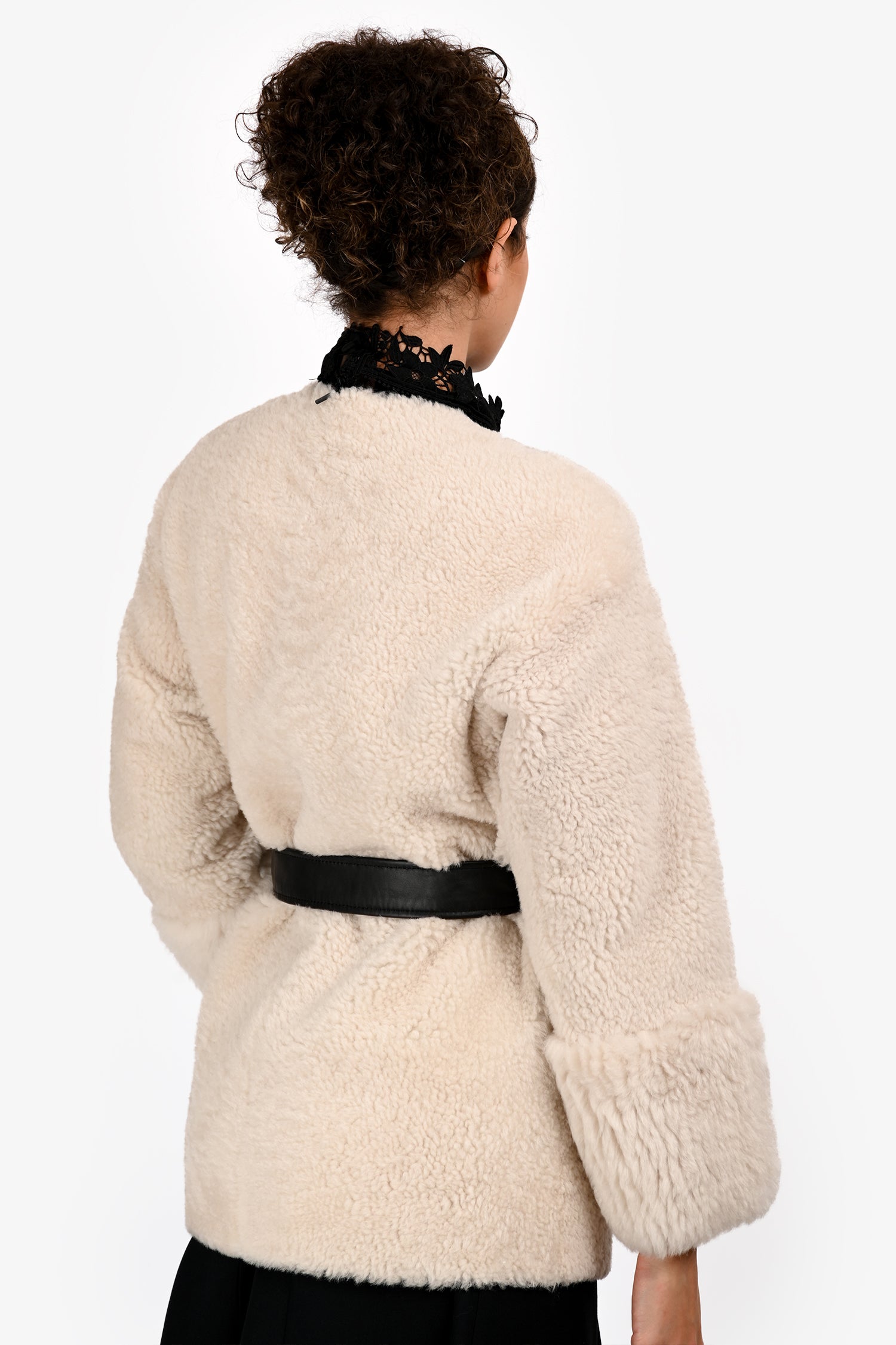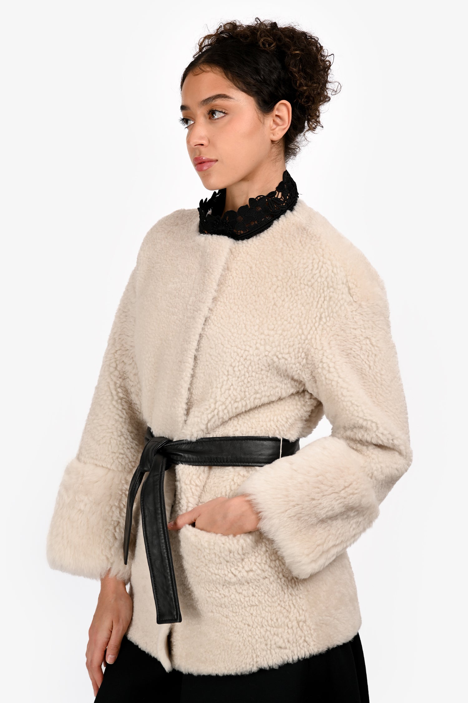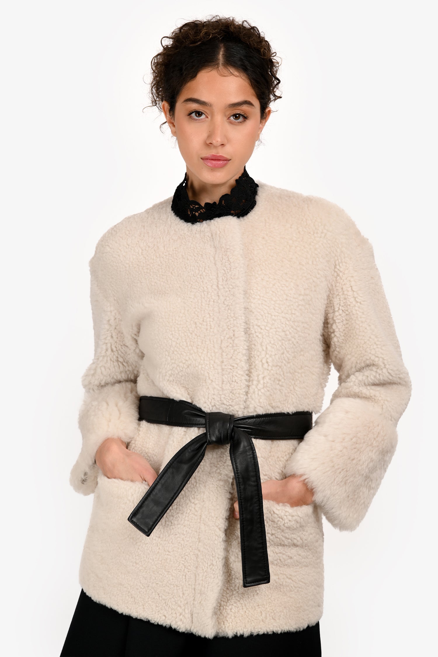 Refresh availabilityMaje Faux White Shearling Belted Jacket. Pull-on. Round neckline. 2 front slip pockets. Leather-lined interior. Silver-tone hardware. Tonal stitching.