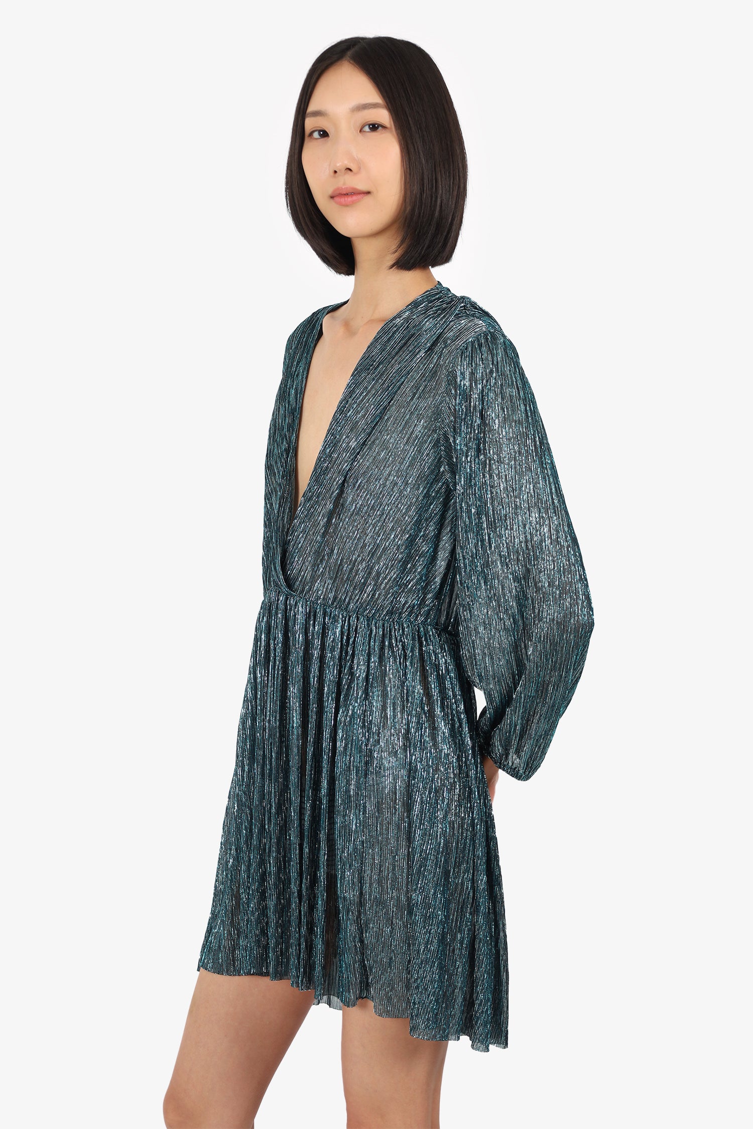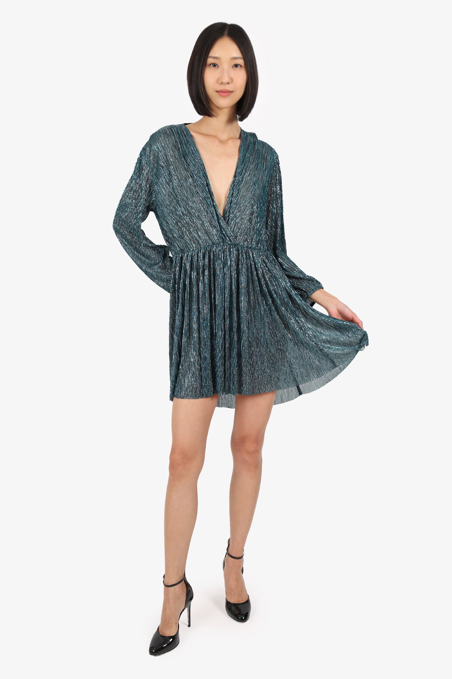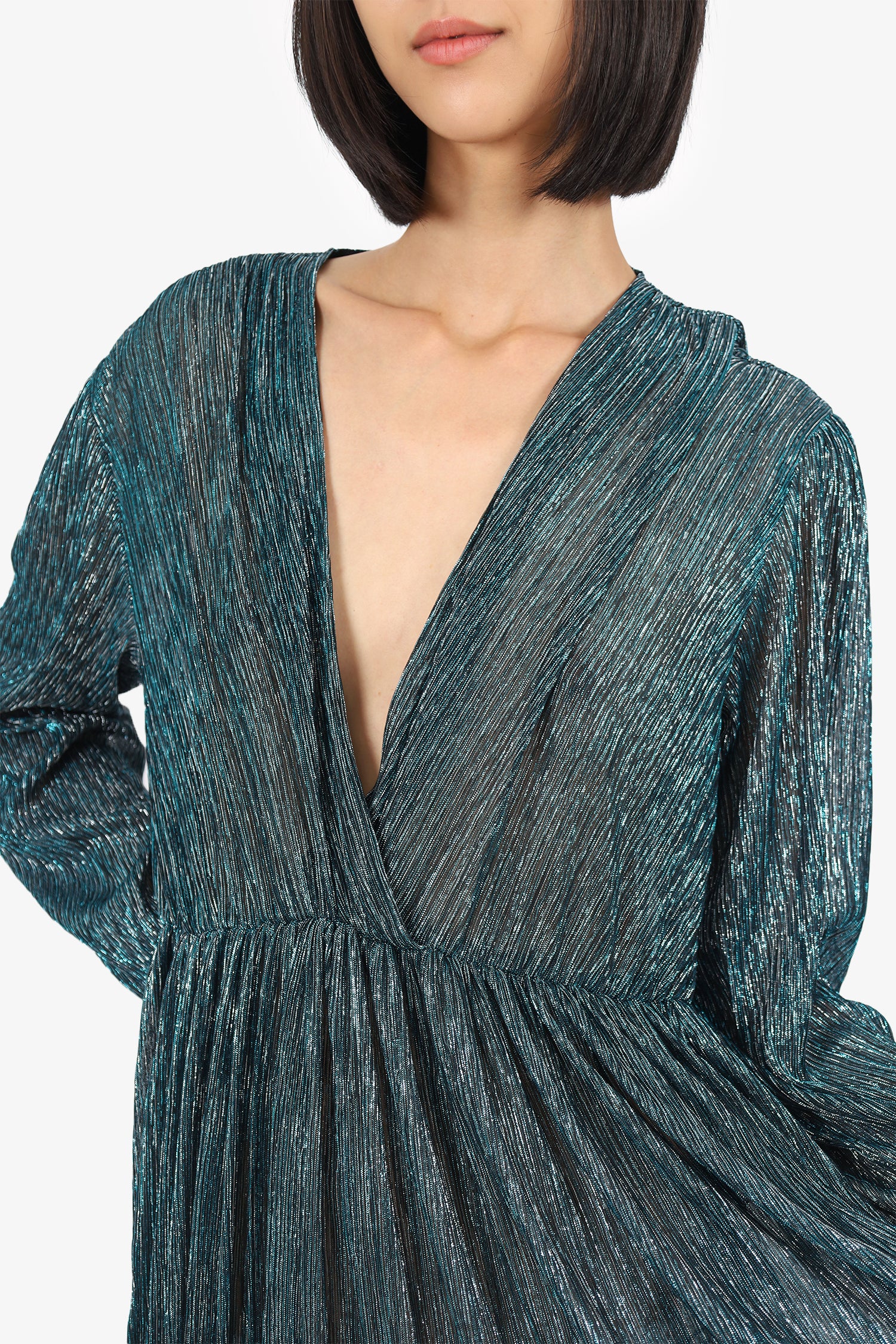 Refresh availabilityMaje Green Glitter Ruffle Maxi Dress. Slip-on. Plunge V-neckline. Elasticated waistband and sleeve cuffs. Semi-sheer body. Tonal stitching.