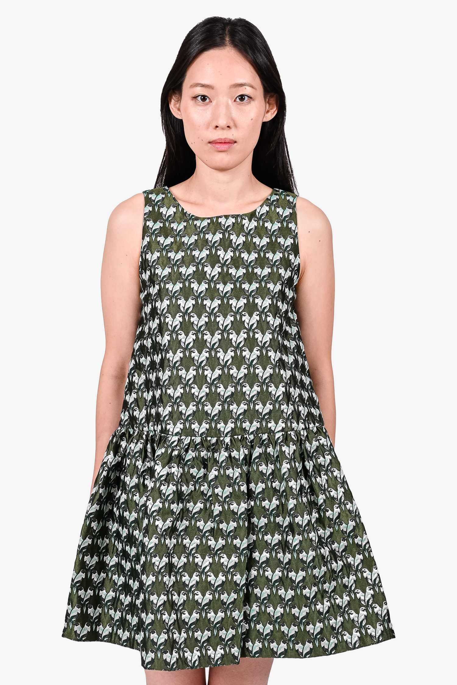 Refresh availabilityMaje Green/Silver Parrot Printed Sleeveless Dress. Round neck. Rear zip closure. Lined. Tonal stitching.