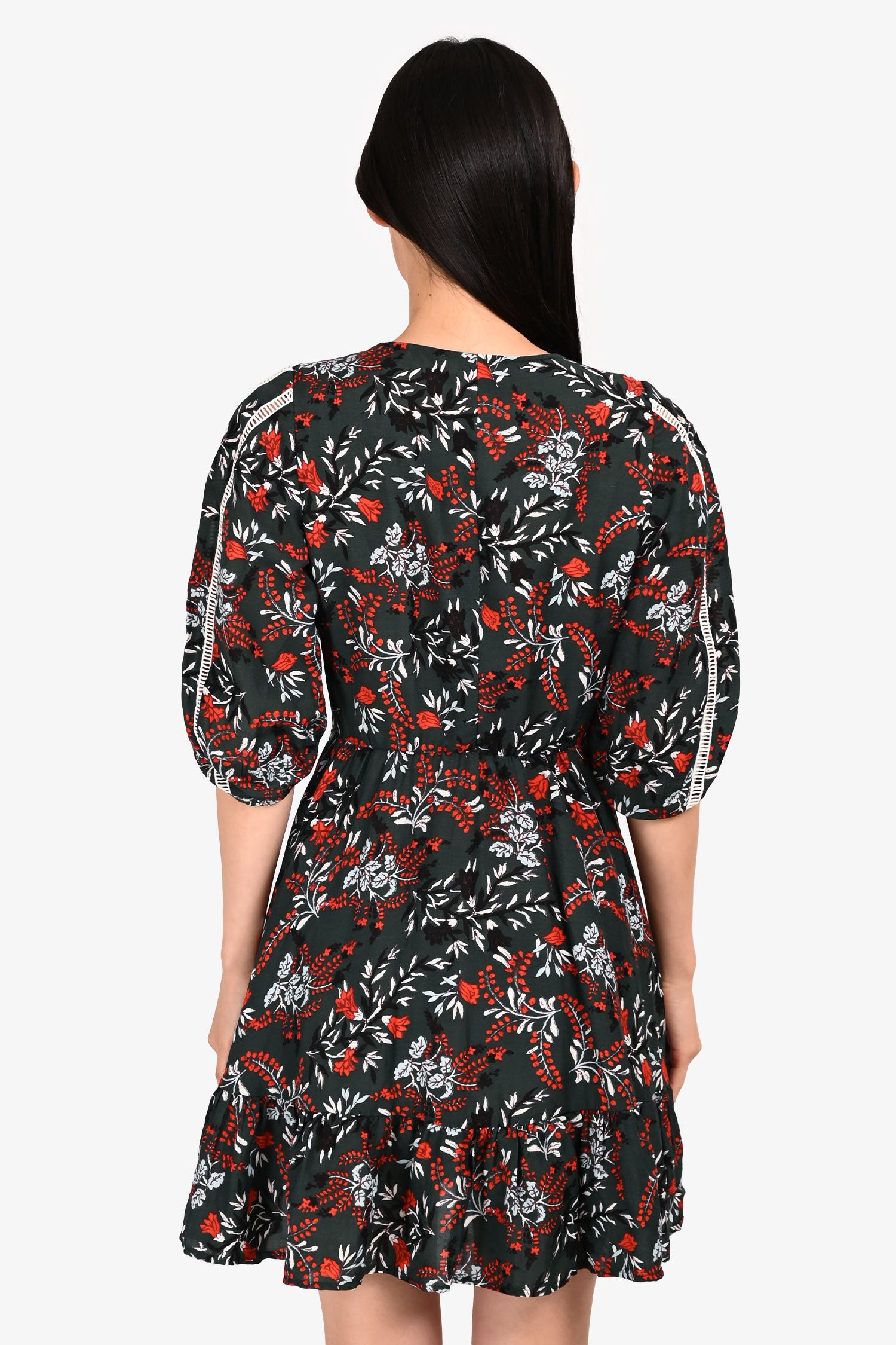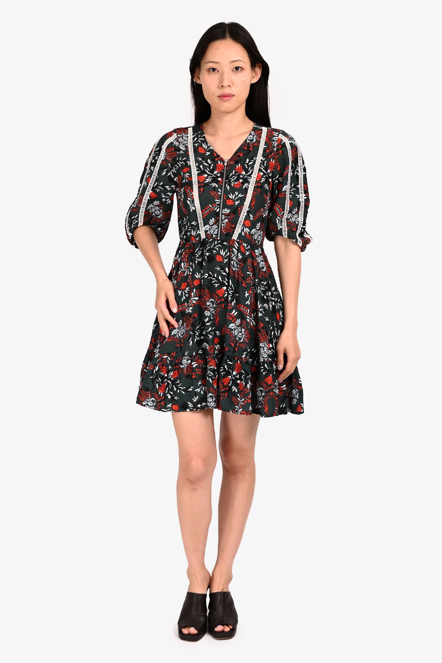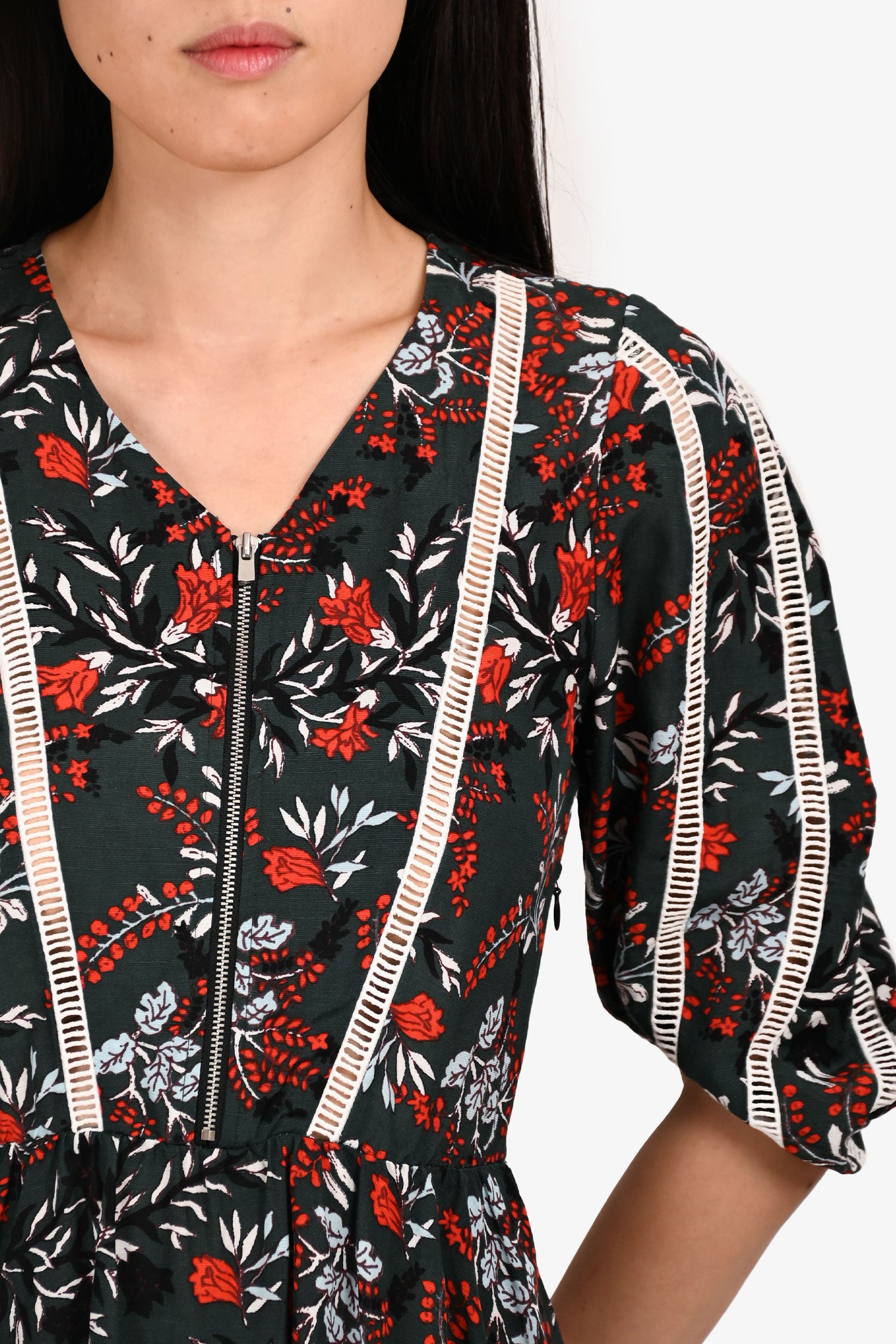Maje Green/Red Floral Zip-Up Midi Dress Size 1