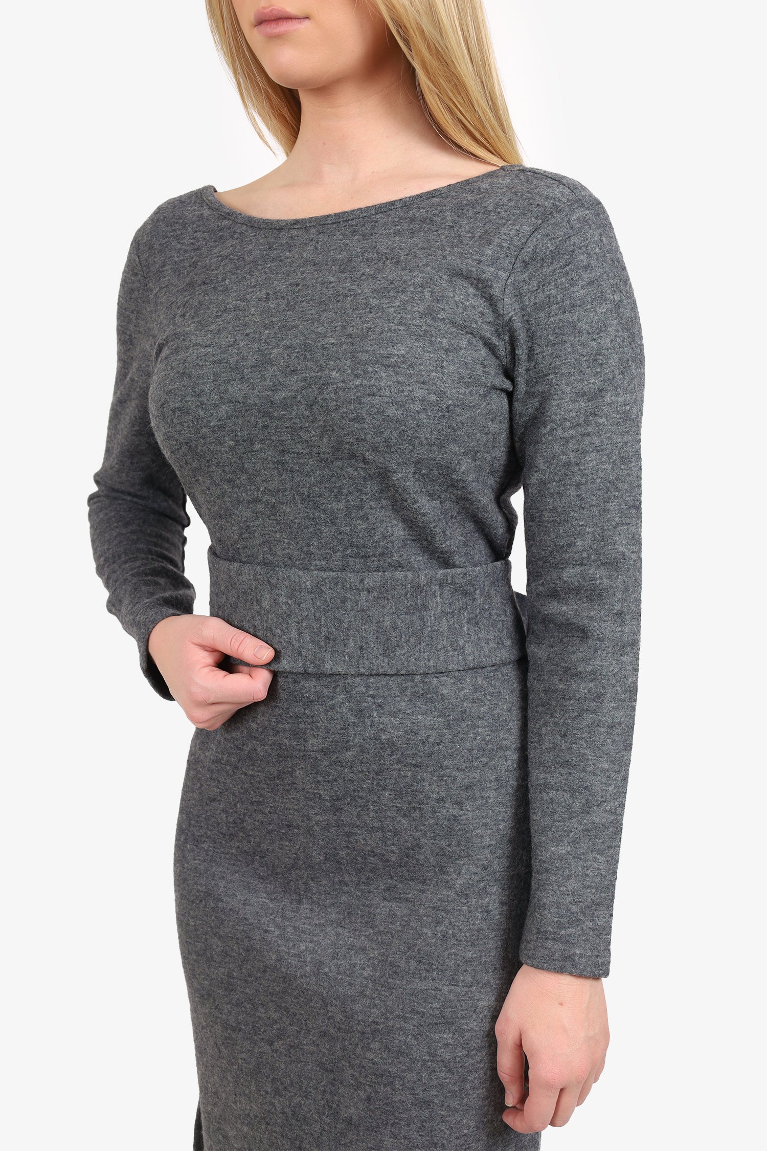 Refresh availabilityMaje Grey Wool Belted Long Sleeve Midi Dress. Slip-on. Round neckline. Front belt tie-up closure. Tonal stitching.