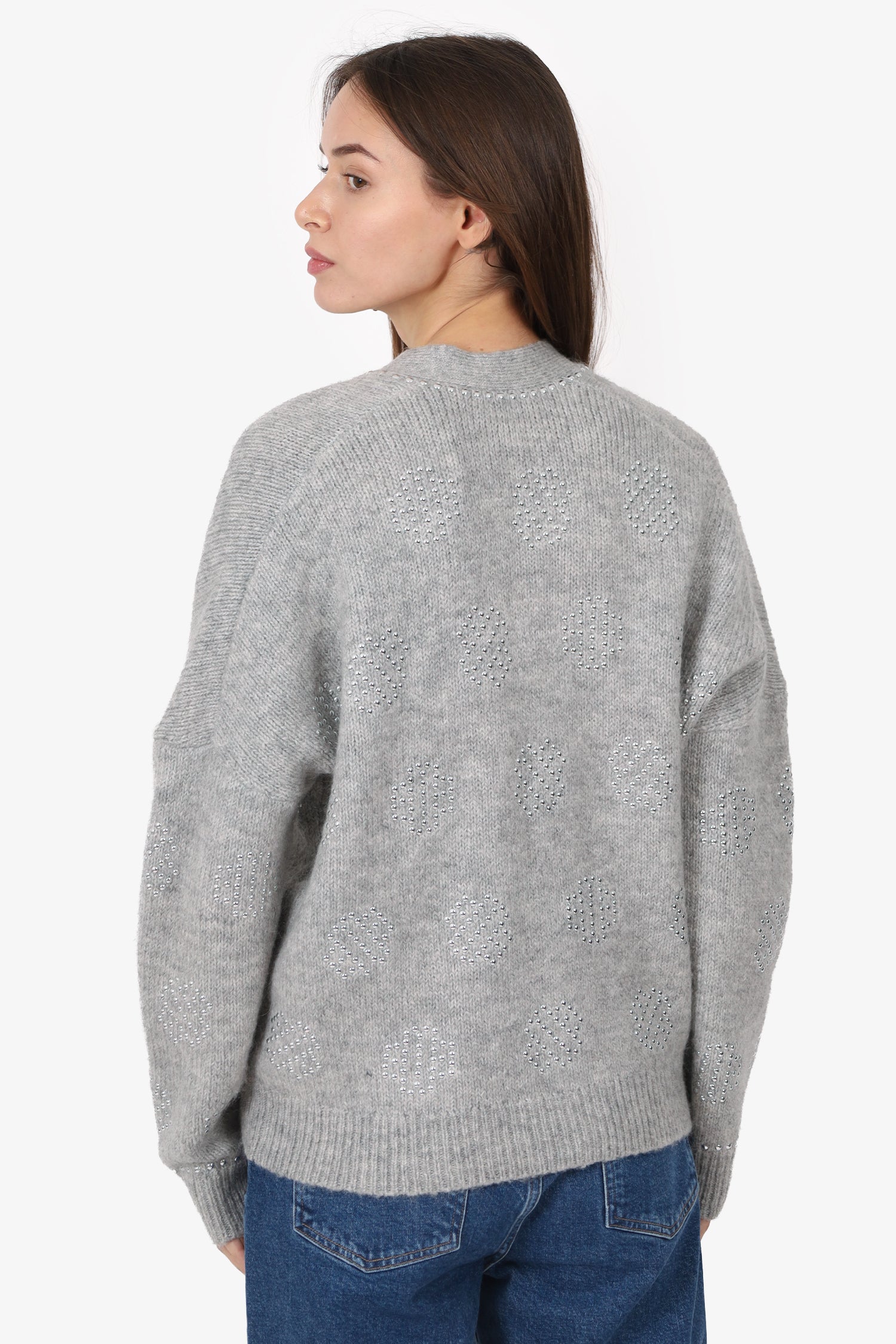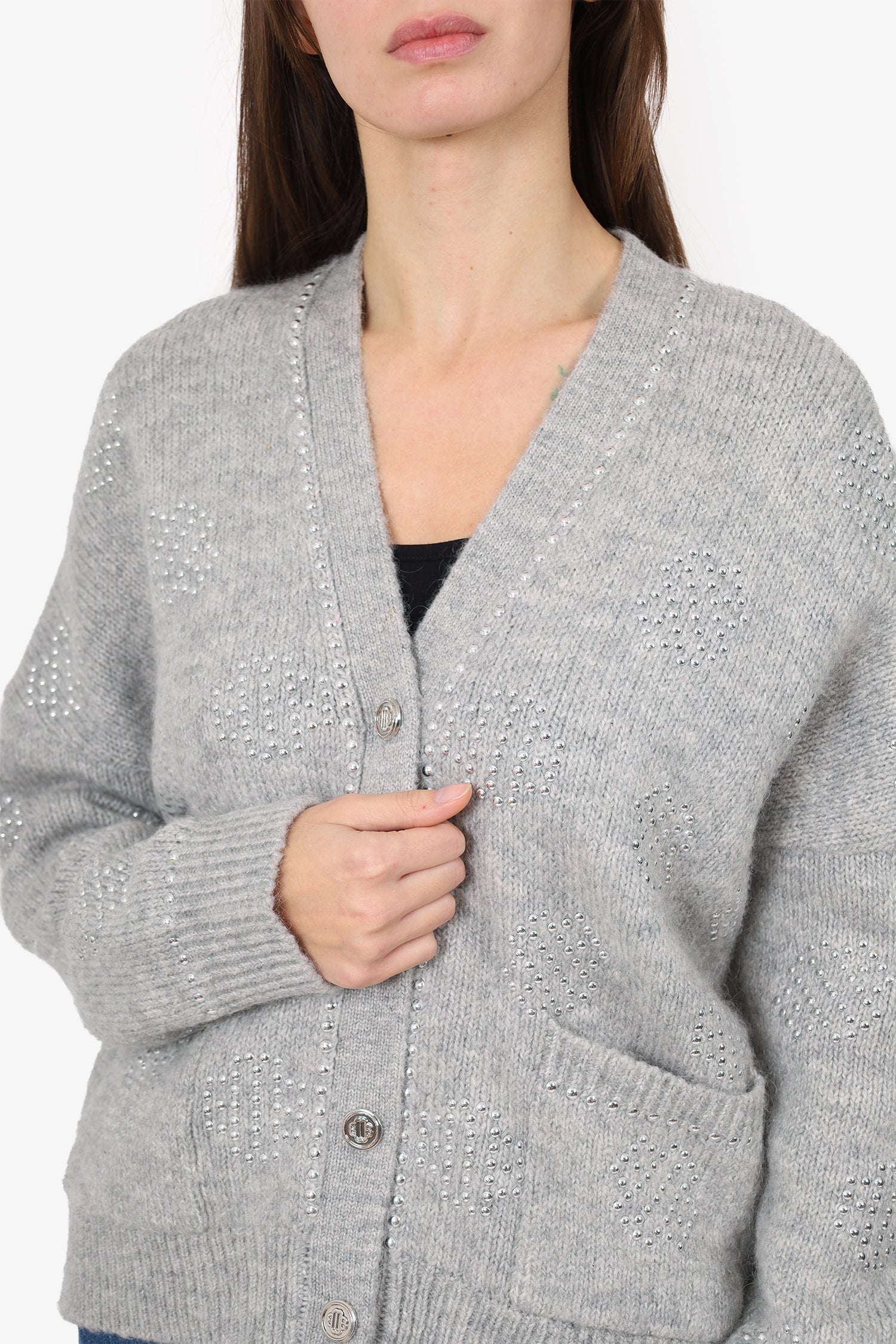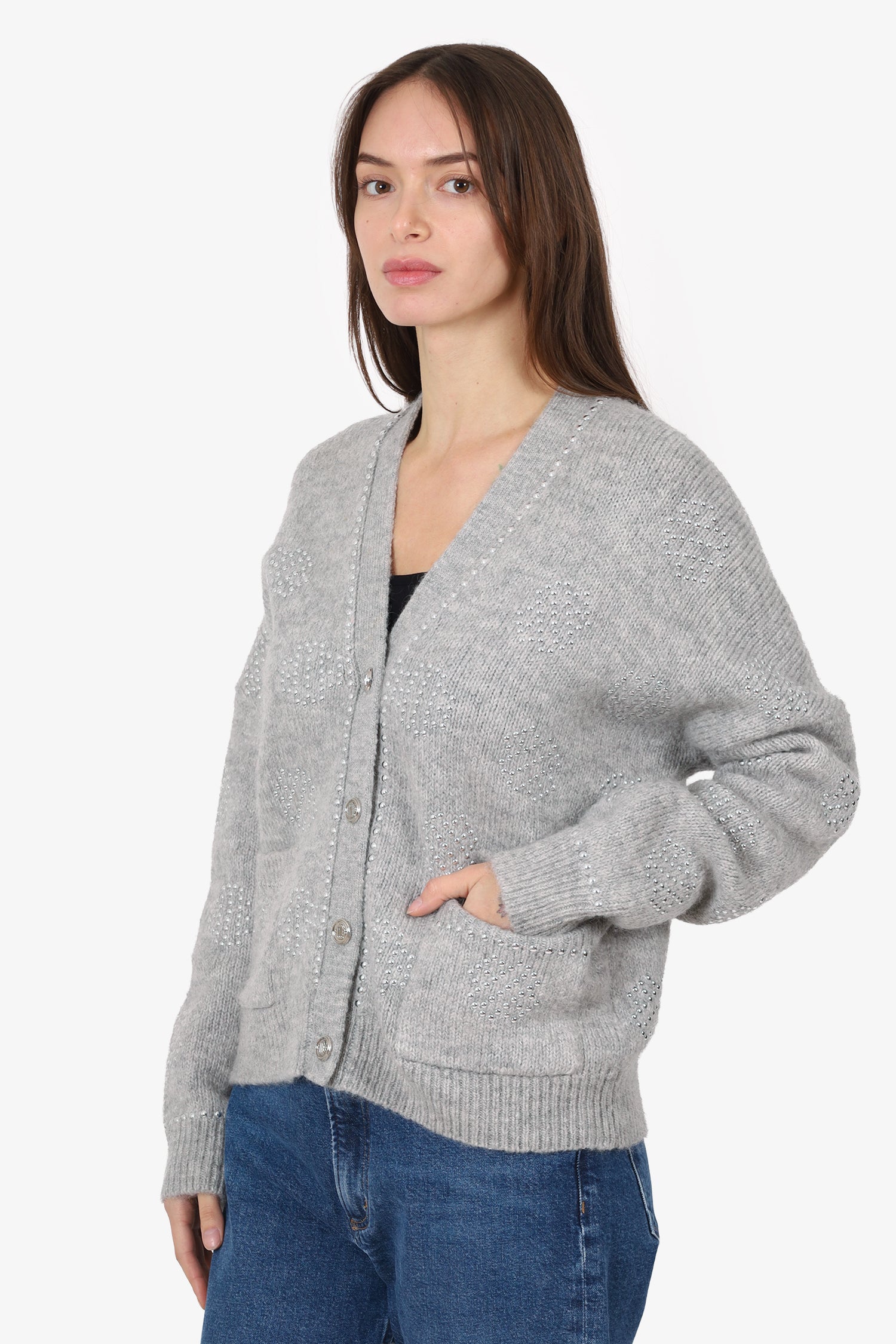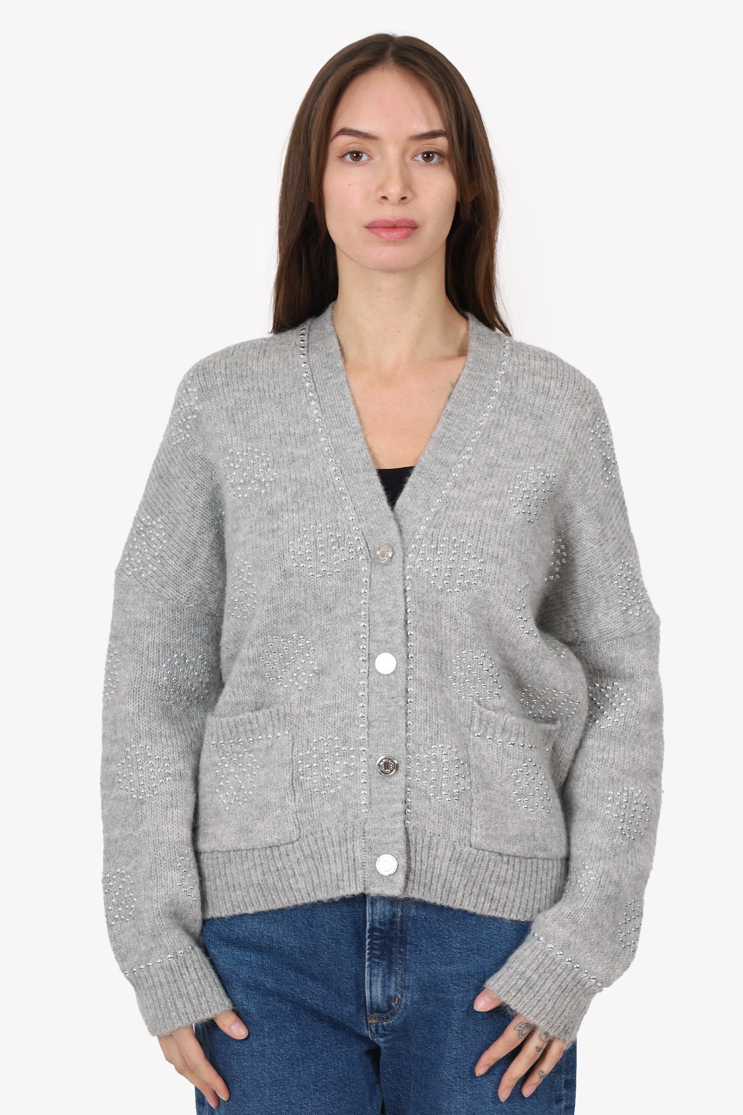 Refresh availabilityMaje Grey Wool Cardigan. Pull-on. V-neckline. Front snap button-up closure. 2 exterior front slip pockets. Silver-tone hardware. Tonal stitching.