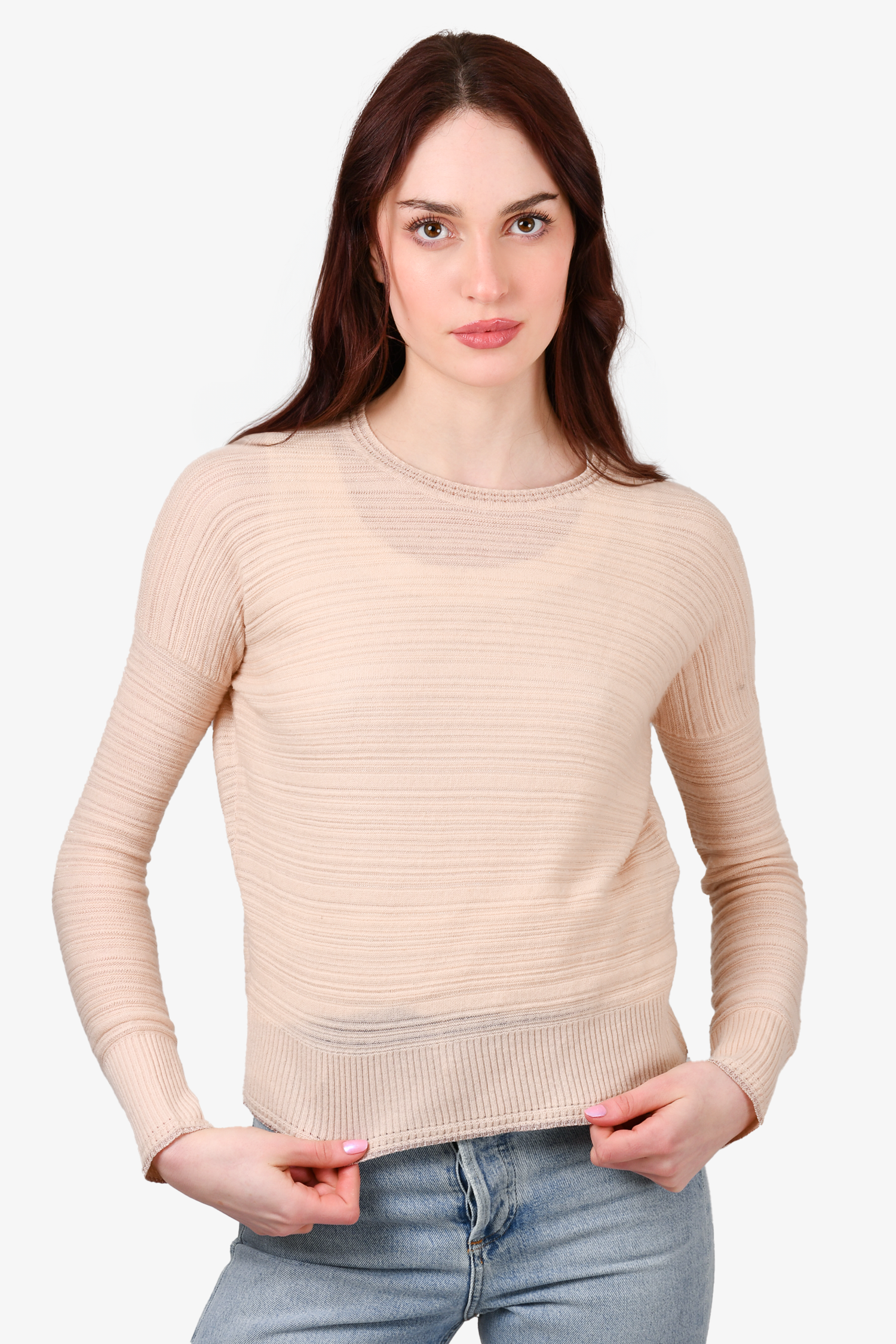Refresh availabilityMaje Light Pink Shimmer Wool Crewneck Sweater. Pull-on. Round neck. Ribbed neck, cuffs and hem. Tonal stitching.