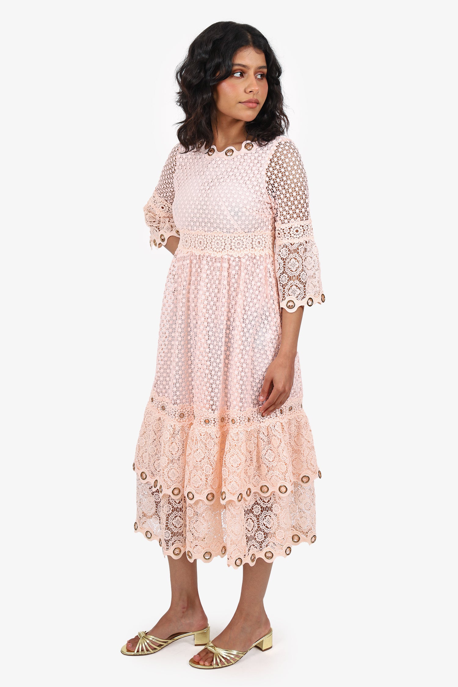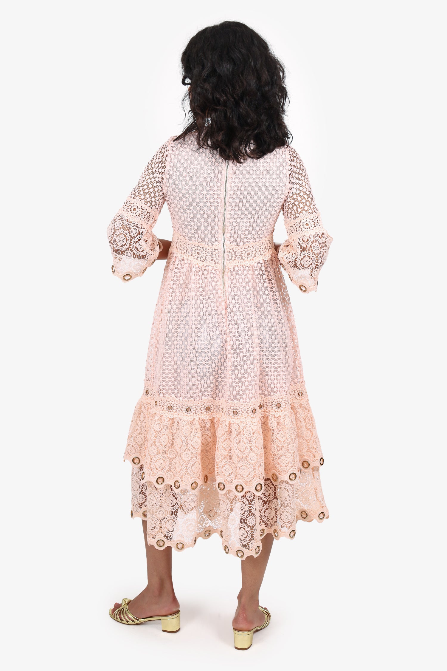 Refresh availabilityMaje Pink Lace Tiered Dress. Slip-on. Round neckline. Scalloped-hem and grommet detail at neckline, sleeve cuffs and bottom hem. Rear zip closure. Lined interior.