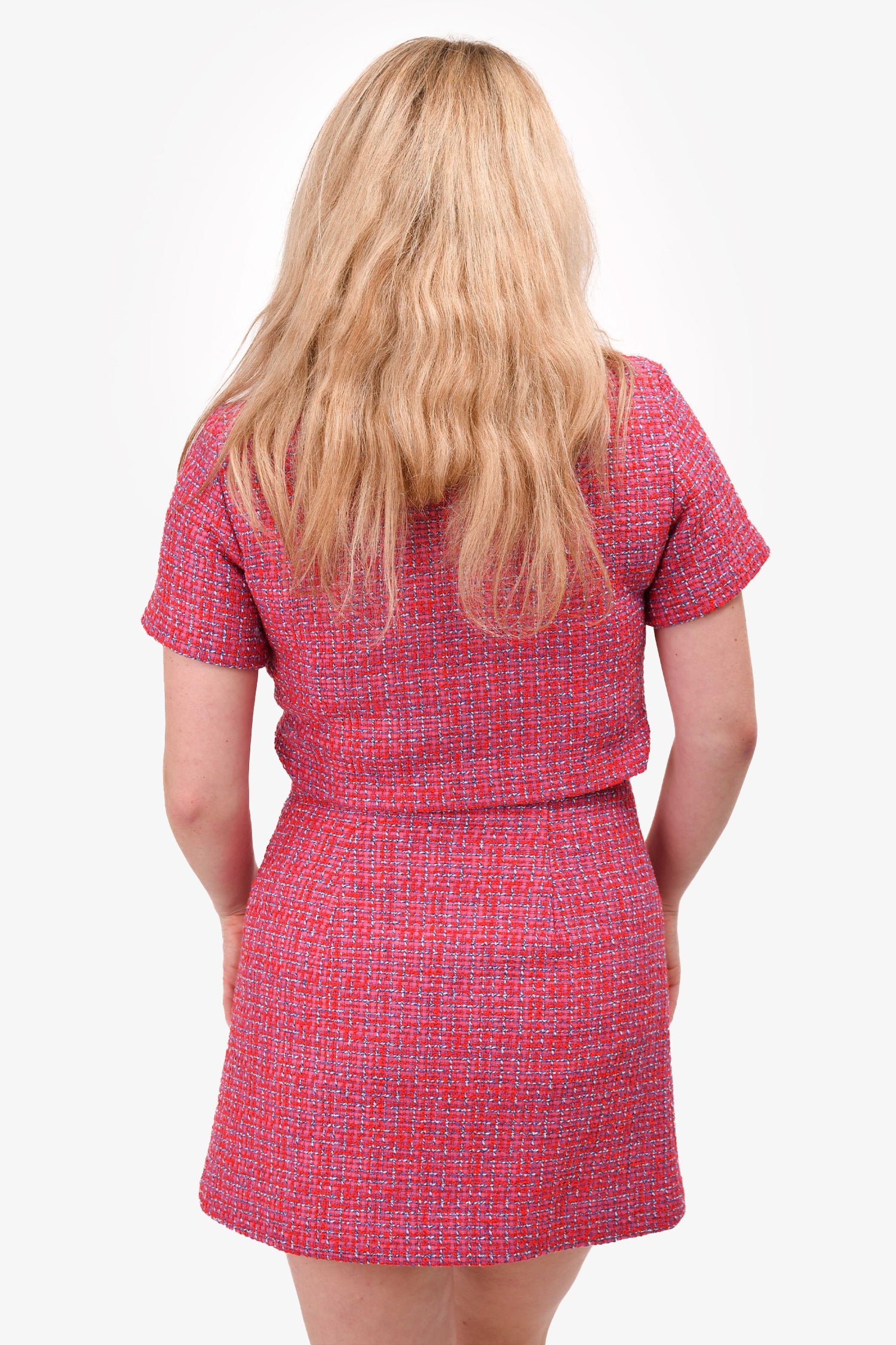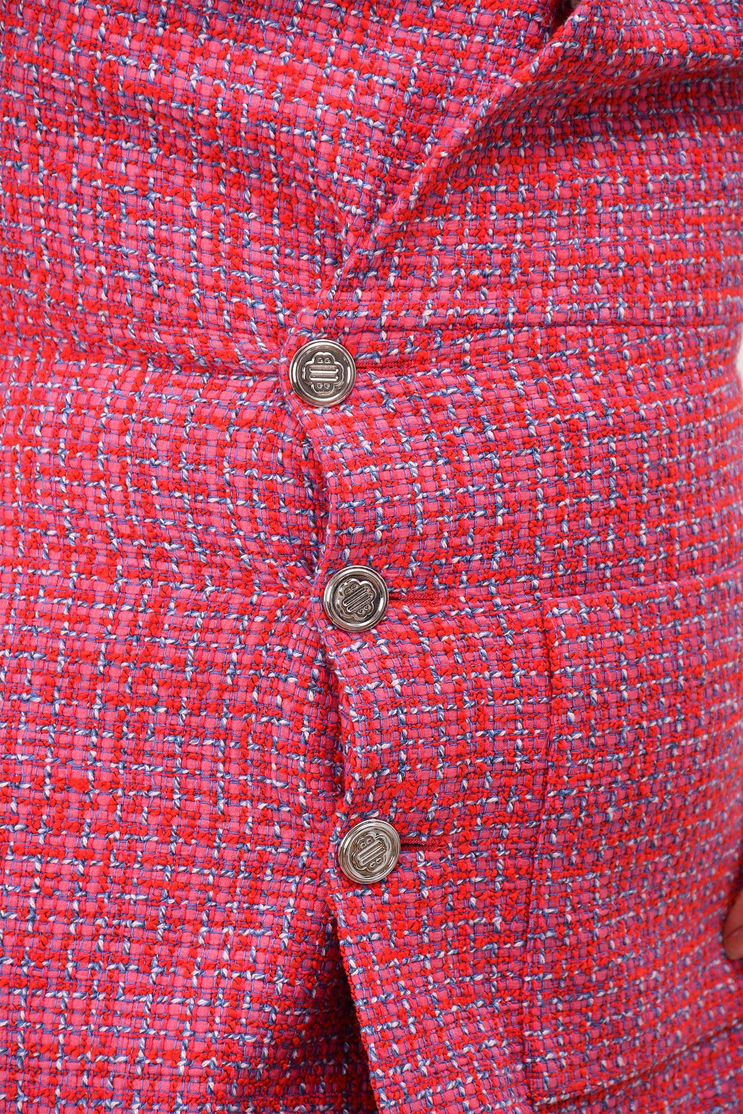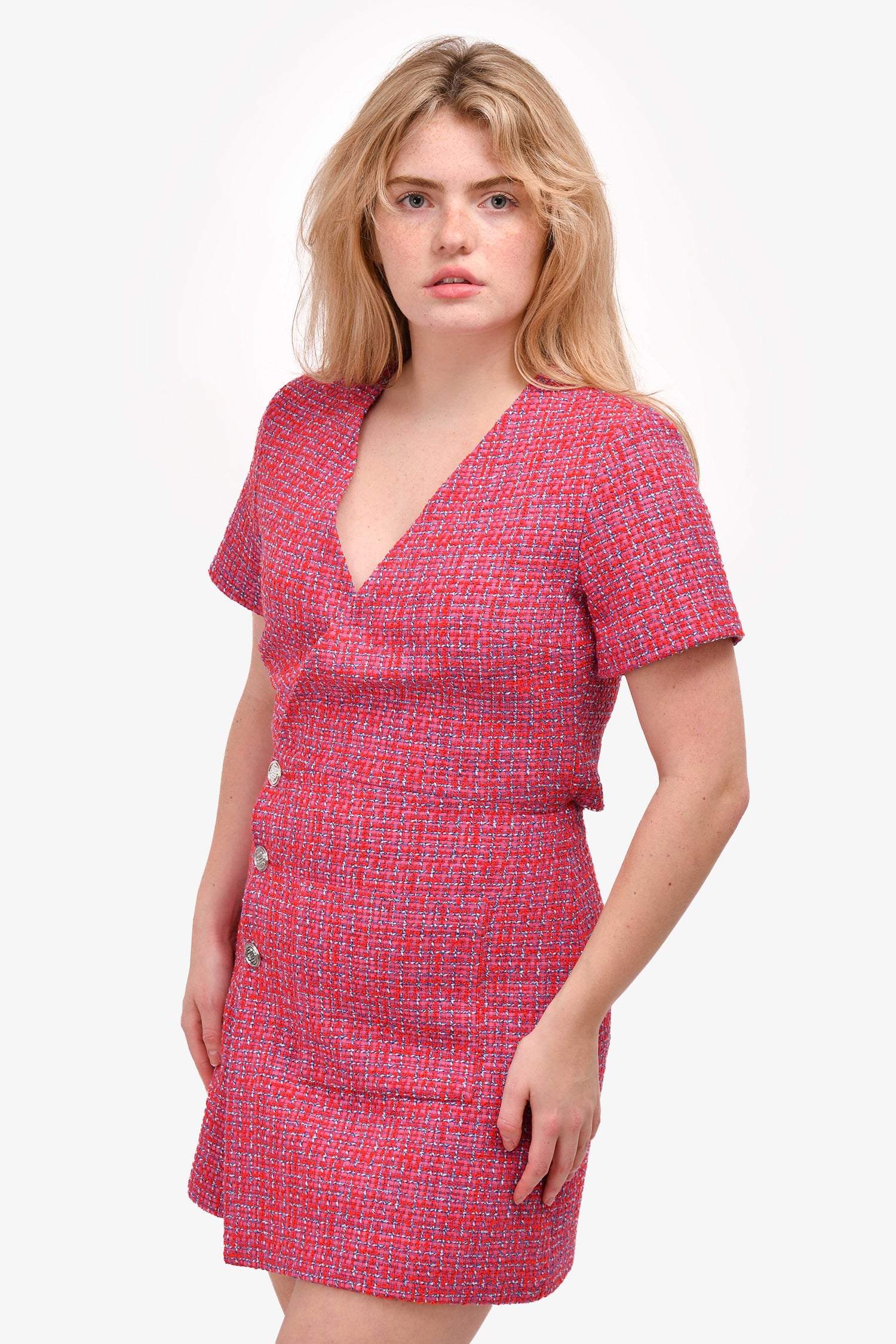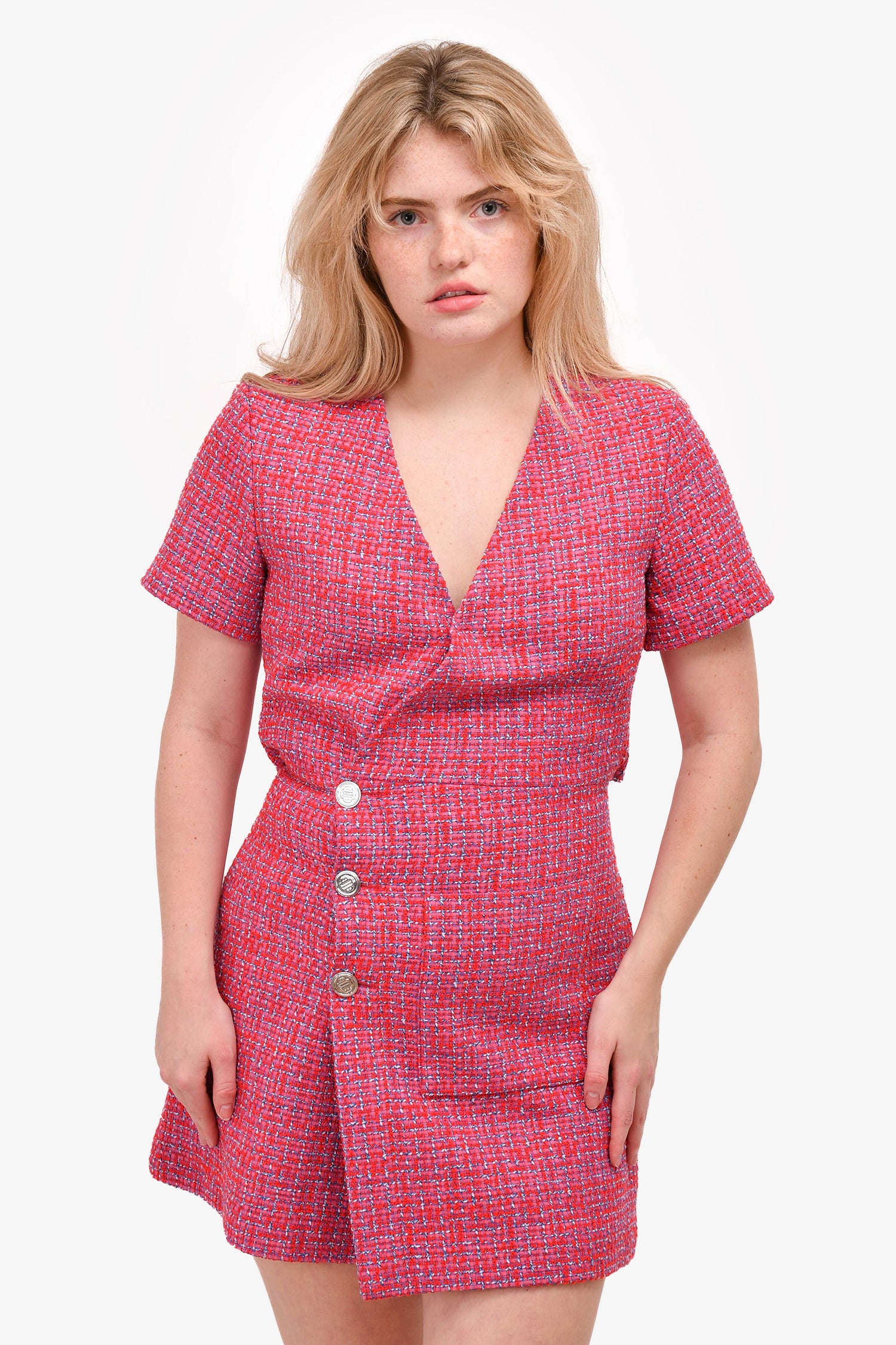 Refresh availabilityMaje Pink Tweed Asymmetrical Buttoned Dress. Silver-tone hardware. Front button-up closure. With snap-on closure at the top. One front pocket. Opening on the back. Tonal stitching.