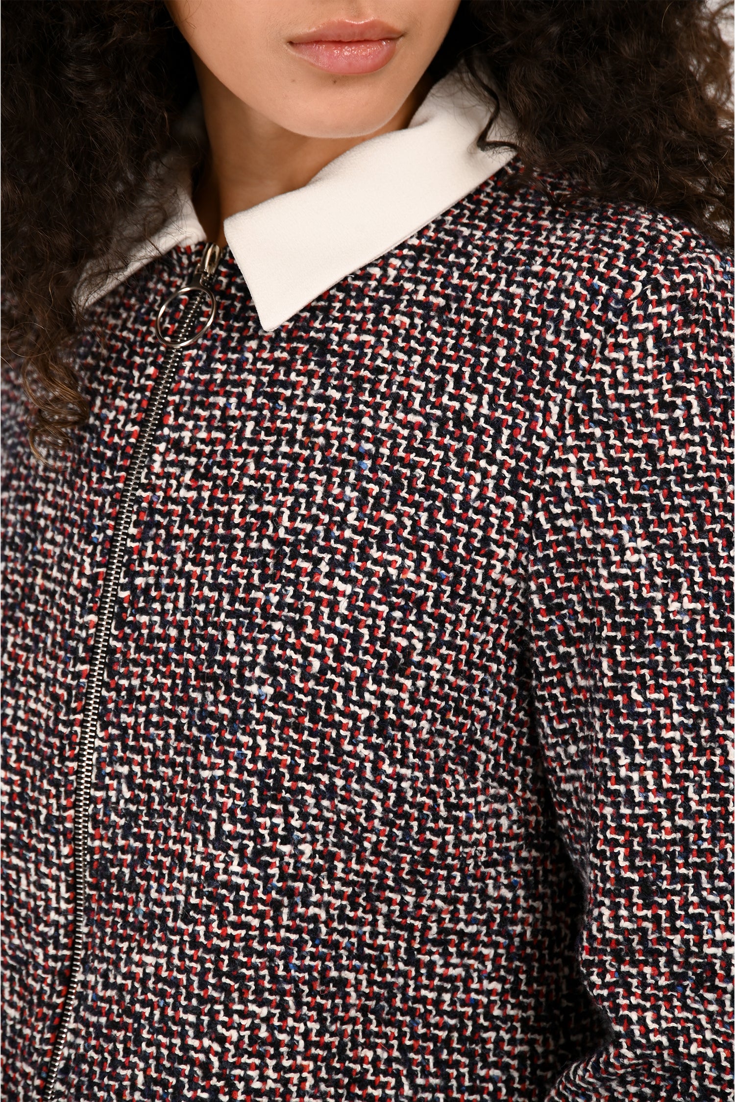 Refresh availabilityMaje Red/Black Tweed Collar Zip Up Long Sleeve Dress. Pull-on. Collared neckline. Zipper closure in the front. Silver-tone hardware. Tonal stitching.