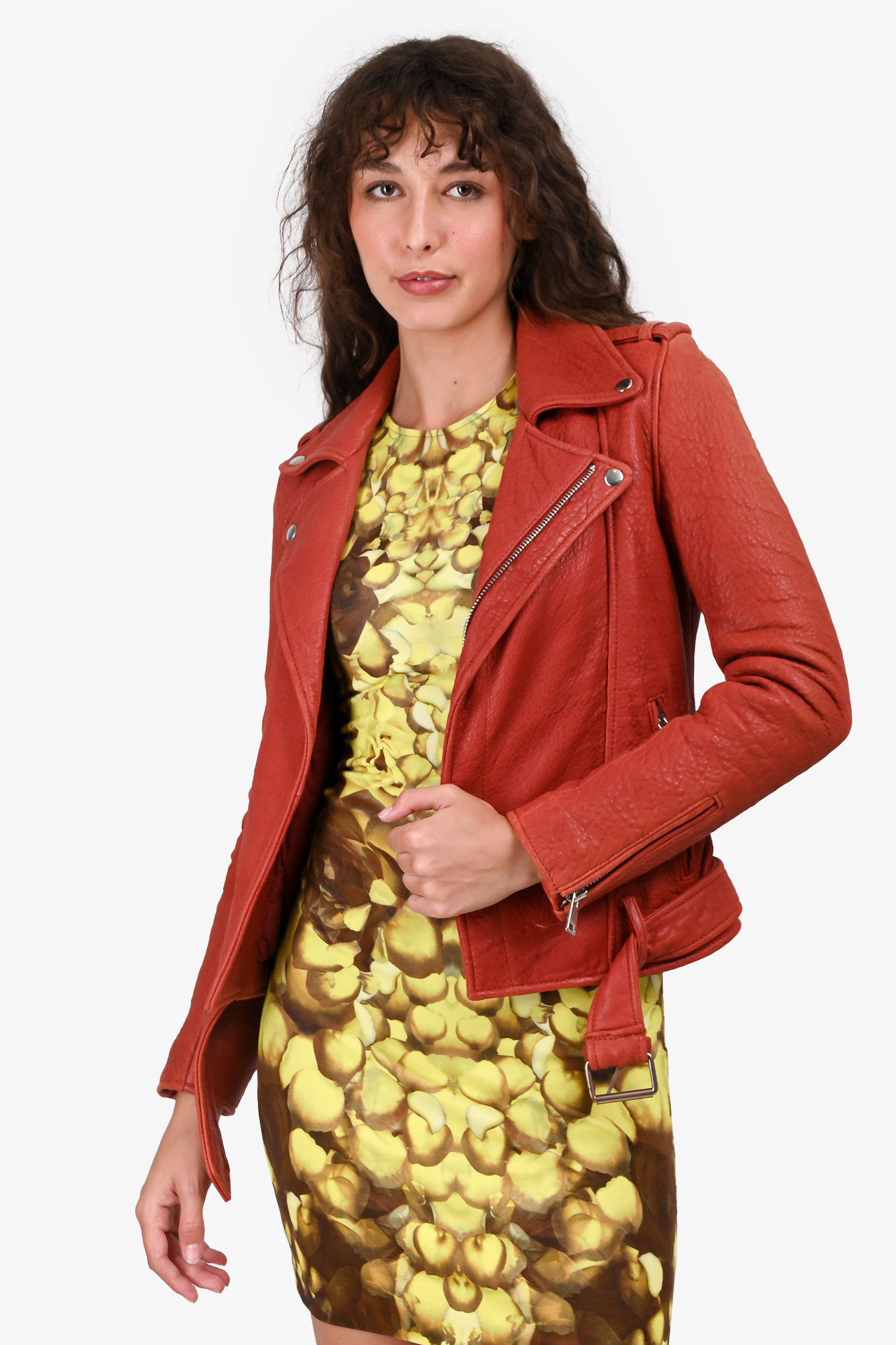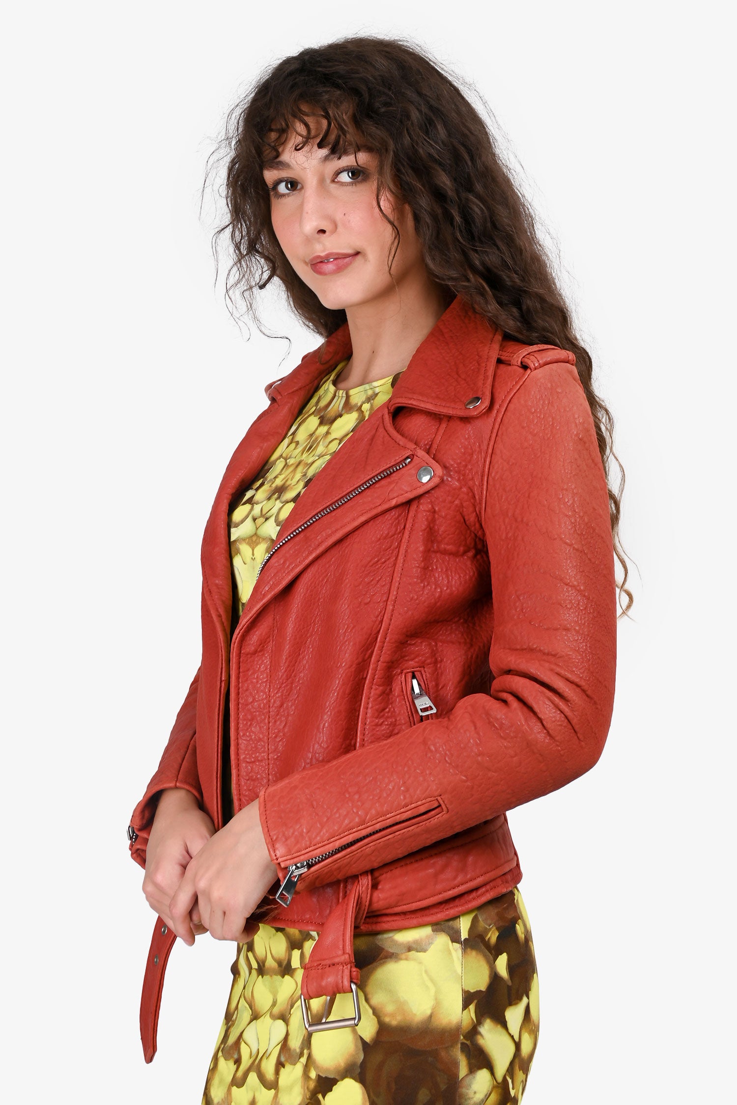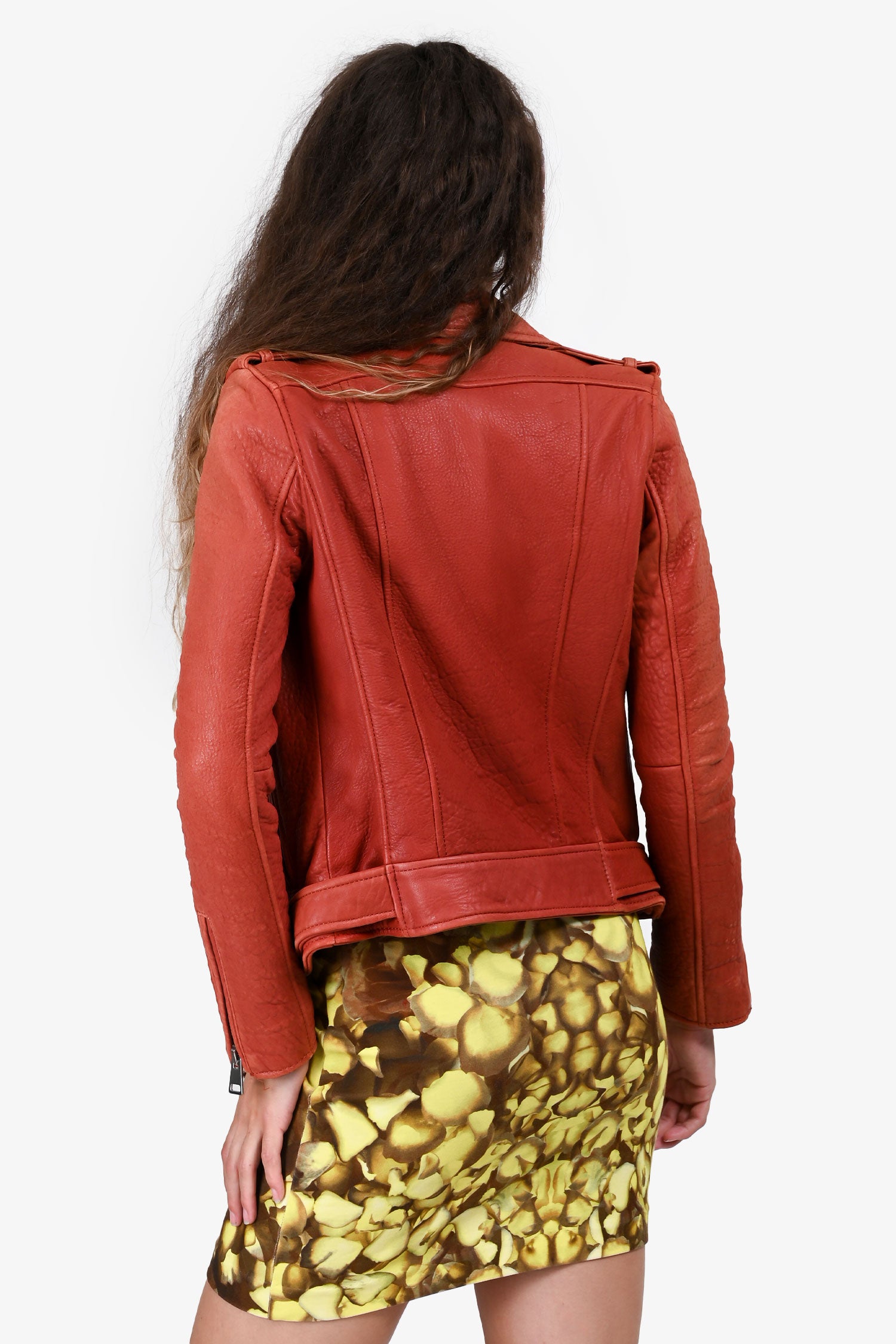 Refresh availabilityMaje Rust Orange Leather Moto Jacket With Belt. Notch lapel collar with snap buttons. Asymmetrical front zip closure. Long sleeves with zipped cuffs. Side zip pockets. Removable waist belt with buckle. Fully lined. Tonal stitching.