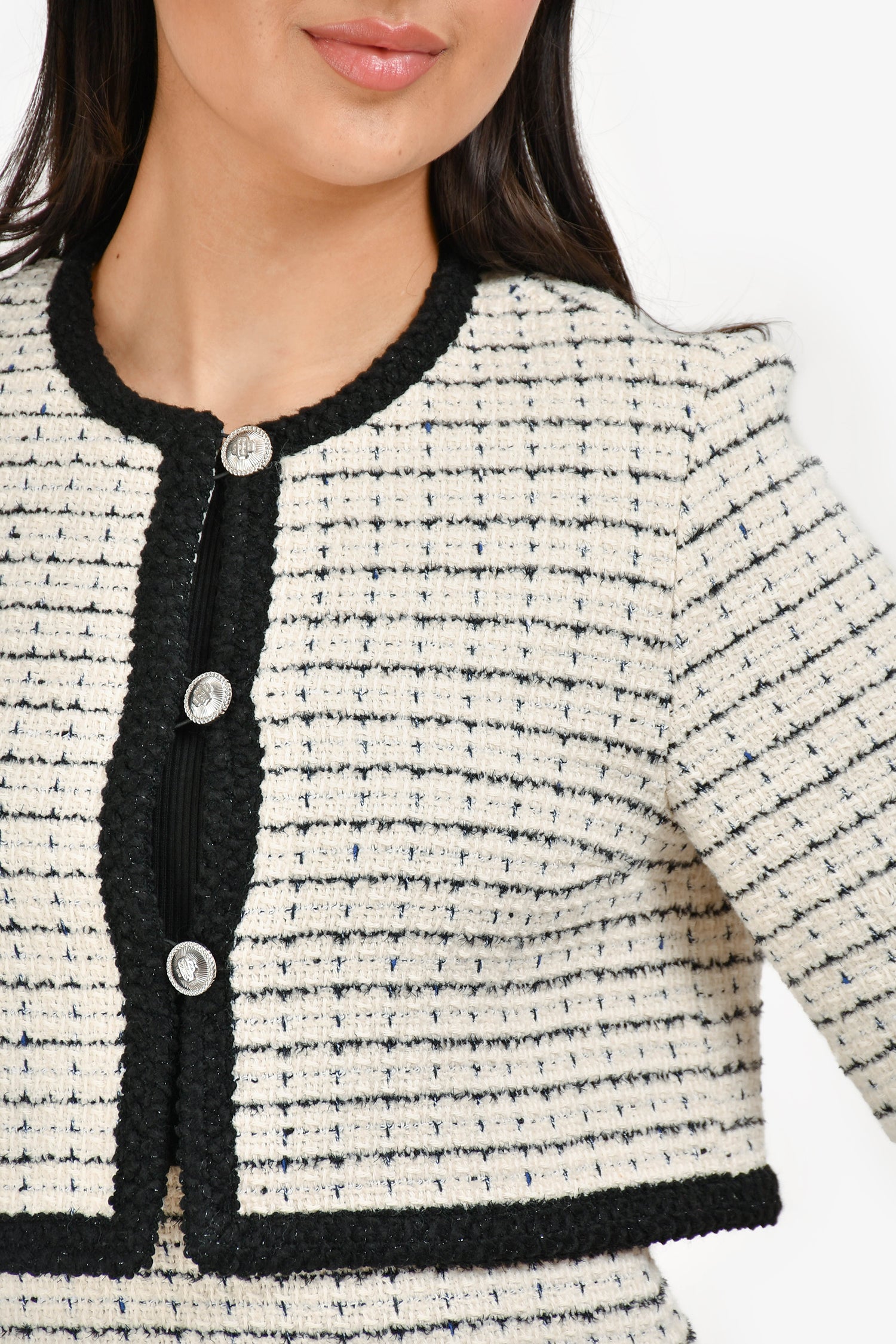 Refresh availabilityMaje White/Black Tweed Dress + Cardigan Set. Dres; round neckline. Two front slip pockets. Cardigan; front button-up closure. Silver-tone hardware. Unlined. Tonal stitching.