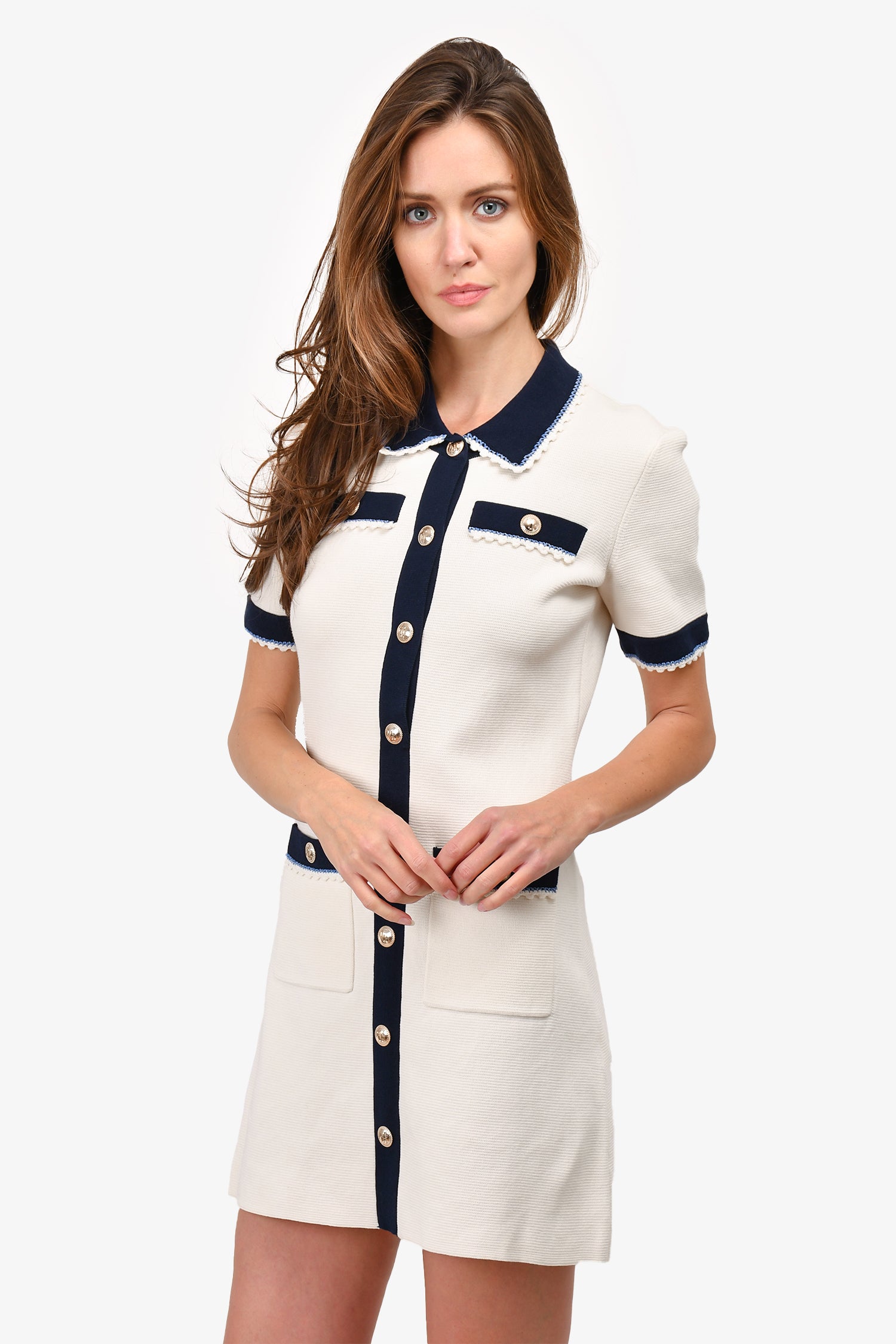 Refresh availabilityMaje White/Blue Cotton Collared Dress. Front snap-on button closure. Gold-tone hardware. Two front pockets. Tonal stitching.