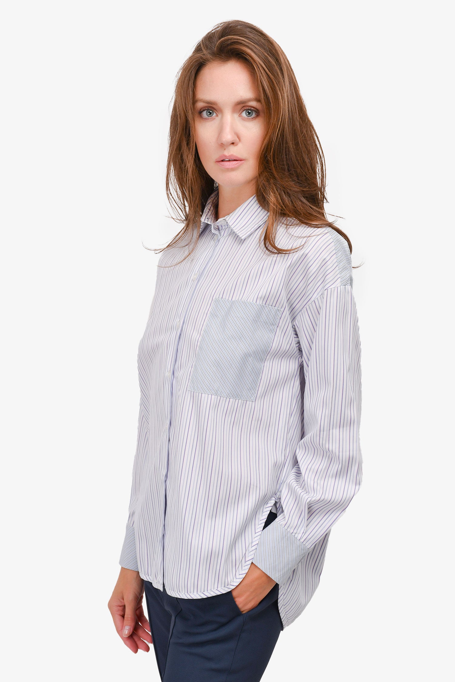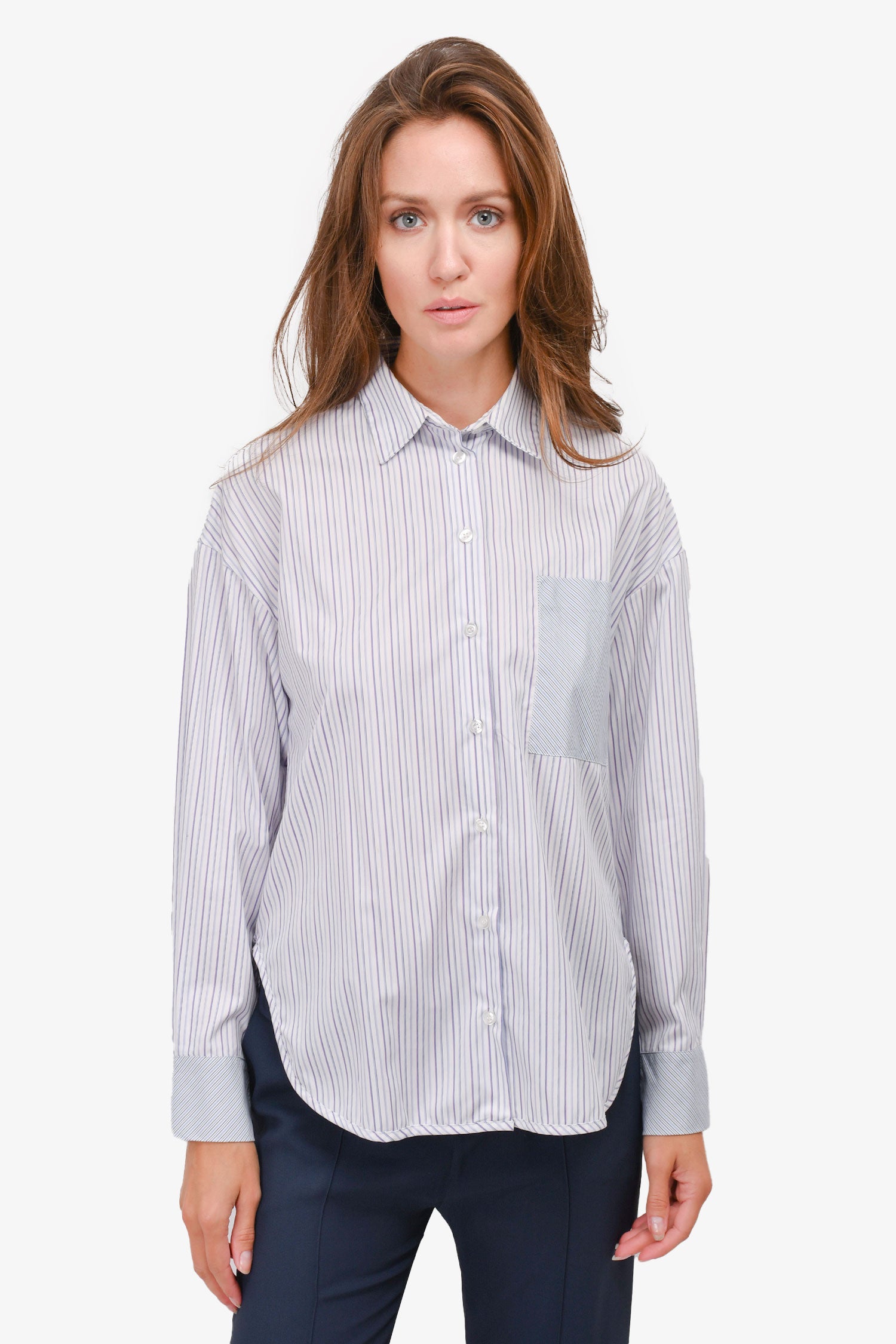 Refresh availabilityMaje White/Blue Striped Cotton Poplin Button-Up Shirt. White pearl button-up closure. One front breast pocket. Cuffed at the sleeves. Tonal stitching.