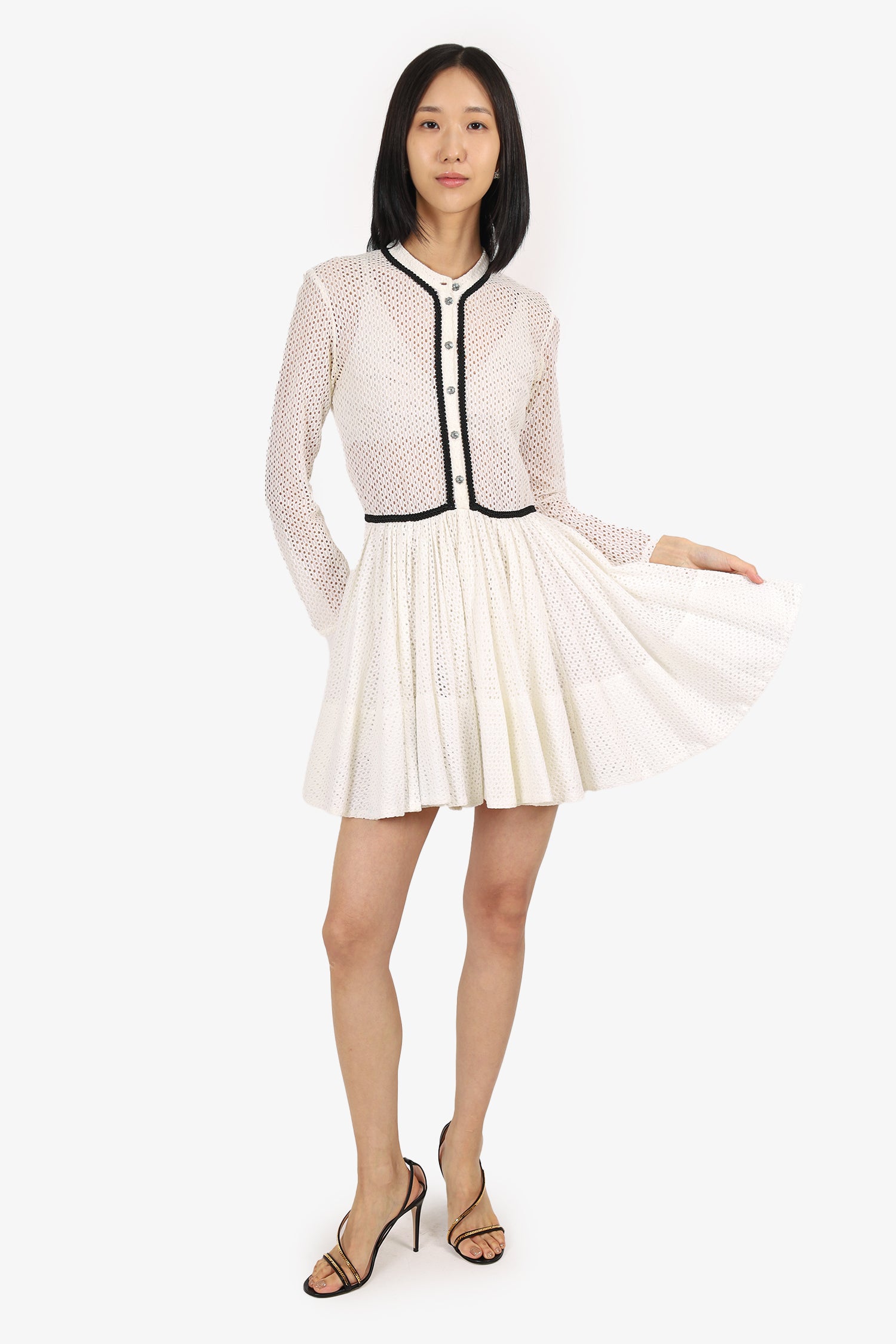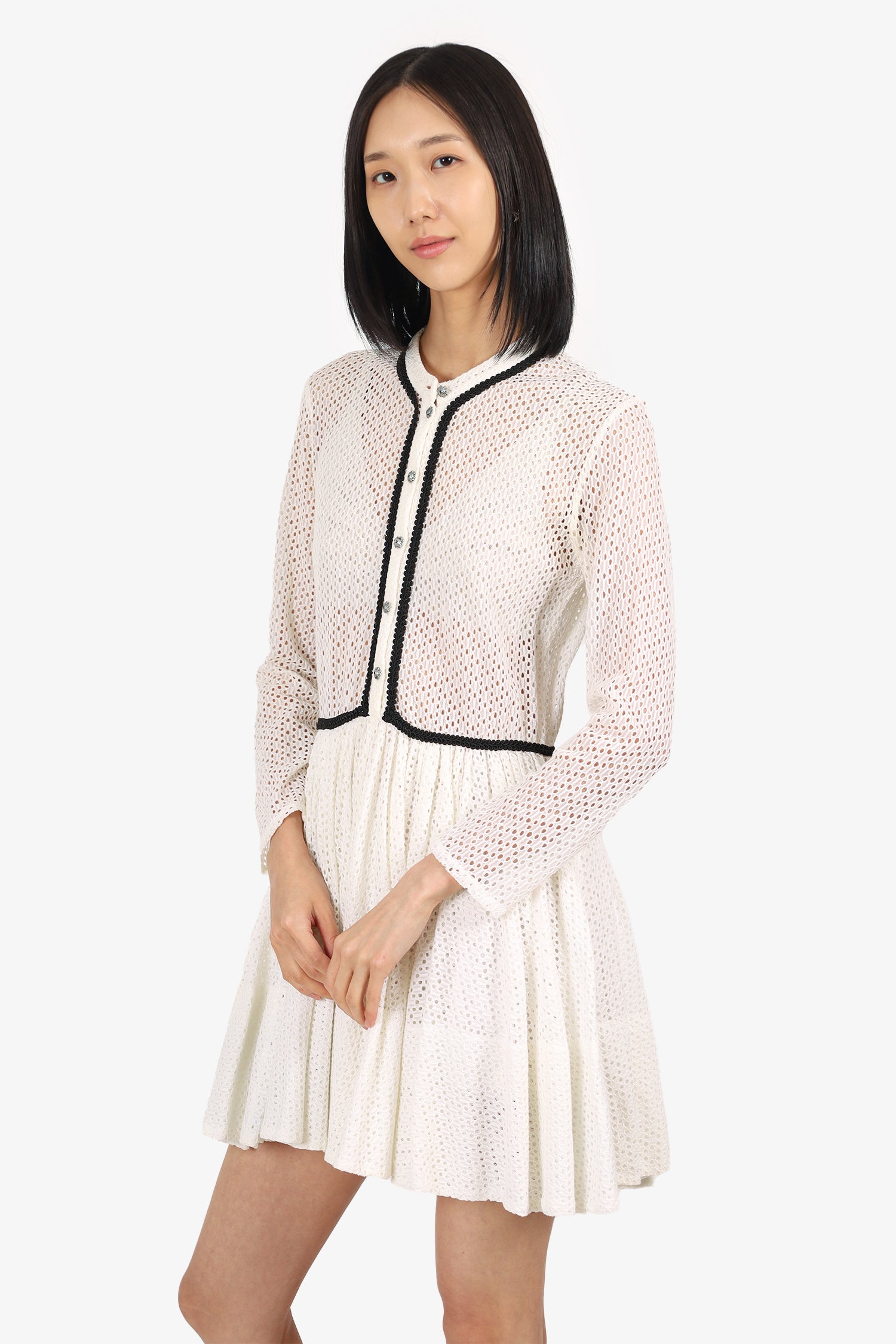 Refresh availabilityMaje White Eyelet Long Sleeve Mini Dress. Slip-on. Round neckline. Front button-up closure. Perforated body: Lined skirt. Silver-tone hardware. Tonal stitching.