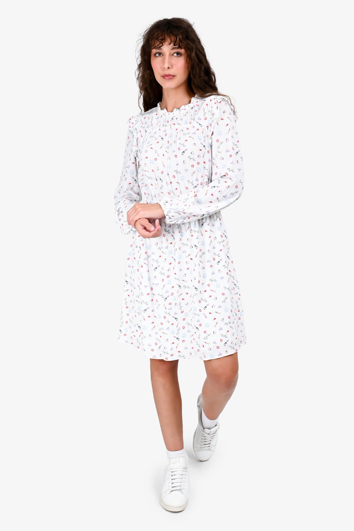 Refresh availabilityMaje White Graphic Printed Long Sleeves Mini Dress. Crew neckline. Long sleeves with elasticized cuffs. Fitted waist with flared skirt. Pull-on style. Unlined. Tonal stitching.